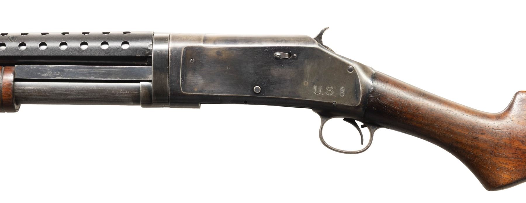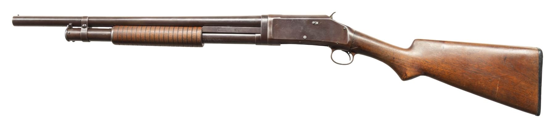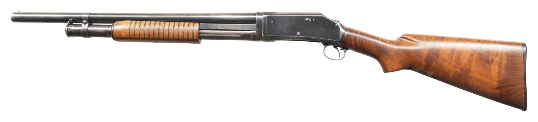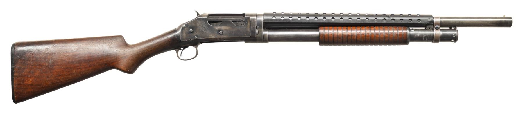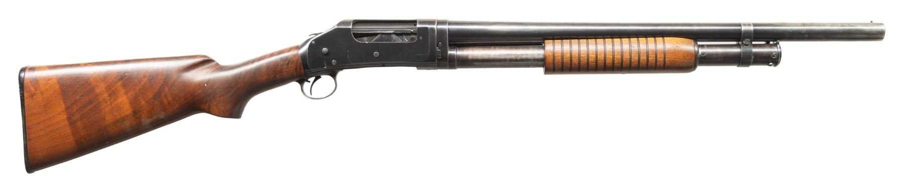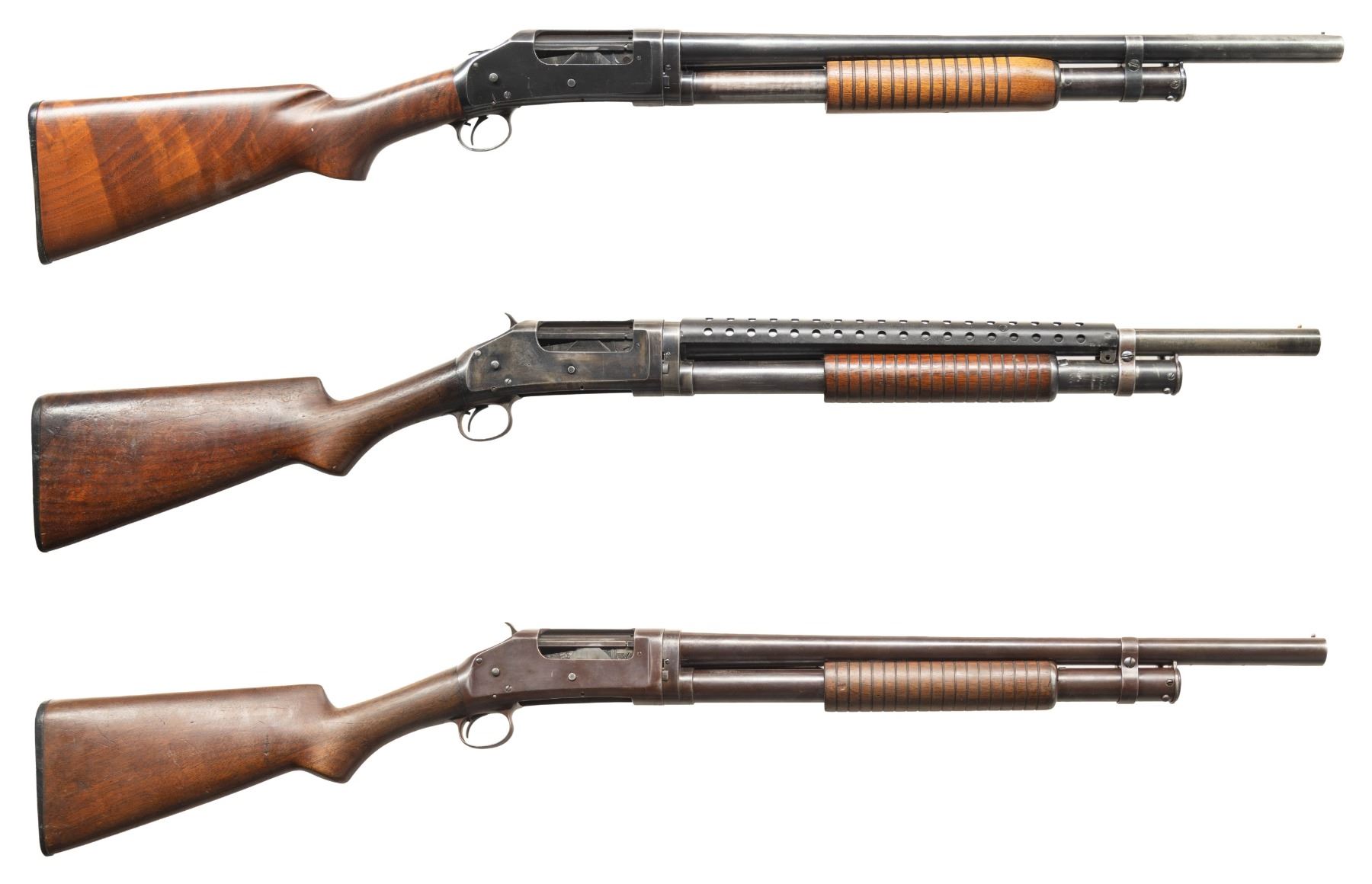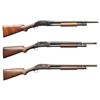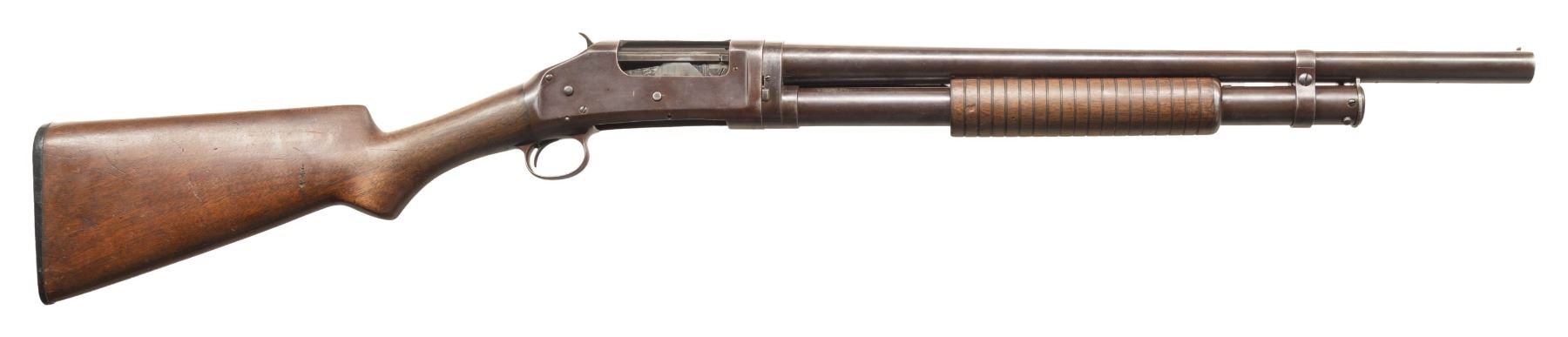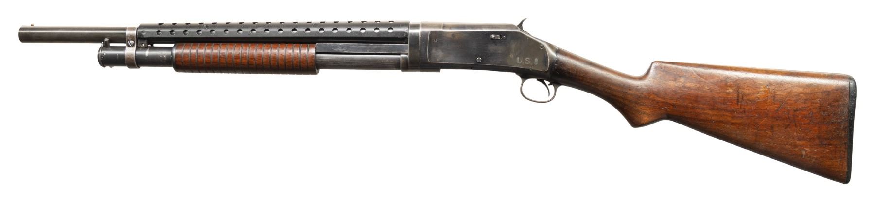 SHOTGUNS. 1) Cal. 12 GA, 2 3/4". S# E1019161. Bbl. 20 3/4". Model 97 pump action shotgun mfg. by Winchester circa. 1956. Left side of the bbl. is marked with the model and cal. designations above a "CYL" choke marking. Metal components exhibit a blue finish overall. Grooved wood pump with replacement and/or sanded and refinished pistol grip buttstock and checkered black synthetic Winchester buttplate. Aluminum bead front sight. Matching numbers are present on the receiver and receiver extension. CONDITION: metal components retain large amounts of their original factory blue finish, exhibiting areas of wear and thinning fading to gray and brown patinas, scattered superficial handling marks, as well as some scattered spots of light surface oxidation. Proper manual mechanics. Wood furniture shows scattered marks from handling and storage, but otherwise remains sound. Underside of pump exhibits several notable dings / impressions. (25-5458/MLW). 2) Cal. 12 GA. S# E886531. Bbl. 20 1/4". Assembled Model 1897 pump action shotgun in trench configuration mfg. by Winchester in 1942. Left side of the receiver is marked with a spuriously applied double stamped "U.S. (FLAMING ORDNANCE BOMB) proof. Metal components exhibit a blue finish overall. Grooved wood pump and plain wood pistol grip buttstock with checkered black hard rubber buttplate. Brass bead front sight. Bbl. is fitted with an aftermarket 4-row black enamel finished steel handguard. Receiver extension is mismatched. CONDITION: metal components retain fair amounts of their blue finish, exhibiting areas of wear and thinning fading to gray and brown patinas, striations from prior cleaning, as well as scattered spots / small patches of light to mild surface oxidation and pitting. Bbl. appears to have been relined, retaining a bright bore and exhibiting scattered spots of oxidation / light pitting, as well as a ring bulge. Proper manual mechanics. Wood furniture shows scattered marks, impressions, and flaking to the finish, but otherwise remains sound. (25-5462/MLW). 3) Cal. 12 GA. S# E495198. Bbl. 20 1/2". Model 1897 pump action shotgun mfg. by Winchester in 1912. Top of the bbl. is marked with Winchester's 2-line mfg. and patent information, followed by "12 GA.". Action slide is marked "MODEL 1897/ -WINCHESTER-". Metal components exhibit a reapplied blue finish overall. Grooved wood pump with plain pistol grip buttstock and checkered black hard rubber buttplate. Aluminum bead front sight. Matching numbers are present on the receiver and receiver extension. CONDITION: metal components retain fair amounts of their reapplied blue finish, exhibiting areas of wear and thinning fading to gray and brown patinas, with scattered patches and areas of light to mild pitting. Relatively bright bore, exhibiting consistent light pitting, with several patches of moderate pitting. Proper manual mechanics. Wood furniture shows scattered marks and scratches from handling and storage, with the buttstock exhibiting a small crack on the wrist, stemming from the trigger guard tang. (25-5502/MLW). ALL CURIO. $900-1,500.