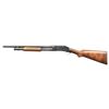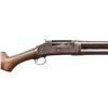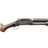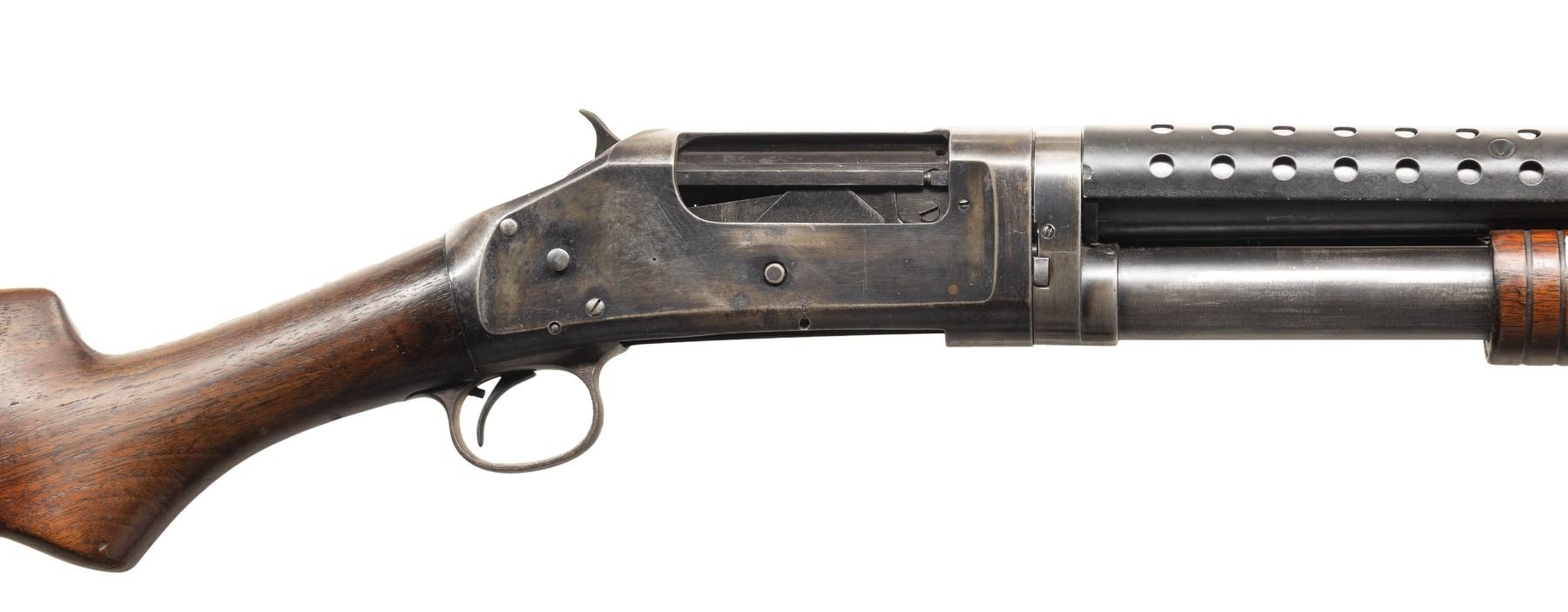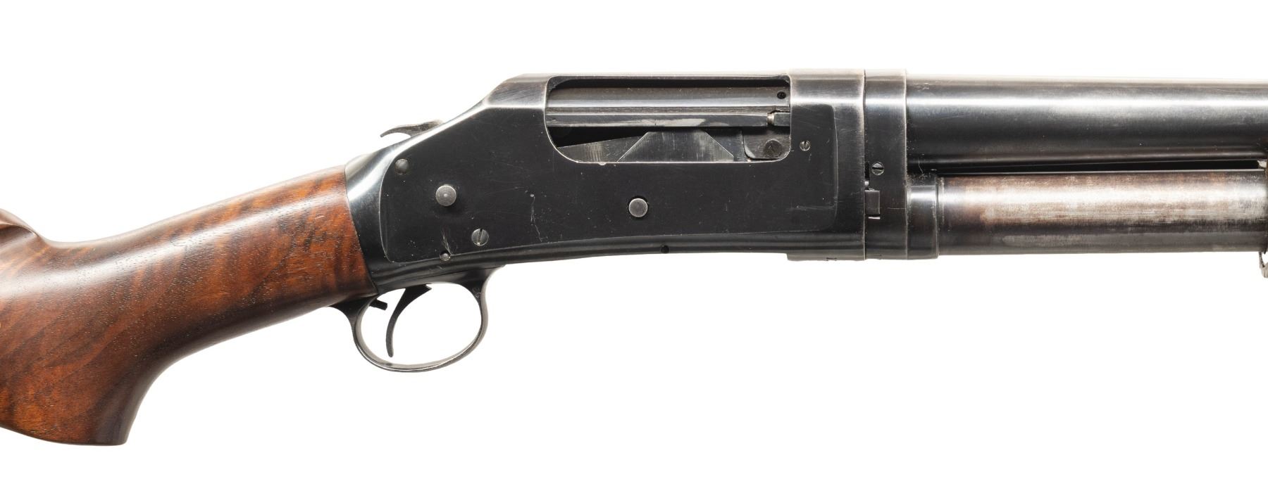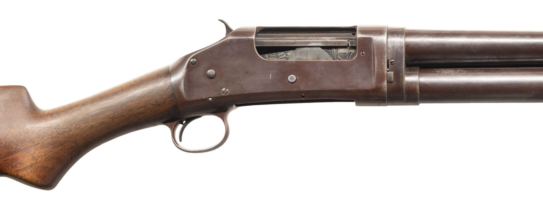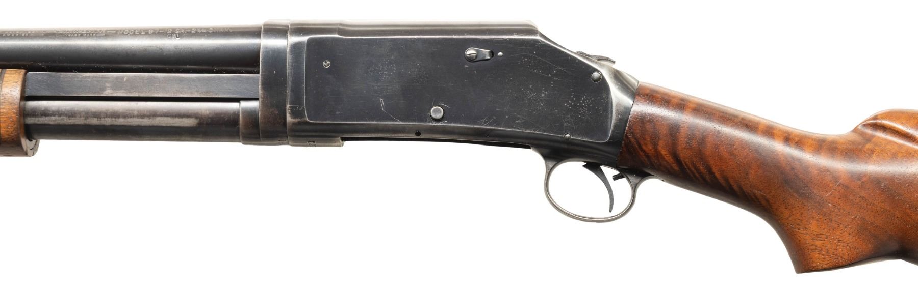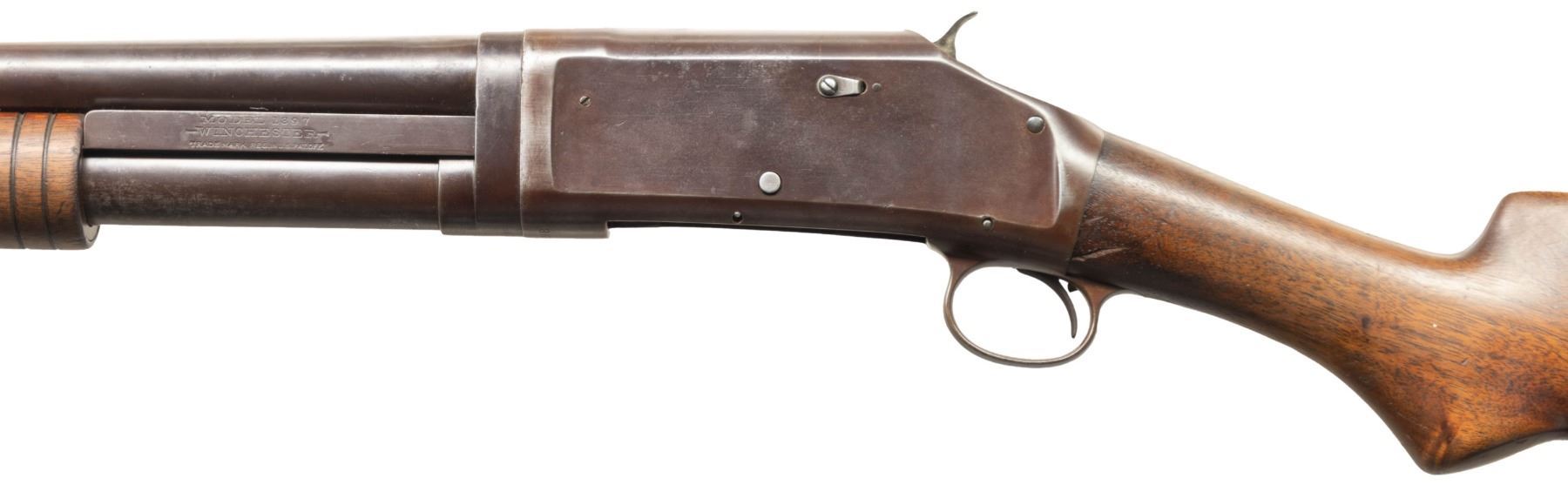 SHOTGUNS. 1) Cal. 12 GA, 2 3/4". S# E1019161. Bbl. 20 3/4". Model 97 pump action shotgun mfg. by Winchester circa. 1956. Left side of the bbl. is marked with the model and cal. designations above a "CYL" choke marking. Metal components exhibit a blue finish overall. Grooved wood pump with replacement and/or sanded and refinished pistol grip buttstock and checkered black synthetic Winchester buttplate. Aluminum bead front sight. Matching numbers are present on the receiver and receiver extension. CONDITION: metal components retain large amounts of their original factory blue finish, exhibiting areas of wear and thinning fading to gray and brown patinas, scattered superficial handling marks, as well as some scattered spots of light surface oxidation. Proper manual mechanics. Wood furniture shows scattered marks from handling and storage, but otherwise remains sound. Underside of pump exhibits several notable dings / impressions. (25-5458/MLW). 2) Cal. 12 GA. S# E886531. Bbl. 20 1/4". Assembled Model 1897 pump action shotgun in trench configuration mfg. by Winchester in 1942. Left side of the receiver is marked with a spuriously applied double stamped "U.S. (FLAMING ORDNANCE BOMB) proof. Metal components exhibit a blue finish overall. Grooved wood pump and plain wood pistol grip buttstock with checkered black hard rubber buttplate. Brass bead front sight. Bbl. is fitted with an aftermarket 4-row black enamel finished steel handguard. Receiver extension is mismatched. CONDITION: metal components retain fair amounts of their blue finish, exhibiting areas of wear and thinning fading to gray and brown patinas, striations from prior cleaning, as well as scattered spots / small patches of light to mild surface oxidation and pitting. Bbl. appears to have been relined, retaining a bright bore and exhibiting scattered spots of oxidation / light pitting, as well as a ring bulge. Proper manual mechanics. Wood furniture shows scattered marks, impressions, and flaking to the finish, but otherwise remains sound. (25-5462/MLW). 3) Cal. 12 GA. S# E495198. Bbl. 20 1/2". Model 1897 pump action shotgun mfg. by Winchester in 1912. Top of the bbl. is marked with Winchester's 2-line mfg. and patent information, followed by "12 GA.". Action slide is marked "MODEL 1897/ -WINCHESTER-". Metal components exhibit a reapplied blue finish overall. Grooved wood pump with plain pistol grip buttstock and checkered black hard rubber buttplate. Aluminum bead front sight. Matching numbers are present on the receiver and receiver extension. CONDITION: metal components retain fair amounts of their reapplied blue finish, exhibiting areas of wear and thinning fading to gray and brown patinas, with scattered patches and areas of light to mild pitting. Relatively bright bore, exhibiting consistent light pitting, with several patches of moderate pitting. Proper manual mechanics. Wood furniture shows scattered marks and scratches from handling and storage, with the buttstock exhibiting a small crack on the wrist, stemming from the trigger guard tang. (25-5502/MLW). ALL CURIO. $900-1,500.