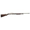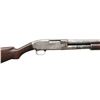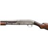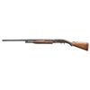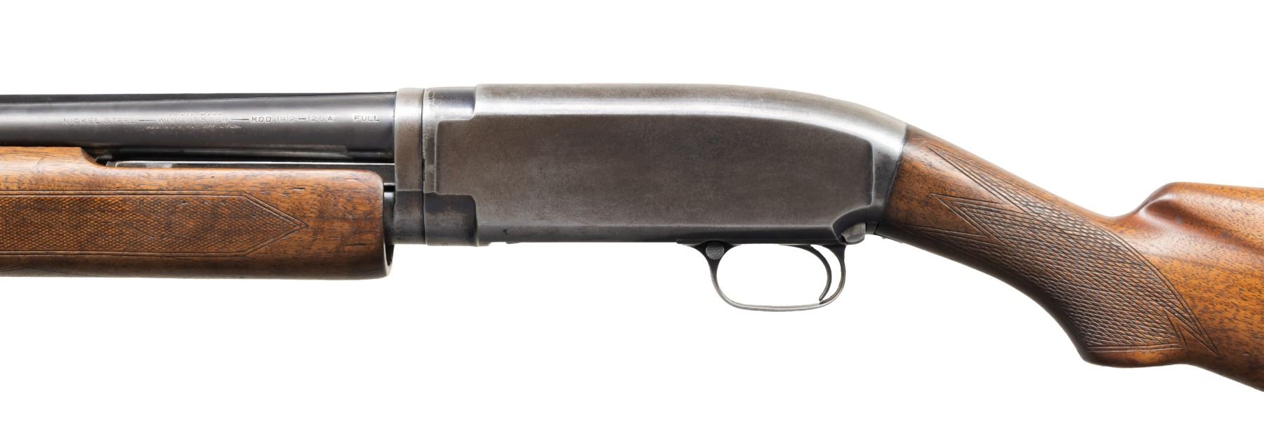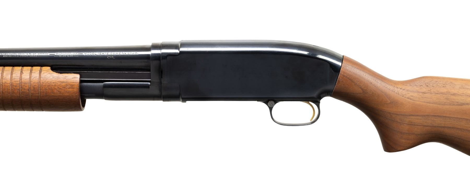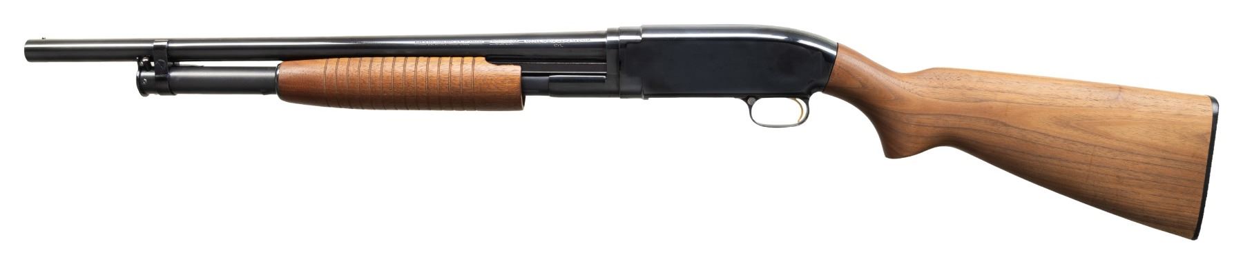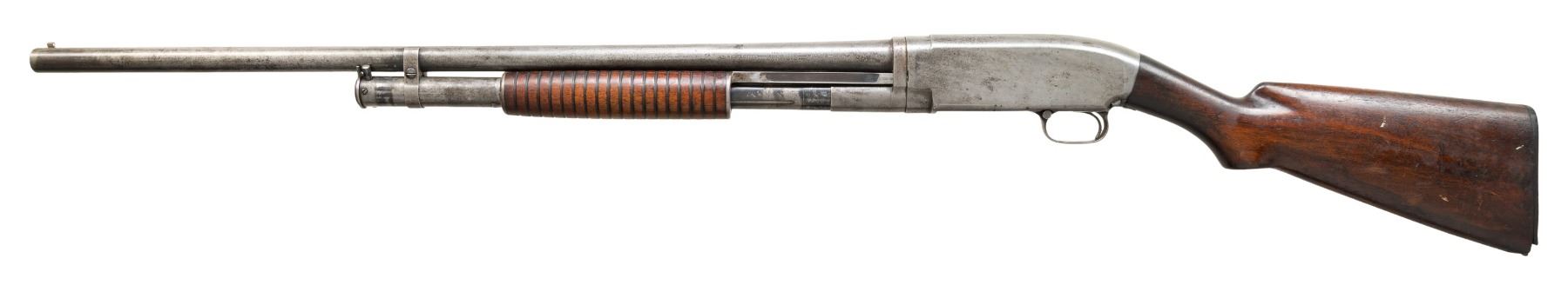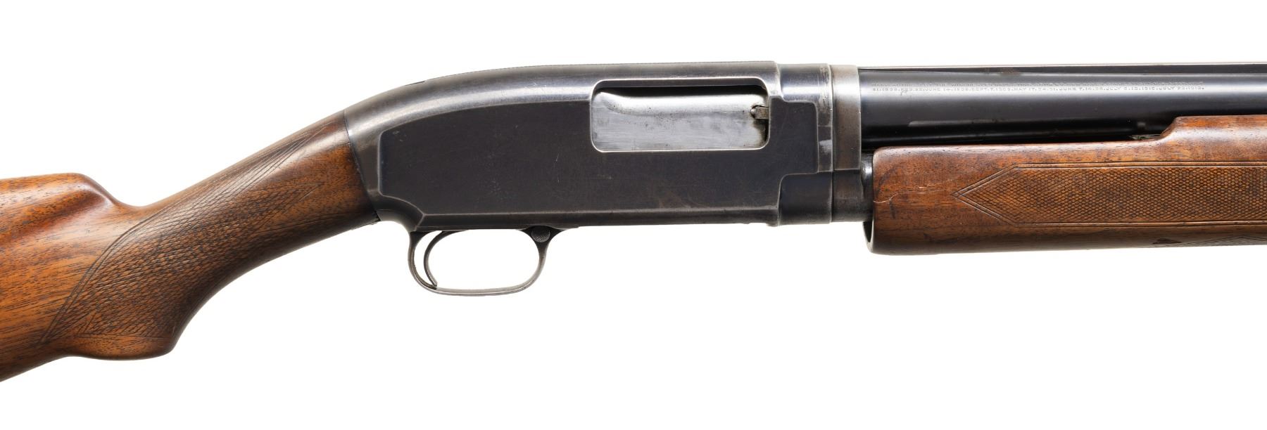 SHOTGUNS. 1) Cal. 12 GA. S# 117605. Bbl. 30". Model 12 pump action shotgun mfg. by Winchester in 1916. Left side of the bbl. is marked with the Winchester trademark logo, followed by the model and cal. designations, as well as a "FULL" choke marking, with Winchester mfg. and patent information marked on the right. Metal components exhibit a blue finish overall, save for on the bolt and carrier, which are polished in-the-white. Checkered wood forearm and checkered wood pistol grip buttstock with black synthetic spacer and Hawkins ventilated red rubber recoil pad. Solid matte rib. Natural white mid-bead. Bead front sight has broken off of its base and is absent. Matching numbers are present on the receiver and receiver extension. CONDITION: metal components retain fair to good amounts of their original factory blue finish, exhibiting wear and thinning fading to gray patina (predominately on the left and underside of the receiver, as well as on the bbl. extension), scattered superficial marks and scratches, as well as scattered spots and patches of light surface oxidation and pitting. Bright bore, exhibiting a few patches of light to mild pitting, as well as some hardened firing residue. Action does not function and requires gunsmith attention, with action slide cam appearing to catch on the bolt, resulting in the action freezing up. Wood furniture shows scattered marks and impressions from handling and storage, with the checkering on the forearm exhibiting smoothing. Right side of forearm exhibits a crack stemming from the rear, with 2 cracks present on the buttstock on the underside of the wrist, stemming from the trigger guard tang. (25-5351/MLW). 2) Cal. 12 GA, 2 3/4". S# 1685885. Bbl. 20 3/4". Model 12 pump action shotgun mfg. by Winchester in 1958. Left side of the bbl. is marked with the model and cal. designations above a "CYL" choke marking. Metal components exhibit a high polish reapplied blue finish finish overall, with the mag. tube exhibiting a dull reapplied blue finish. Bolt and carrier are polished and jeweled in-the-white. Trigger exhibits an apparent gold plated finish. Contemporary aftermarket grooved wood forearm and plain wood pistol grip buttstock with checkered black synthetic Winchester buttplate. Shortened bbl. is fitted with an aluminum bead front sight. Matching numbers are present on the receiver and receiver extension. CONDITION: metal components retain nearly all of their reapplied blue finish, exhibiting some scattered superficial handling marks, with scattered spots of light to mild pitting present beneath the bluing. Firing pin trips prior to the bolt fully locking closed and requires gunsmith attention to fire safely. Wood furniture is very good overall, save for a crack on the left side of wrist, stemming from the receiver. Buttplate shows scattered chips and a crack at the toe. (25-5470/MLW). 3) Cal. 12 GA. S# 238252. Bbl. 28". Model 12 pump action shotgun mfg. by Winchester in 1920. Left side of the bbl. is marked with the model and cal. designations, followed by a "FULL" choke marking, with Winchester's 2-line mfg. and patent information marked on the right. Sanded and refinished grooved wood pump and pistol grip buttstock with checkered brown hard rubber Winchester buttplate. Aftermarket bead front sight (bead broken off from base). Matching numbers are present on the receiver and receiver extension. CONDITION: metal components have been cleaned, exhibiting a gray patina, with scattered areas of light pitting and patches of mild pitting. Bore is bright, exhibiting scattered patches of light to mild surface oxidation. Proper manual mechanics. Wood furniture shows scattered marks and impressions from handling and storage, with the buttstock exhibiting a crack on either side of the wrist, stemming from the receiver, as well as a chip at the toe. Buttplate exhibits a large chip at the toe, with a crack stemming from the upper screw slot. (25-5472/MLW). ALL CURIO. $800-1,200.