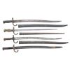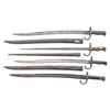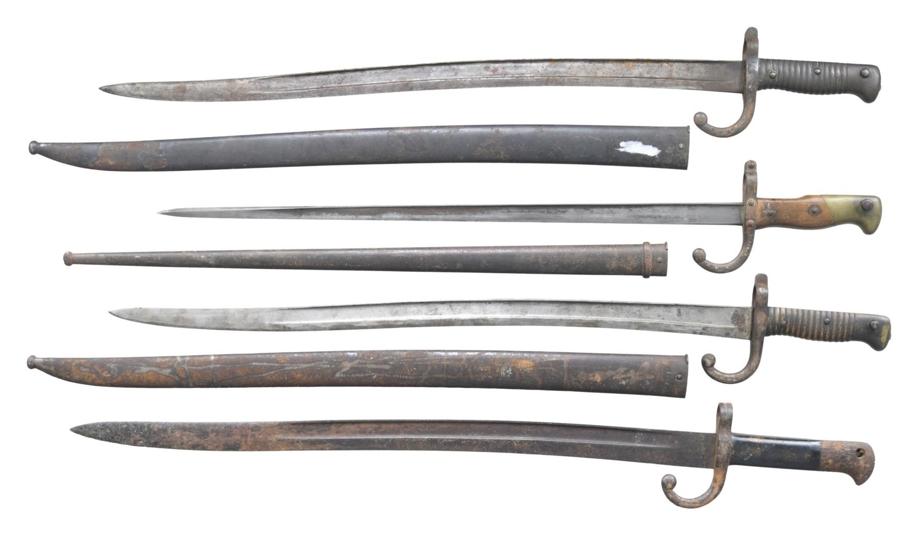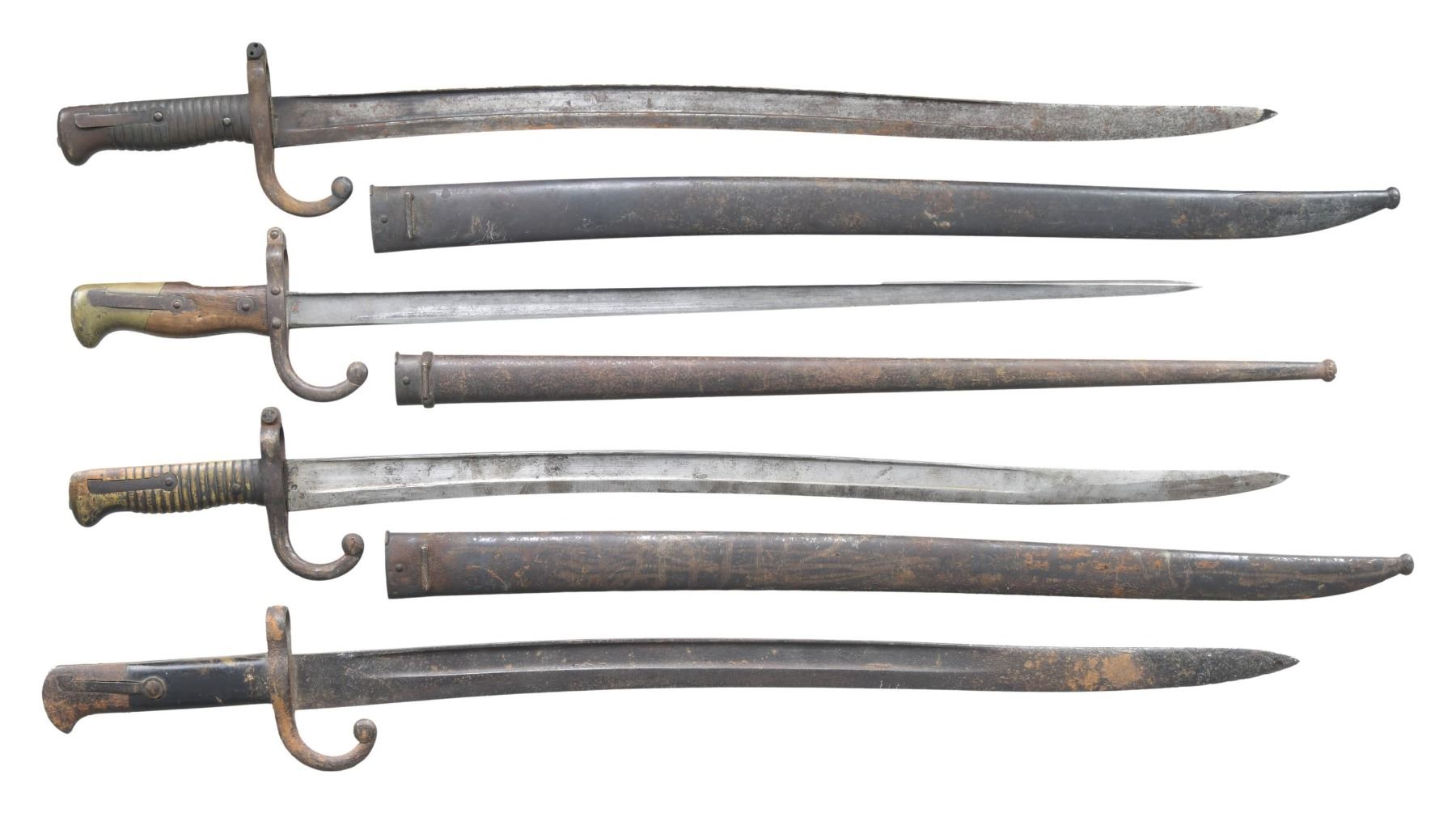 This lot consists of the following bayonets: 1) French 1866 bayonet. Mismatched scabbard present. CONDITION: metal of bayonet & scabbard are overall oxidized patina with faint markings & dings. 2) French 1874 Bayonet. Matching numbered scabbard present. CONDITION: wooden handles show some chips, dings & handling marks. Blade shows scattered oxidation & edge wear. Other metal parts of bayonet & scabbard show heavier oxidation & fading. 3) French 1866 bayonet. Matching numbered scabbard present. CONDITION: metal of bayonet & scabbard are overall oxidized patina with faint markings & dings. 4) Unknown Yataghan Bayonet. No scabbard or button present. CONDITION: handles show scattered staining & wear. Metal is an overall oxidized patina rendering any markings illegible. (02-24090/MJC). $200-400.