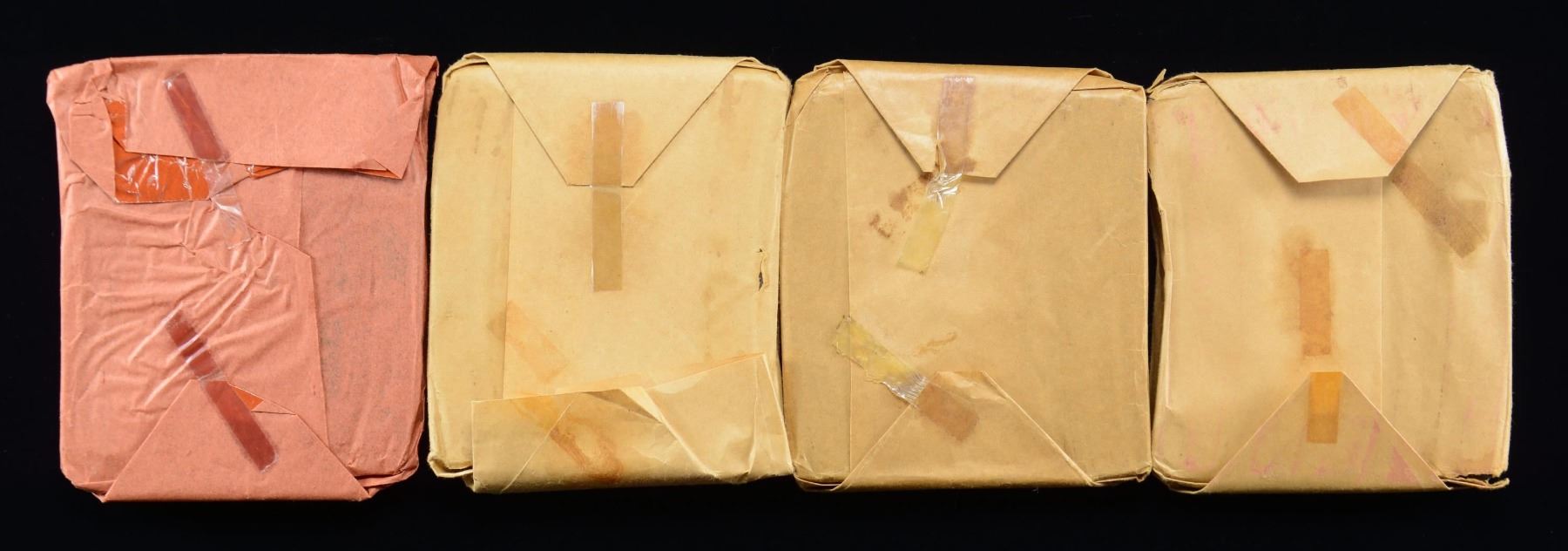 MP5 MAGAZINES. Lot of 4 packs of Heckler & Koch MP5 mags. 3 packs exhibit a brown paper wrapping, with 1 exhibiting a brown paper wrapped with a waxed interior surface. Each pack contains 5 mags. CONDITION: excellent, with paper wrappings exhibiting some wear and tear, with a few tears and holes present overall. PROVENANCE: Lifelong Collection of Terrence McCarty. (02-21799-8/MLW). $800-1,400.