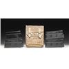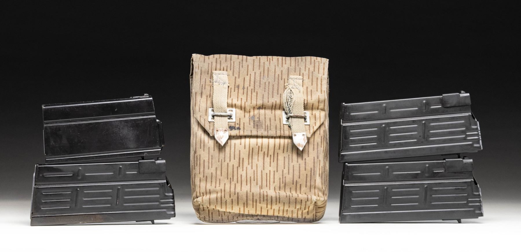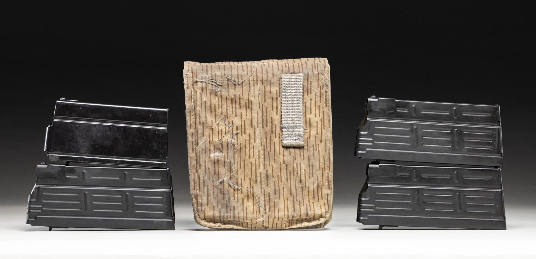 Lot of 4 Galil .7.62x51mm NATO mags., including: 1) x3 IMI 25-rd. Galil mags. Steel construction with dull blue finish. Mags. are dated "5-86", "1-87", and "8-93". x1 mag. exhibits an area of lacquer on the left side. 2) x1 KMT Co. 20-rd. Galil mag. steel construction with black enamel type finish. Spine is marked with KMT Co.'s logo. 3) x1 East German Strichtarn camouflage 4-cell AK mag. pouch. CONDITION: mags. are very good to excellent, with some superficial handling marks. KMT mag. shows some small areas of flaking. Pouch shows areas of discoloration, some tattering to stitching, as well as some oxidation to metal fittings. Front right closure flap strap shows tattering, with the left belt loop on the rear being absent. (02-25484/MLW). NON-GUN. $400-600.