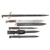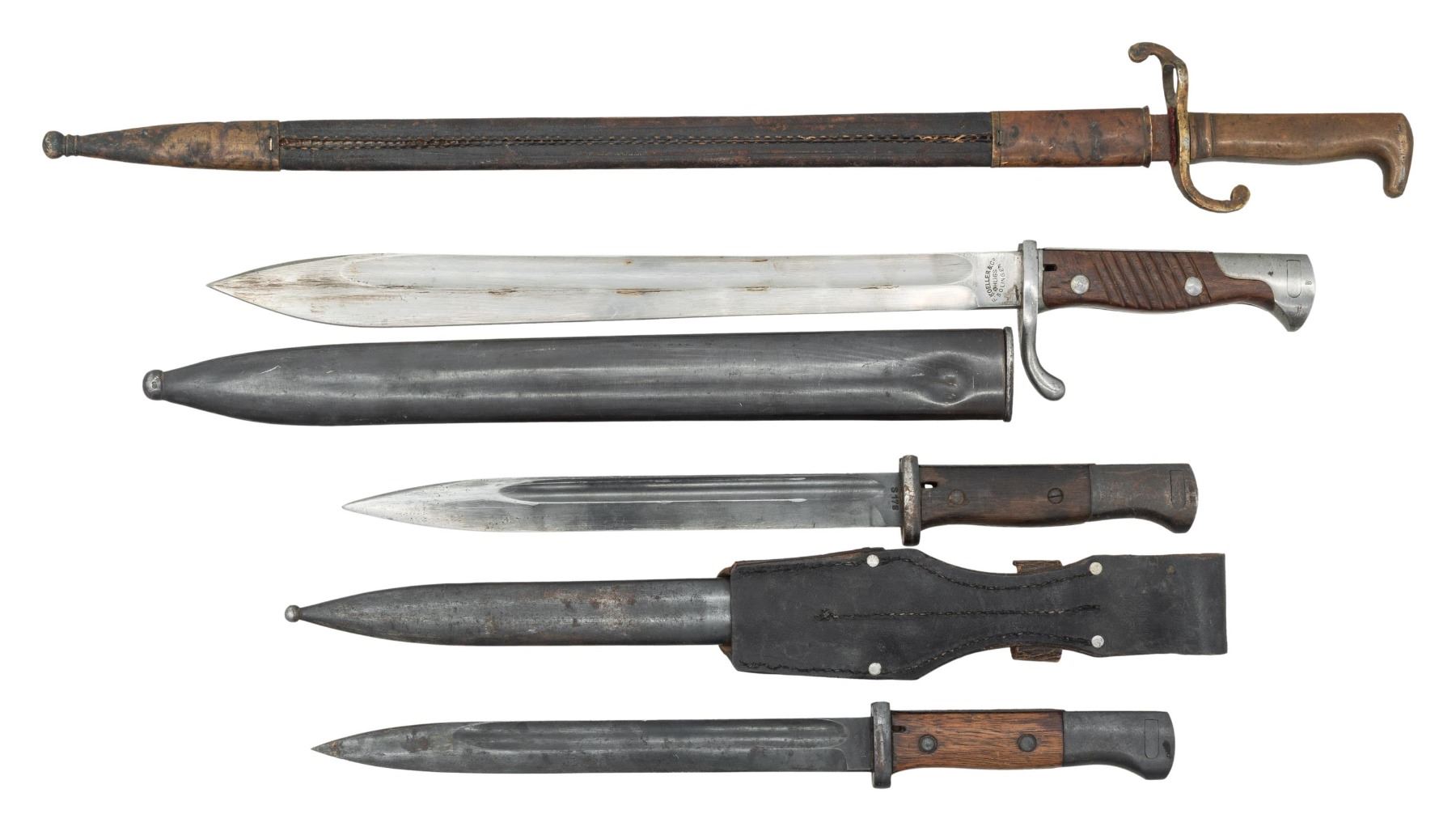 3) WW1 84/98 Bayonet. Made by Odeon in Berlin. Blued 1917 dated blade. No scabbard present. CONDITION: metal parts retain a high degree of bluing with scattered oxidation & some edge wear. Wooden handles show some dings & handling marks.