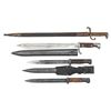 4) 84/98 Bayonet. 1937 dated S178 bayonet. Scabbard present but no discernable number & leather frog. CONDITION: blade retains 70% blue with notable tip wear, some oxidation & fine pitting. Other metal parts are a dull gray patina with oxidation. Wooden handles show staining, finish loss & handling marks. Scabbard is a dull oxidized patina. Frog has a broken button & shows scattered flaking, staining & age wear. (02-25783/MJC). $400-600 for lot.