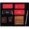Lot of 4 pieces of Weatherby memorabilia, including: 1) Gold colored pen mfg. by The Quill Co. Interior of pen is marked "THE QUILL CO. PROVIDENCE, R.I./ DURATONE 95 MEDIUM K4/ MADE IN U.S.A." Pen is accompanied by an angled wood block marked with the Weatherby trademark logo above "LAZERMARK" and a silhouette of a Weatherby rifle. 2) Apparent gold plated tie clasp of a Weatherby bolt action rifle. Clasp is retained in a black leatherette wrapped metal case, featuring the Weatherby trademark logo on the interior and exterior of the lid. 3) Brass Weatherby Centurion shotgun tie clasp. Clasp is retained in a red felt wrapped box, featuring the Weatherby trademark logo on the lid. Interior is marked with the Weatherby trademark logo and "CENTURION". 4) Brass cuff link of a Weatherby .224 Magnum cartridge base with brass chain. Cuff link is housed within a black felt wrapped box marked "Handcrafted/ by/ Burl" on the interior of the lid. CONDITION: items are good, with scattered spots of age related discoloration. Cases show light wear overall, with some separation on the interiors. PROVENANCE: Norman Olliff Estate. (02-25648/MLW). NON-GUN. $25-50.
