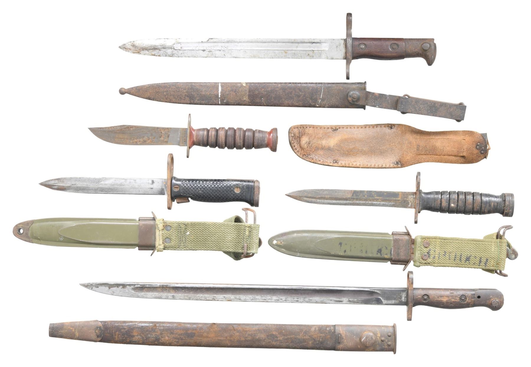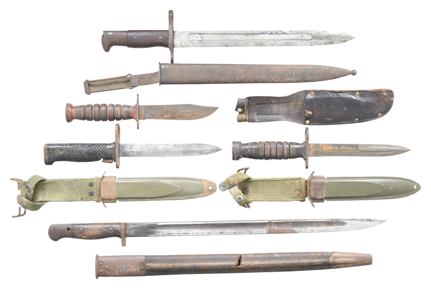 This lot consists of the following bayonets & knives: 1) US M6 bayonet. Crossguard has Milpar marking. Blade has been thinned & altered. M8A1 scabbard made by PWH with canvas frog. CONDITION: grip panels show dings & scattered staining. Blade is a silvery-gray color with scattered oxidation & scratches. Other metal parts of bayonet & scabbard are an oxidized patina. Scabbard shows some scuffing, a notable crack at bottom & staining. 2) US 1892 Bayonet. 1901 dated Springfield M1892 bayonet with scabbard. CONDITION: handles show a couple dings & some handling marks. Blade remains partially bright with scattered oxidation & dried grease. Other metal parts of bayonet & scabbard are an oxidized patina with some white paint remnants. 3) US M4 Bayonet. Leather handled M4 bayonet with Utica marked crossguard. M8 scabbard made by BM Co. & canvas frog present. CONDITION: handles show some cracking, flaking & staining. Blade shows scattered oxidation & edge wear. Other metal bayonet & scabbard parts are a gray oxidized patina. Scabbard shows scuffing & handling wear. 4) Schrade Walden Pilot Survival Knife. Scabbard present. CONDITION; leather handles show scattered flaking & staining. Metal parts of knife are mostly a gray oxidized patina. Scabbard shows scattered flaking & crazing. 5) Australian P1907 Bayonet. Blade has Lithgow markings with 1942 date. Handle has "AUSTRALIA" marking. Leather scabbard present. CONDITION: grip panels show scattered dings, dents & flaking. Blade shows heavy thinning & some scattered oxidation. Other metal parts of bayonet & scabbard are a gray oxidized patina. Scabbard shows scattered flaking & staining. (02-24087/MJC). $200-400.