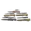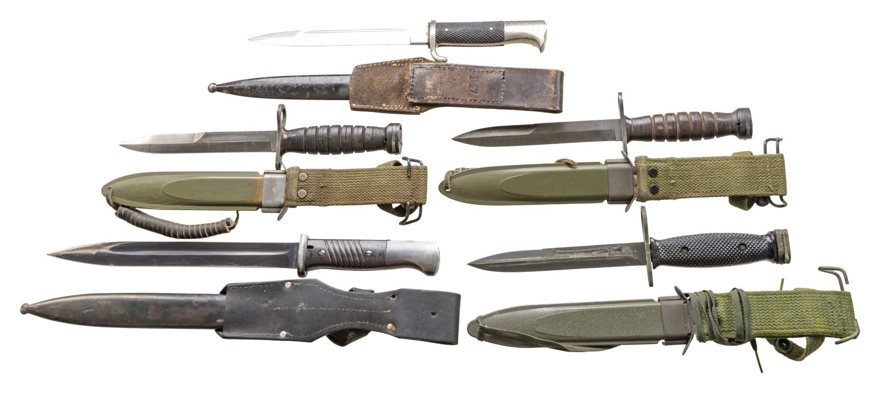 This lot consists of the following: 1) Leather handled M4 Bayonet. Imperial marked crossguard. BMCo. M8A1 scabbard & canvas frog present. CONDITION: very good overall with scattered edge & age wear. 2) Leather handled M4 Bayonet. Imperial marked crossguard. BMCo. M8A1 scabbard & canvas frog present. CONDITION: good with scattered thinning, edge wear & leather wear. 3) Colt M16 Bayonet. Blade has Colt logo & Hartford address. US M8A1 scabbard without maker's marking & canvas frog. CONDITION: metal shows scattered edge wear & light oxidation. Metal parts of frog show heavier oxidation. Other parts very good. 4) German WKC NCO Dress Bayonet. WKC marked blade & knight logo. Scabbard present & leather scabbard marked "P47" on rear. CONDITION: metal shows scattered flaking & oxidation. Handles show staining & handling marks. Frog stitching is coming undone & shows scattered crazing, flaking & other wear. Scabbard shows scattered flaking paint & oxidation. 5) German 84/98 Bayonet. 1940 date made by EUF Horster. Matching scabbard & leather frog present. CONDITION: good with some scattered oxidation, light scratches, staining & finish wear. Frog shows scattered crazing, & scuffing. Scabbard shows scattered fading to gray, oxidation & edge wear. PROVENANCE: Estate Collection of John "Jack" Dhooghe. (02-25560/MJC). $200-400 for lot.