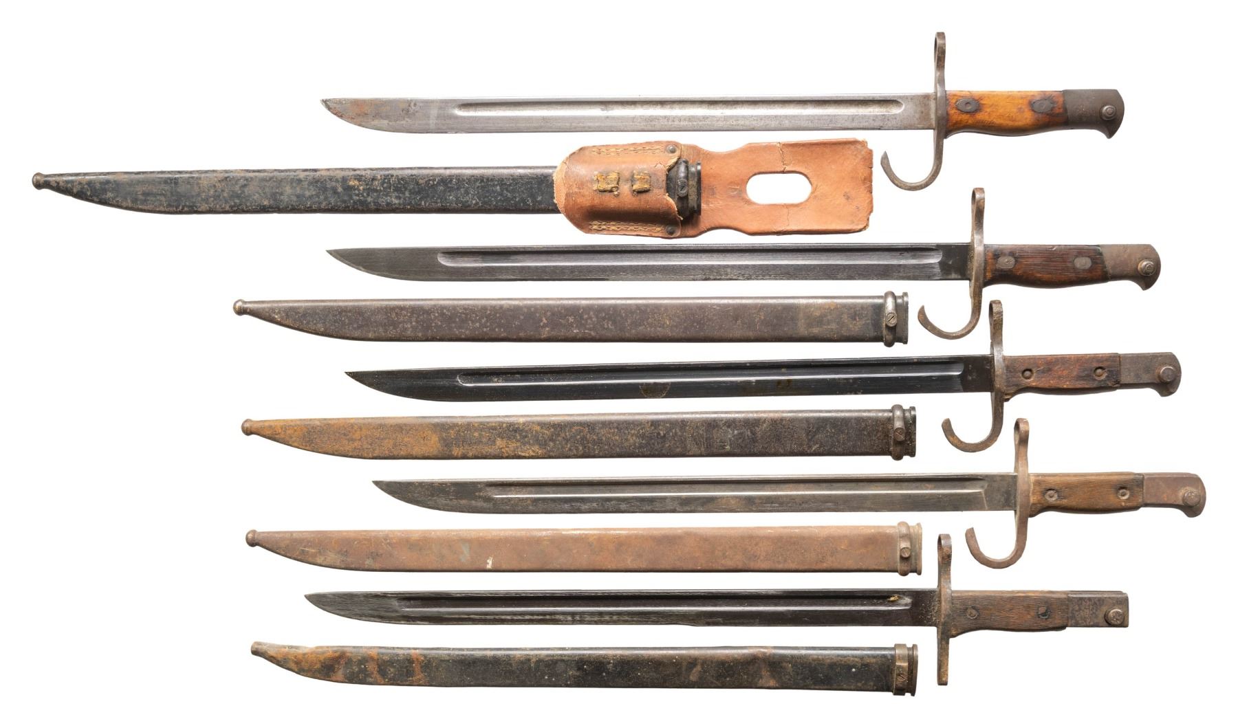 3) Nagoya T30 Bayonet. T30 Bayonet. Blued blade has Nagoya marking. Hooked crossguard. Scabbard present. CONDITION: Blade very good with edge wear & some light oxidation. Other metal parts are dull gray patina with oxidation throughout including scabbard. Handles show dings, staining & age related wear.