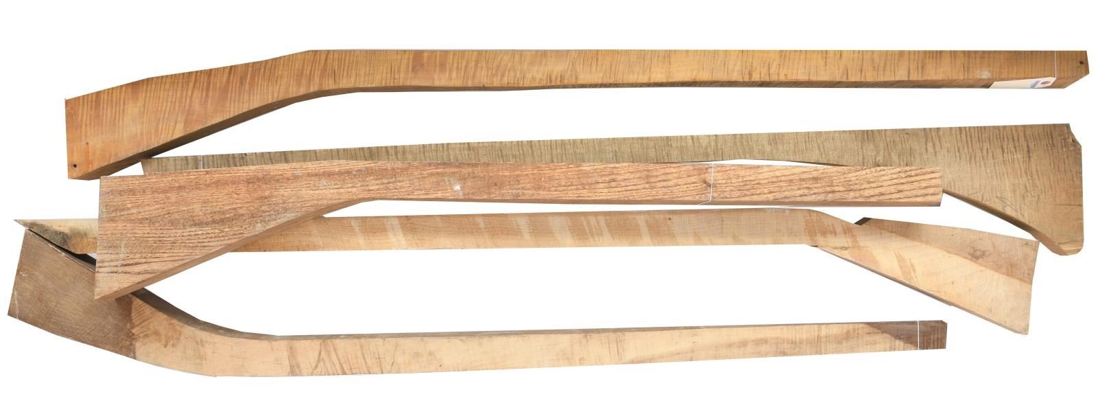 Lot consists of: 1) Unmarked Kentucky Rifle stock wood blank measuring 60 5/8" in length and 1 3/4" in thickness. 2) Unmarked Kentucky Rifle stock wood blank measuring 65 7/8" in length and 1 7/8" in thickness. 3) Unmarked Kentucky Rifle wood blank measuring 65 3/8" in length and 2 1/4" in thickness. 4) Unmarked Kentucky Rifle wood blank measuring 60 3/4" in length and 1 7/8" in thickness. 5) Unmarked Kentucky Rifle wood blank measuring 51 3/8" in length and 2 1/8" in thickness. CONDITION: good with some mild marks from storage and handling. Please review photos for details regarding wood species and overall condition. (02-19923-6/MLW). $300-500.