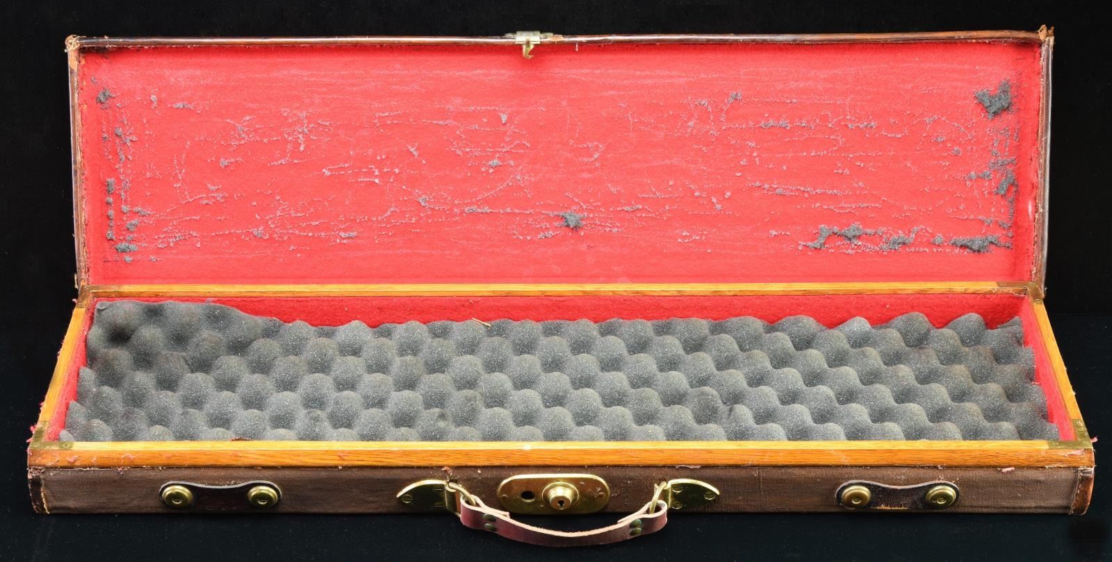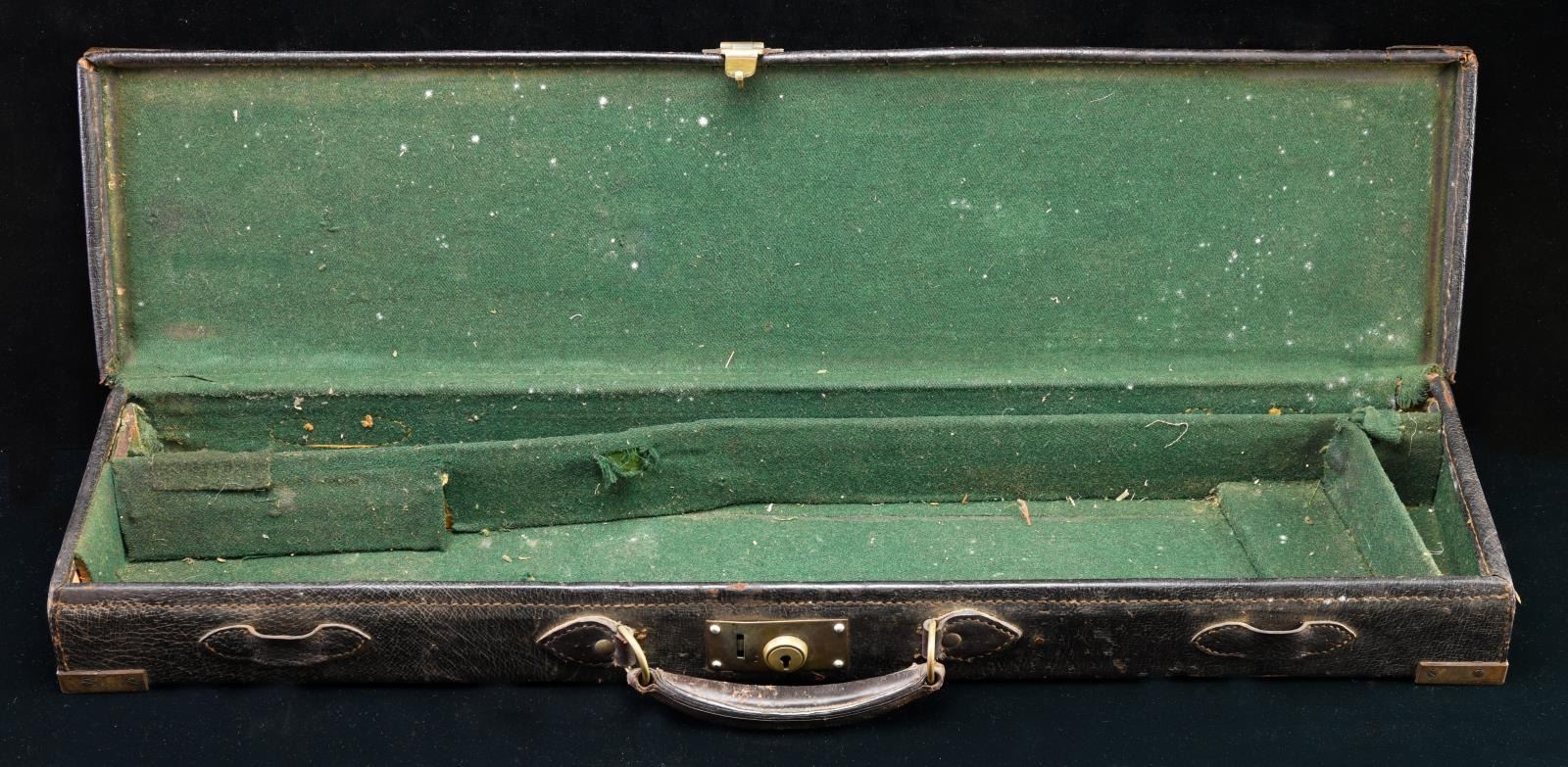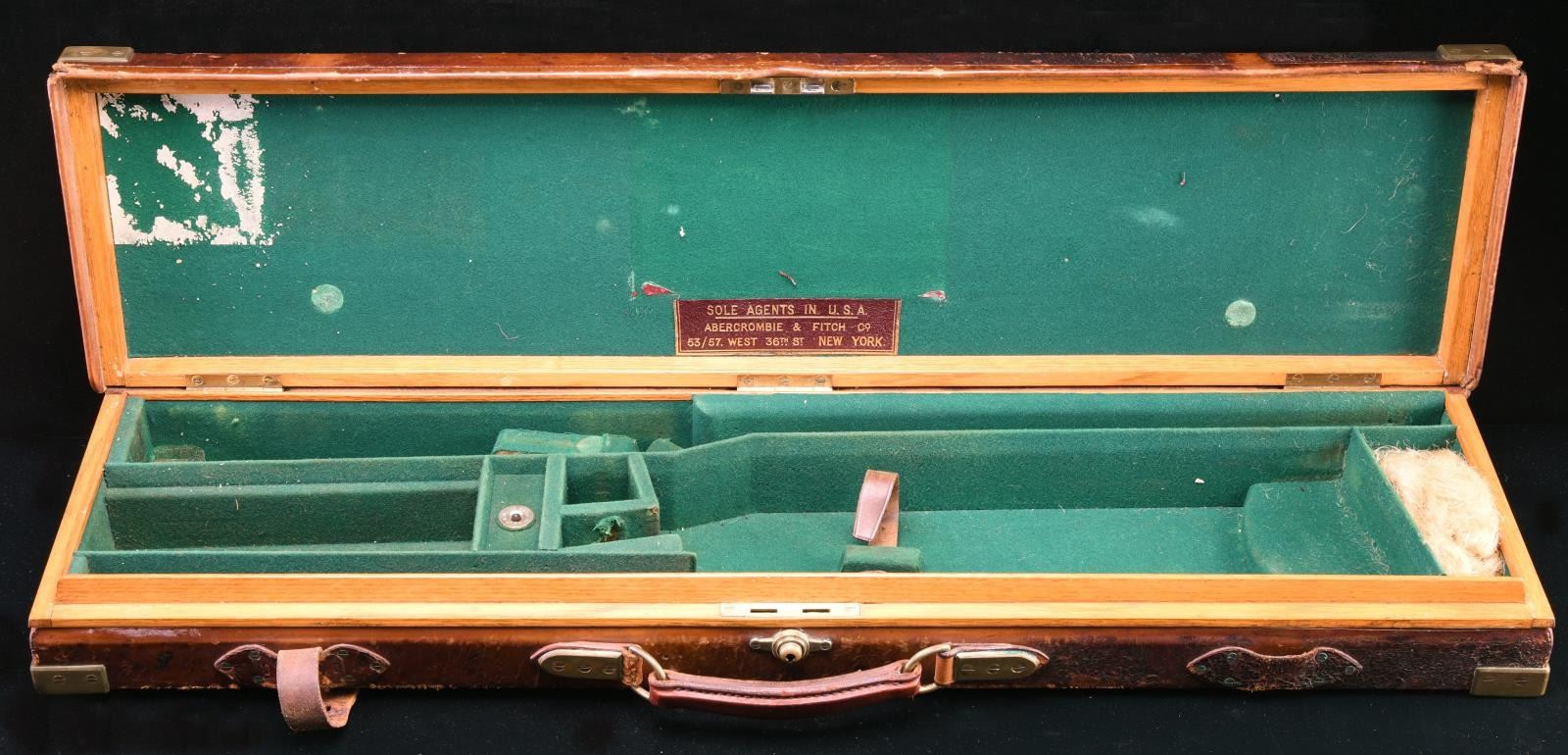 This lot consists of the following long gun cases: 1) Abercrombie & Fitch Shotgun Case. Brown leather case w/ green interior. Exterior of case is unmarked & interior has Abercrombie marking. Case measures 35" in length, 9" in width & 3 1/4" in height. CONDITION: one of the exterior straps is missing. Case otherwise shows overall notable crazing, flaking, some cracking & scattered staining. 2) George Gibbs Case. Green George Gibbs case w/ name tag that reads "W. PEARCE". Interior has foam lining w/ most of top lid foam missing. Case measures 32 1/2" in length, 8 1/2" in width & 3" in height. CONDITION: both exterior straps are missing. Leather parts of the case show scattered flaking w/ areas missing, balance of case shows notable staining & soiling. 3) Black Leather Shotgun Case. Exterior has Union Castle & other railroad stickers w/ name "DR. D. HENNESSY". End of lid has some white paint markings. Green velvet interior. Case measures 32" in length, 7 3/4" in width & 3" in height. CONDITION: exterior straps & a few brass screws are missing, case otherwise shows some tears, flaking, overall soiling & crazing. Interior shows some staining & soiling w/ some chipping velvet. 4) Pedersen Custom Case. Tan leather Pedersen Custom case w/ a couple exterior stickers & a Pedersen interior label. Case measures 33" in length, 7 1/2" in width & 4" in height. CONDITION: case shows overall crazing, some staining & scuffing. 5) Leather Shotgun Case. Exterior marked "E.C.H. 18TH H.RS.". Interior of top lid has E.M. Reilly retailer stamp. Blue velvet interior lining. Case measures 32" in length, 8" in width & 3" in height. CONDITION: case is missing both exterior straps. Case shows overall crazing, some flaking, scuffing & staining. Interior shows some flaking & soiling. (02-19942-5/MJC). $200-400.