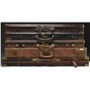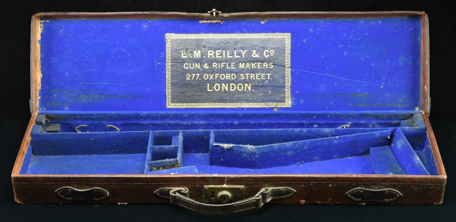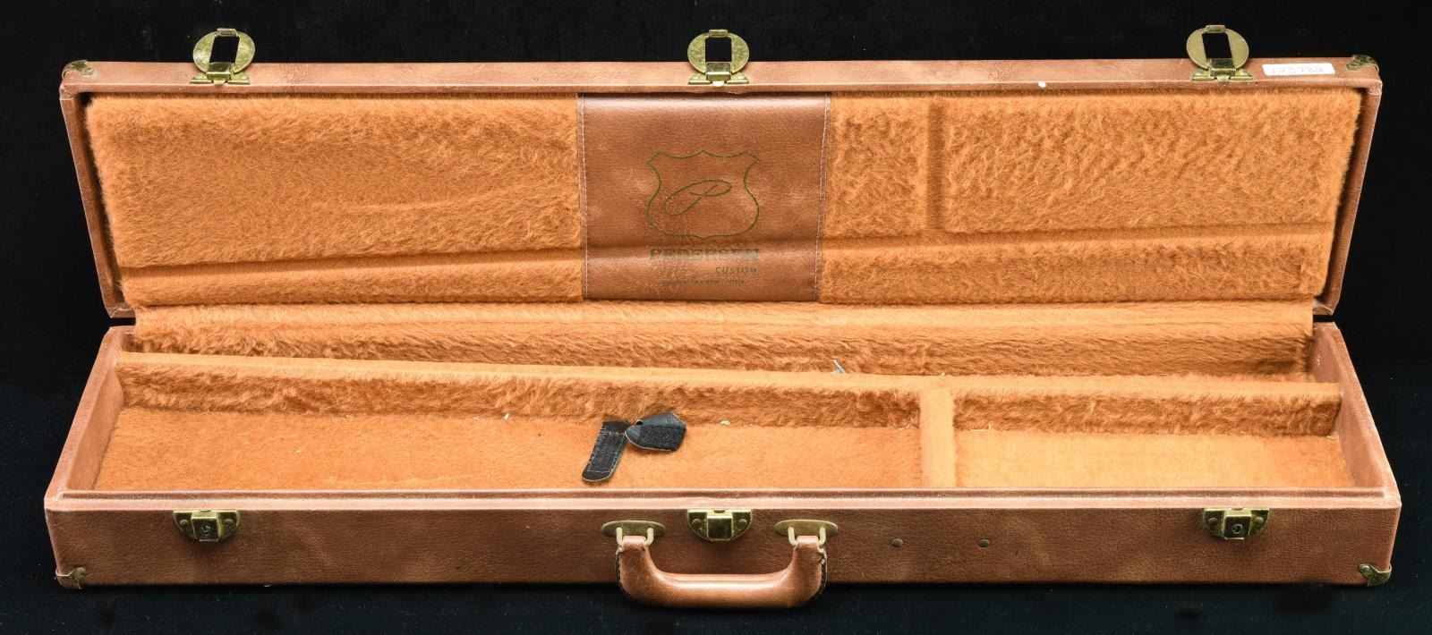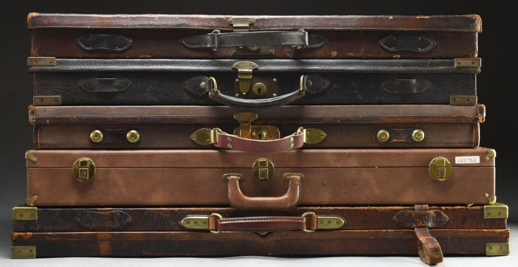This lot consists of the following long gun cases: 1) Abercrombie & Fitch Shotgun Case. Brown leather case w/ green interior. Exterior of case is unmarked & interior has Abercrombie marking. Case measures 35" in length, 9" in width & 3 1/4" in height. CONDITION: one of the exterior straps is missing. Case otherwise shows overall notable crazing, flaking, some cracking & scattered staining. 2) George Gibbs Case. Green George Gibbs case w/ name tag that reads "W. PEARCE". Interior has foam lining w/ most of top lid foam missing. Case measures 32 1/2" in length, 8 1/2" in width & 3" in height. CONDITION: both exterior straps are missing. Leather parts of the case show scattered flaking w/ areas missing, balance of case shows notable staining & soiling. 3) Black Leather Shotgun Case. Exterior has Union Castle & other railroad stickers w/ name "DR. D. HENNESSY". End of lid has some white paint markings. Green velvet interior. Case measures 32" in length, 7 3/4" in width & 3" in height. CONDITION: exterior straps & a few brass screws are missing, case otherwise shows some tears, flaking, overall soiling & crazing. Interior shows some staining & soiling w/ some chipping velvet. 4) Pedersen Custom Case. Tan leather Pedersen Custom case w/ a couple exterior stickers & a Pedersen interior label. Case measures 33" in length, 7 1/2" in width & 4" in height. CONDITION: case shows overall crazing, some staining & scuffing. 5) Leather Shotgun Case. Exterior marked "E.C.H. 18TH H.RS.". Interior of top lid has E.M. Reilly retailer stamp. Blue velvet interior lining. Case measures 32" in length, 8" in width & 3" in height. CONDITION: case is missing both exterior straps. Case shows overall crazing, some flaking, scuffing & staining. Interior shows some flaking & soiling. (02-19942-5/MJC). $200-400.