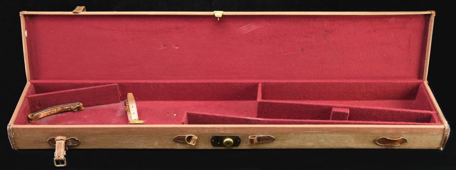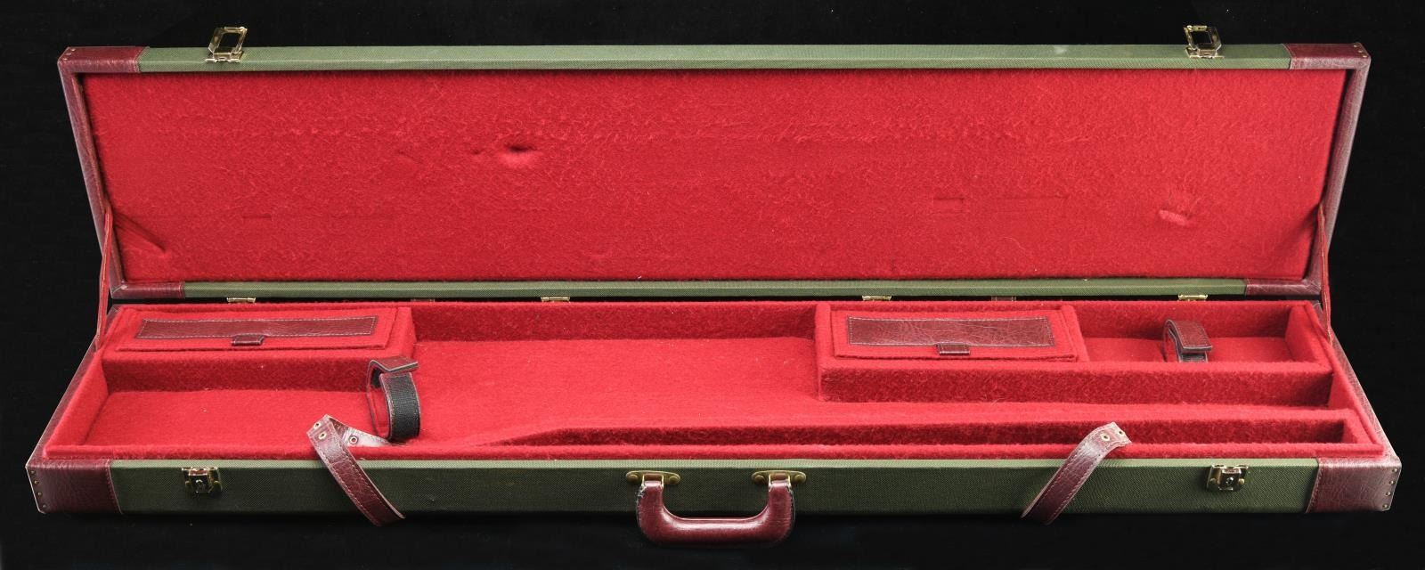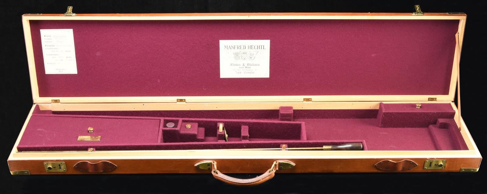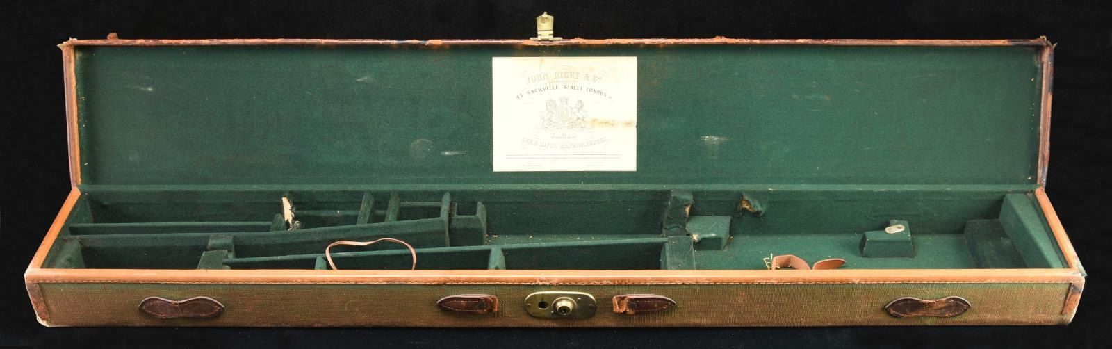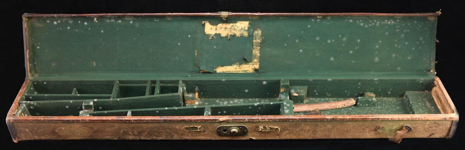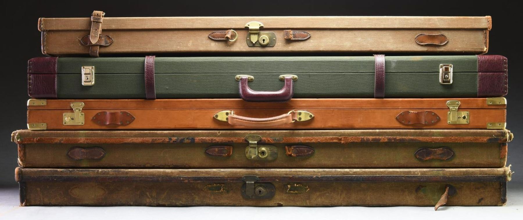 Lot consists of: 1) Custom brown leather wrapped wood case produced by Manfred Hechtl for a Steyr Mannlicher Model S bolt action rifle. Center of the exterior of the lid is missing its circular brass escutcheon, which is present (engraved "JPB") inside. Interior of lid exhibits a Manfred Hechtl label with an additional label on the left detailing information about the rifle. Interior of case exhibits a red felt lining. Case contains factory paperwork pertaining to the rifle, a cleaning rod, an oiler, snap cap and the case straps. Left side panel of interior of case exhibits a plaque that is engraved, "Designed for/ Dr. J. B. Pinkski/ by M. Hetchtl". Case measures 47 3/4" in length, 10" in width and 3" in depth. CONDITION: good overall with scattered spots of wear, some marks and some spots of discoloration from storage and handling. Interior is very good overall. 2) Green canvas wrapped rifle case produced by an unknown mfg. The exterior of the case exhibits a green canvas wrap with leather panels on the left and right sides. Interior features a red felt lining. Case measures 47 3/4" in length, 10" in width and 4" in depth. CONDITION: exterior exhibits some mild wear and discoloration from storage and handling. Interior exhibits some light wear, but is otherwise good overall. 3) Canvas wrapped rifle case produced by an unknown mfg. Exterior of lid is marked "NORMAN ORR EWING/ SCOTS GUARDS". Interior features a green felt lining. Case measures 49 1/2" in length, 8" in width, and 4" in depth. CONDITION: exterior of case exhibits wear, discoloration and staining with crazing and losses to the leather edges. Lid straps are not present. Interior exhibits wear and spotting. 4) Canvas wrapped rifle case produced for a John Rigby & Co. rifle. Exterior of lid is marked "D. KEPPEL./ NEW YORK" with several labels present overall. Interior exhibits a John Rigby & Co. label with a green felt interior. Case measures 49 5/8" in length, 7 7/8" in width, and 3 3/4" in depth. Lid straps are not present. Interior of case exhibits a modification to one of the sections on the left side. CONDITION: exterior exhibits wear, discoloration and staining. Leather edges exhibit losses and crazing. Interior exhibits wear, but is otherwise good overall. 5) Canvas wrapped rifle case produced by an unknown mfg. Khaki canvas wrapped exterior with leather lining at edges. Handle and right lid strap are not longer present. Interior of case features a red felt lining. Case measures 45 3/8" in length, 8 1/8" in width and 3 3/4" in depth. CONDITION: exterior exhibits wear, discoloration and some staining from storage and handling with losses and crazing on the leather edges. Interior exhibits some wear. (02-19942-6/MLW). $300-500.