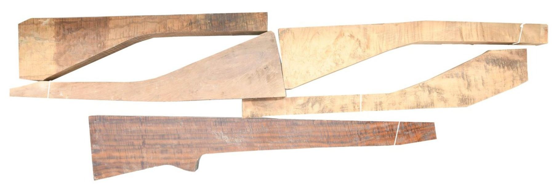 Lot consists of: 1) Varnished wood blank that exhibits a California Claro Walnut label on the base. Wood blank measures 41 3/4" in length and 2 3/4" in thickness. 2) Unmarked wood blank measuring 33 3/4" in length and 2 1/4" in thickness. 3) Unmarked wood blank measuring 30 5/8" in length and 2 1/2" in thickness. 4) Unvarnished wood blank measuring 33 1/4" in length and 2 3/8" in thickness. 5) Unmarked wood blank measuring 36" in length and 1 7/8" in thickness. CONDITION: good, with some mild marks from storage and handling. Please review photos for details regarding wood species and overall condition. (02-19923-1/MLW). $300-500.
