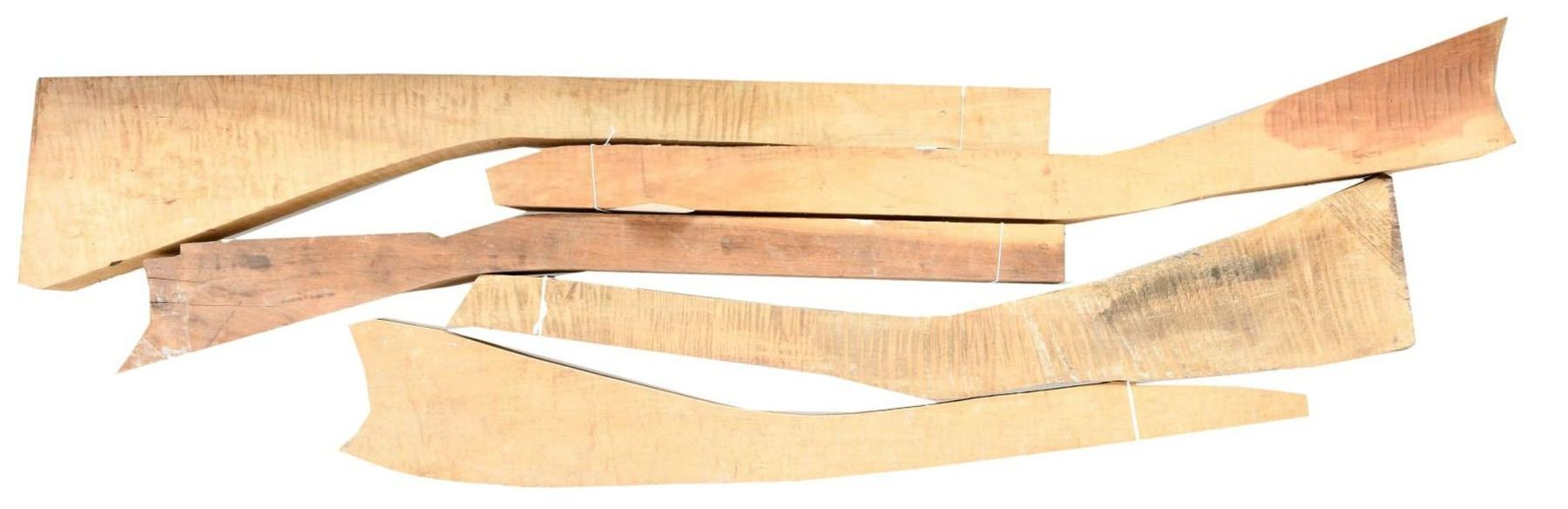 Lot consists of: 1) Unmarked wood blank measuring 36 5/8" in length and 2 3/4" in thickness. 2) Unmarked wood blank measuring 36 1/2" in length and 2 1/2" in thickness. 3) Unmarked wood blank measuring 33 3/4" in length and 2" in thickness. 4) Unmarked wood blank measuring 34 1/2" in length and 1 7/8" in thickness. 5) Unmarked wood blank measuring 34" in length and 2 1/8" in thickness. Rudimentary receiver/bbl. groove has been cut out. CONDITION: good, with some mild marks from storage and handling. Please review photos for details regarding wood species and overall condition. (02-19923-2/MLW). $300-500.