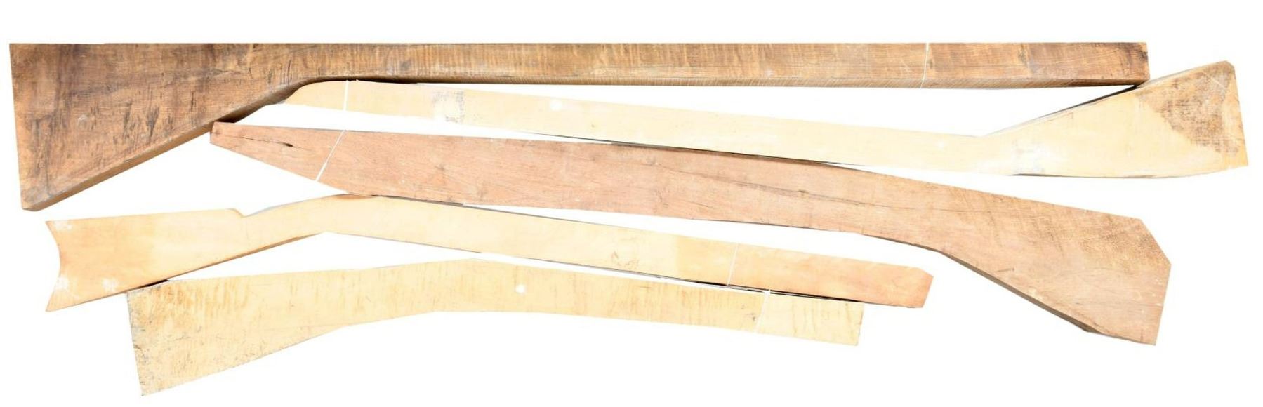 Lot consists of: 1) Unmarked Kentucky Rifle stock blank measuring 59 7/8" in length and 1 3/4" in thickness. 2) Unmarked rifle stock wood blank measuring 50 3/4" in length and 1 7/8" in thickness. 3) Unmarked rifle stock wood blank measuring 50 5/8" in length and 2 1/4". 4) Unmarked rifle stock wood blank measuring 46 5/8" in length and 1 3/4" in thickness. 5) Unmarked rifle stock wood blank measuring 37 5/8" in length and 2 1/2" in thickness. CONDITION: good with some mild marks from storage and handling. Please review photos for details regarding wood species and overall condition. (02-19923-9/MLW). $300-500.