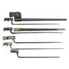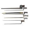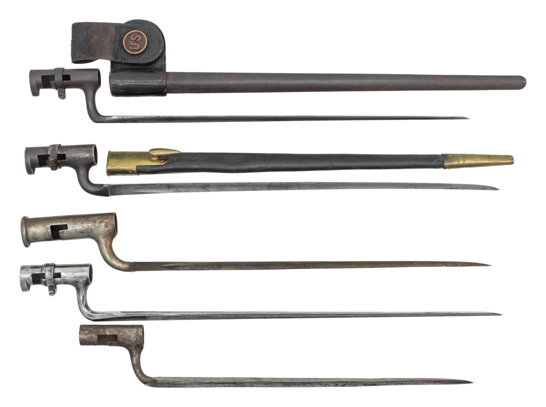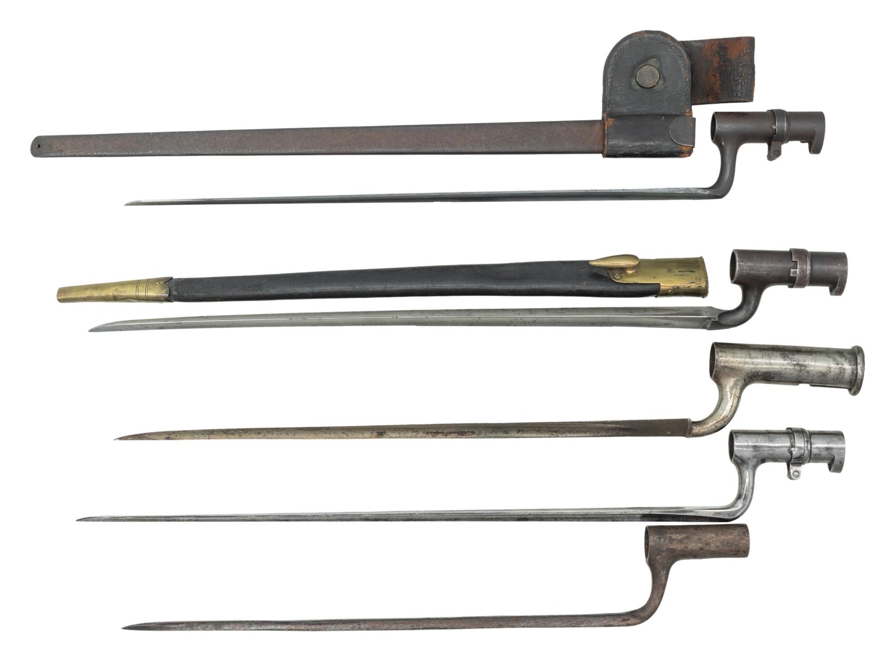 This lot consists of the following bayonets: 1) Unmarked Socket Bayonet. No locking ring. Overall length 17" with 13 1/2" blade. CONDITION: metal is a gray patina with scattered oxidation & age related wear. 2) Woolley Deakin & Co. Indian Pattern 1809 Bayonet. Overall length 20' with 16" blade. Blade has faint Woolley Deakin & Co marking. CONDITION: bayonet shows an older cleaning with scattered oxidation, dings & scratches. 3) US Marked Socket Bayonet. Bayonet measures 21" overall with 18 1/2" US marked blade. Socket has locking ring. No scabbard present. CONDITON: metal has a renickel finish with scattered oxidation, dings & some finished over pitting. 4) US Marked Socket Bayonet. Overall length 21" with 18 1/2" blade. Scabbard & US marked leather frog present. CONDITION: blade remains partially bright with oxidation staining along its edge. Other metal parts of bayonet & scabbard are a dull gray oxidized patina. Scabbard shows scattered crazing & flaking. 5) British Socket Bayonet. Lock ring & British proofs on blade. Overall length 21" with 18 1/2" length blade. Leather scabbard present. CONDITION: blade remains paritally bright with some dings & oxidation. Rear of bayonet is a gray oxidized patina. Scabbard shows oxidation & dings on brass with crazing & flaking on leather. PROVENANCE: Estate Collection of John "Jack" Dhooghe. (02-25559/MJC). $400-600 for lot.