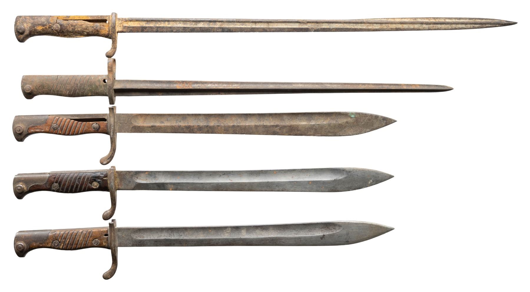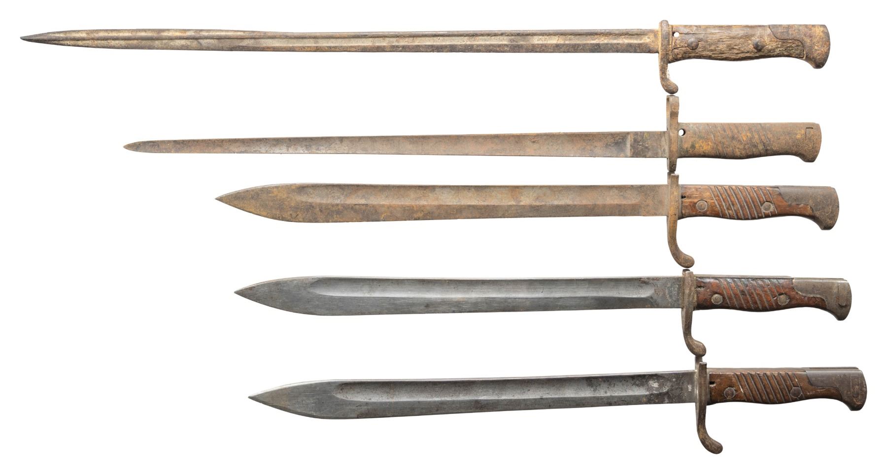 4) German 1898 N/A Bayonet. Markings are illegible due to oxidation. Metal is a oxidized patina throughout with staining. Grips poor with cracks, large chunks missing, heavy staining & finish loss.