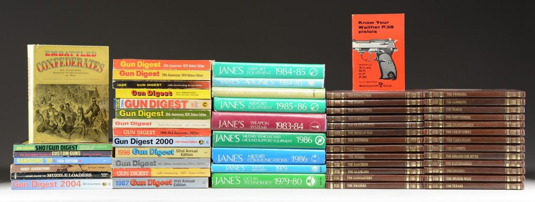 This lot consists of 57 assorted gun, military & history themed books. They are as follows: 1. 26 Hardcover volumes of the Time Life Old West series. CONDITION: good to very good w/ some volumes having staining on the inside. 2. Nine hardcover Jane's Defense Books dated from the late 70's until the 80s. CONDITION: some volumes exhibit tears in dust jackets. Books are good to very good overall. 3. 14 Various Softcover Gun Digest Volumes. Varied years from 1965 until 2006. CONDITION: fair to very good w/ some wear to covers, spines & creases. 4. 1 Embattled Confederates An Illustrated history of Southerners At War. Hardcover book. Text by Bell Irvin Wiley & illustrations by Hirst Milhollen. CONDITION: inside has a personal gift handwritten inscription. Cover shows some tears & shelf wear. 5. 6 Varied Firearm Softcover Books. The books are mostly from Gun Digest & are as follows: "The Gun Digest Review of Custom Guns", "Handguns '98", "2nd Edition Shotgun Digest", "Hobby Gunsmithing", "Home Guide to Muzzleloaders" & "Know Your Walther P.38 Pistols". CONDITION: fair to good w/ shelf wear & creasing. (02-20195/MJC). $200-300.