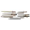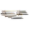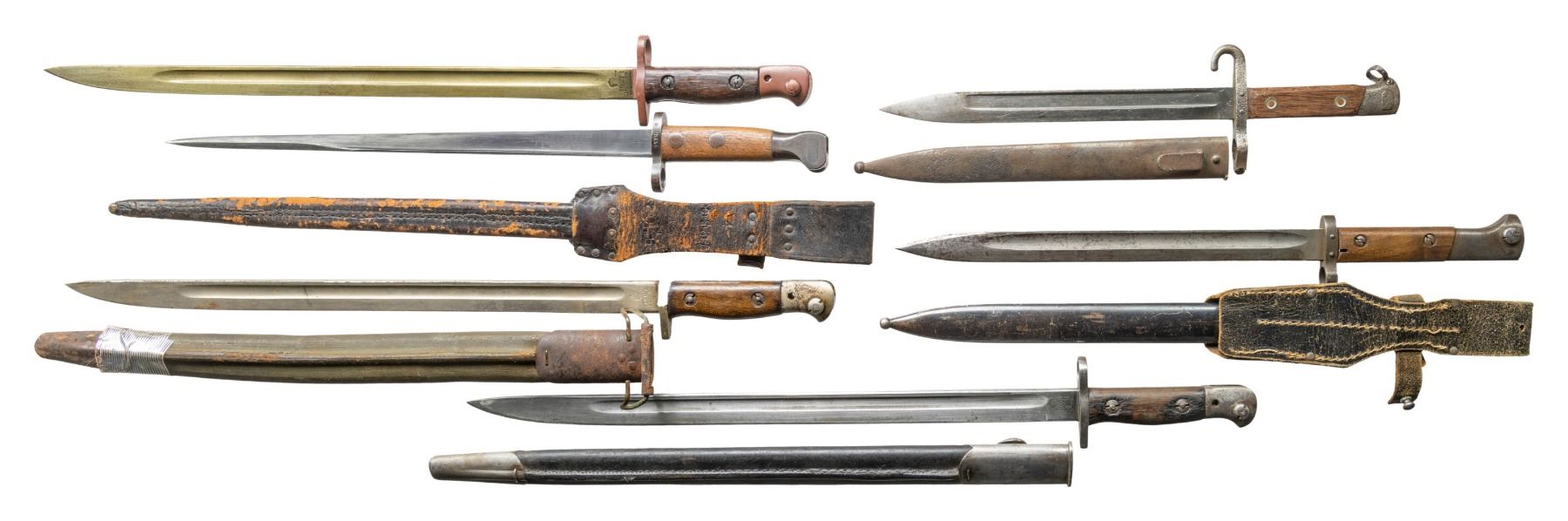 6) Austrian M95 Bayonet. Blade has OEWG Steyr markings. Metal has an old dull reapplied nickel finish. Wooden handles. Scabbard present. CONDITION: metal of bayonet & scabbard shows scattered notable finished over pitting, fading to gray, flaking & oxidation. Wooden handles appear sanded with dings, finish, chipping & staining. (02-25631/MJC). $300-500 for lot.