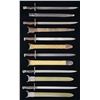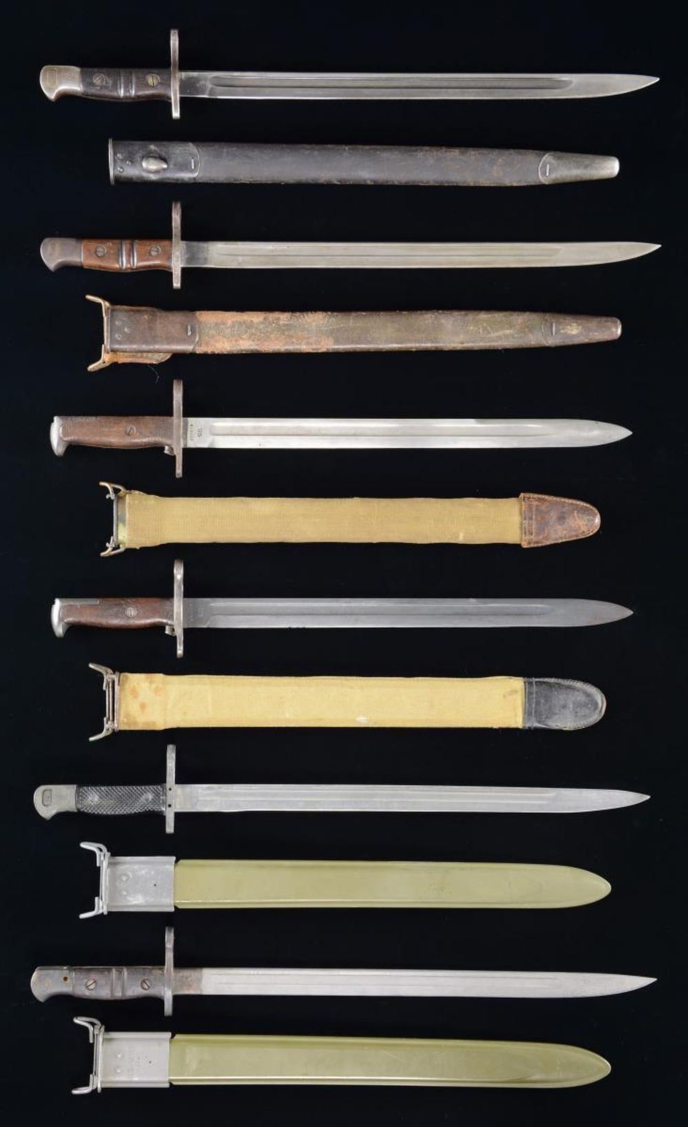 SCABBARDS. 1) Model 1905 bayonet mfg. by Springfield Armory in 1911. Left side of ricasso is marked "SA" above a flaming ordnance bomb and "1911" with "US/ 484597" marked on the right. Left side fuller is inscribed "Jesse V WestBURGH", with the same inscribed in the right side fuller in cursive. Blade has been cleaned at one time. Rock Island Armory canvas and leather scabbard. CONDITION: very good with the blade exhibiting some scattered spots of light pitting and dark discoloration. Blade face exhibits a small nicK, but otherwise is very good overall. Crossguard and pommel exhibit moderate wear and oxidation. Wood grip shows some minor marks and impressions from handling and storage. Scabbard exhibits some wear and discoloration with crazing present on the leather tip. 2) Model 1905 bayonet mfg. by Springfield Armory in 1911. Left side of ricasso is marked "SA" over a flaming ordnance bomb and "1911", with "US/ 496949" marked on the right. Blade exhibits a blued finish. Canvas and leather scabbard. CONDITION: very good with the blade retaining the majority of its arsenal blue finish. Blade face exhibits several knicks. Crossguard and pommel exhibit thinning and wear through to gray patina. Grip shows some scattered marks and impressions, but otherwise remains sturdy and serviceable. Scabbard exhibits some wear with areas of discoloration overall. 3) Model 1917 bayonet originally mfg. in 1913 as a Pattern 1913 bayonet by Remington and subsequently redesignated as a Model 1917 bayonet. The left side of the ricasso is marked "1913" over "9 17" and a Remington mfg. mark, with a crossed out British proof above "U.S." on the right. Leather scabbard. CONDITION: blade retains a gray patina, with some scattered spots of discoloration. Crossguard and pommel exhibit wear and thinning with areas of surface oxidation. Grip show a few scattered marks and impressions, but is otherwise good overall. Scabbard exhibits wear and scattered spots of crazing. 4) Model 1917 bayonet originally mfg. in 1913 as a Pattern 1913 bayonet and subsequently redesignated as a Model 1917 bayonet. Left side of ricasso is marked "1913" above "8-16" and "W", with British proofs on the right. Blued finish. Leather scabbard. CONDITION: blade exhibits wear and thinning to its blue finish that shows through to gray patina. Crossguard and pommel exhibit a gray patina. Grip shows some scattered marks and impressions, but otherwise is good. Scabbard exhibits wear and some small scattered spots of crazing. 5) Model 1917 bayonet mfg. by Remington in 1917. Left side of ricasso is marked "1917" over Remington's mfg. mark with an eagle head over "26" (indicating arsenal refurbishment) and a flaming ordnance bomb over "US" on the right. Blade exhibits a parkerized finish. M-1917 scabbard marked "V Z M". CONDITION: good with blade exhibiting some scattered spots of discoloration and some pitting beneath the finish. Crossguard and pommel exhibiting pitting and retain a dark gray patina. Grip shows some scattered handling marks, but is otherwise good. Scabbard shows some marks from handling and storage, but otherwise remains sturdy and serviceable. 6) Vietnam era Model 1917 bayonet. Top of crossguard is marked "CA" and US M1917", with a white boxed eagle ink stamp. Parkerized finish with 2-piece checkered black plastic grips. M-1917 scabbard marked "V Z M". CONDITION: metal components retain the majority of their arsenal parkerized finish, exhibiting some wear that shows through to silvering overall. Grips show some scattered handling marks and smoothing, but otherwise are good. Scabbard shows some scattered marks from handling and storage, but otherwise remains sturdy and serviceable. (02-21222-3/MLW). $600-1,200.