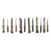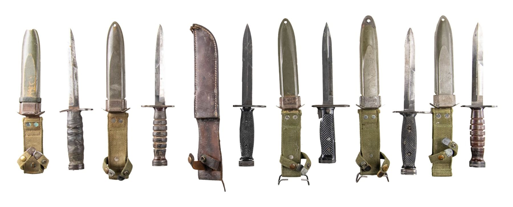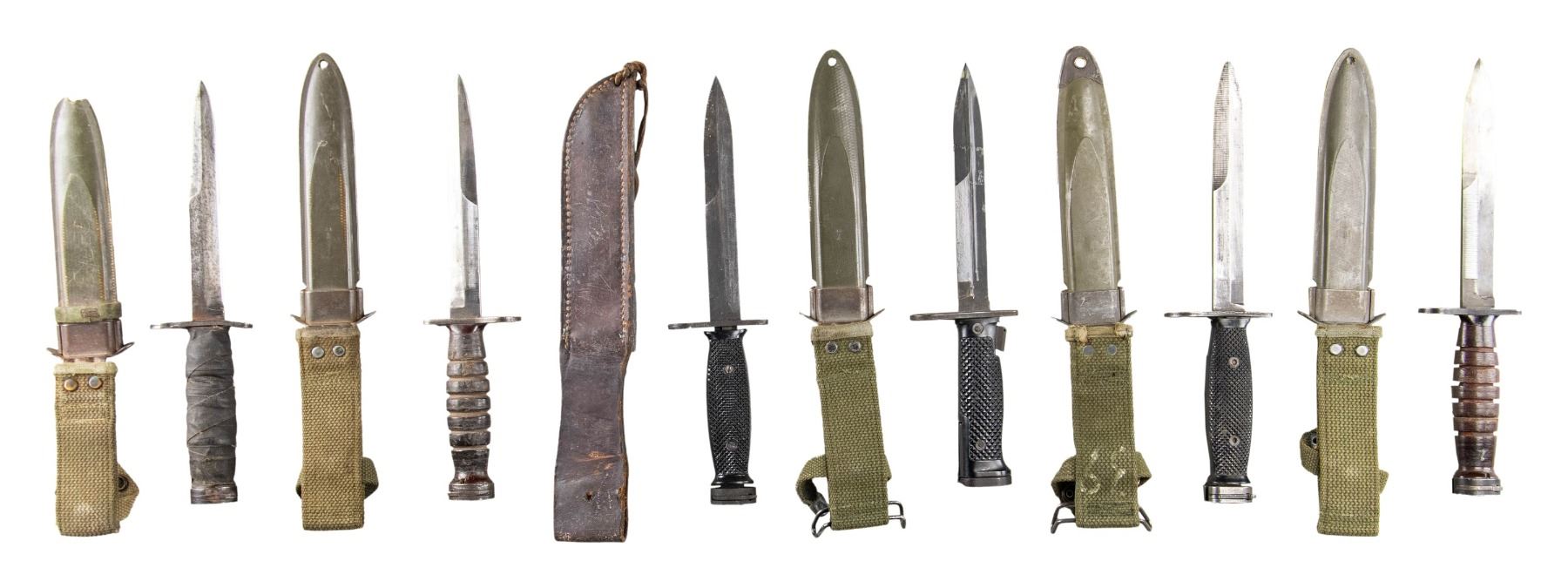 4) US M6 Bayonet. Imperial marked crossguard. BMCO US M8 scabbard. CONDITION: metal parts of bayonet show scattered edge wear & oxidation. Scabbard & frog show scattered scuffing & staining. 5) South Korean KM4 Bayonet. Crossguard has KM4 marking. Unmarked leather scabbard. CONDITION: metal parts of bayonet are gray with oxidation & edge wear. Scabbard shows heavy scuffing dirt staining & scratches.