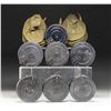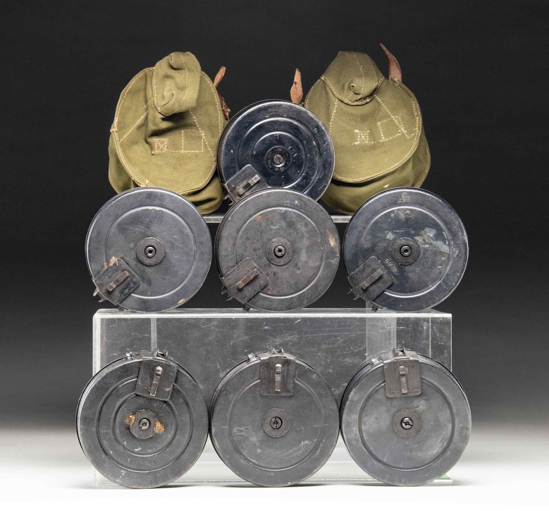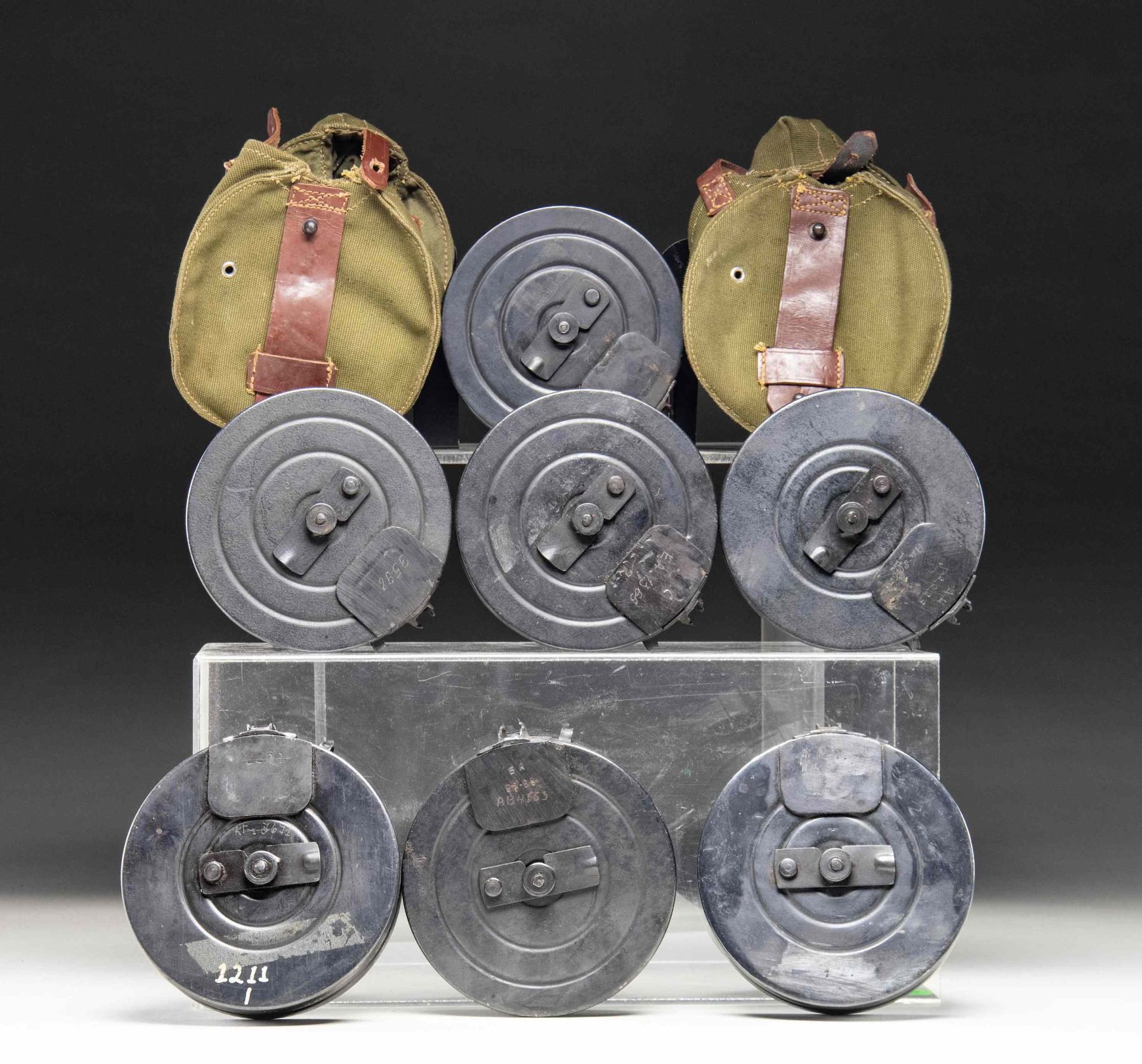 Lot consists of 7 Soviet PPSh-41 submachine gun 71-rd. drum mags. Steel construction with blue finish. 2 drums are complete with a green canvas carrier. CONDITION: mags. are good, exhibiting scattered superficial handling marks and varying degrees of wear. Carriers are very good overall. (02-25481/MLW). NON-GUN. $500-1,000.