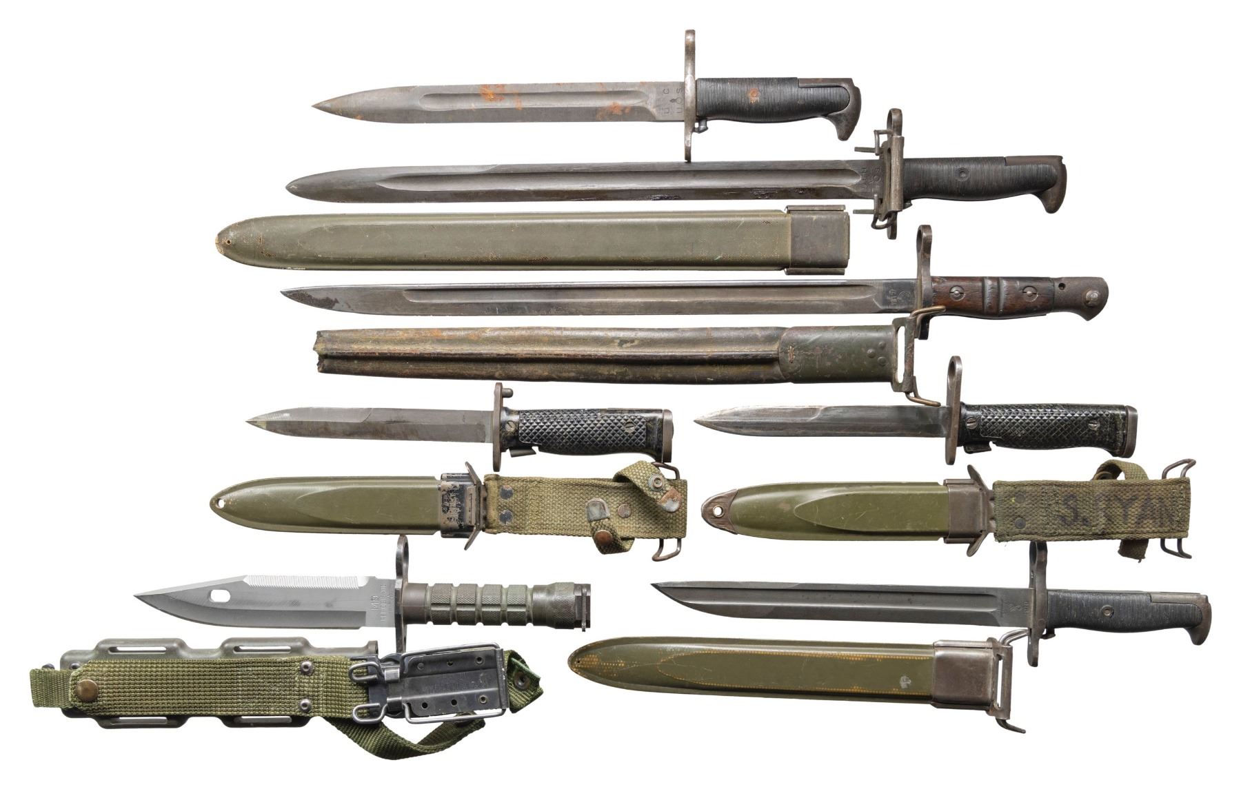 2) US M1 Bayonet. Utica made M1 bayonet. No scabbard present. CONDITION: metal parts show scattered oxidation patches, edge wear & fading to gray. Handles show dings & wear.