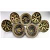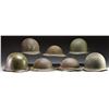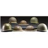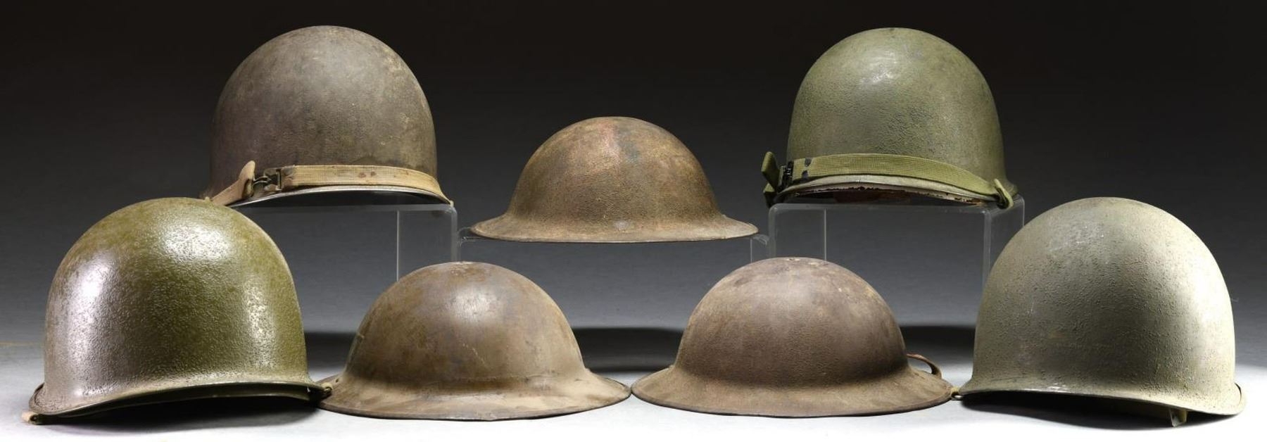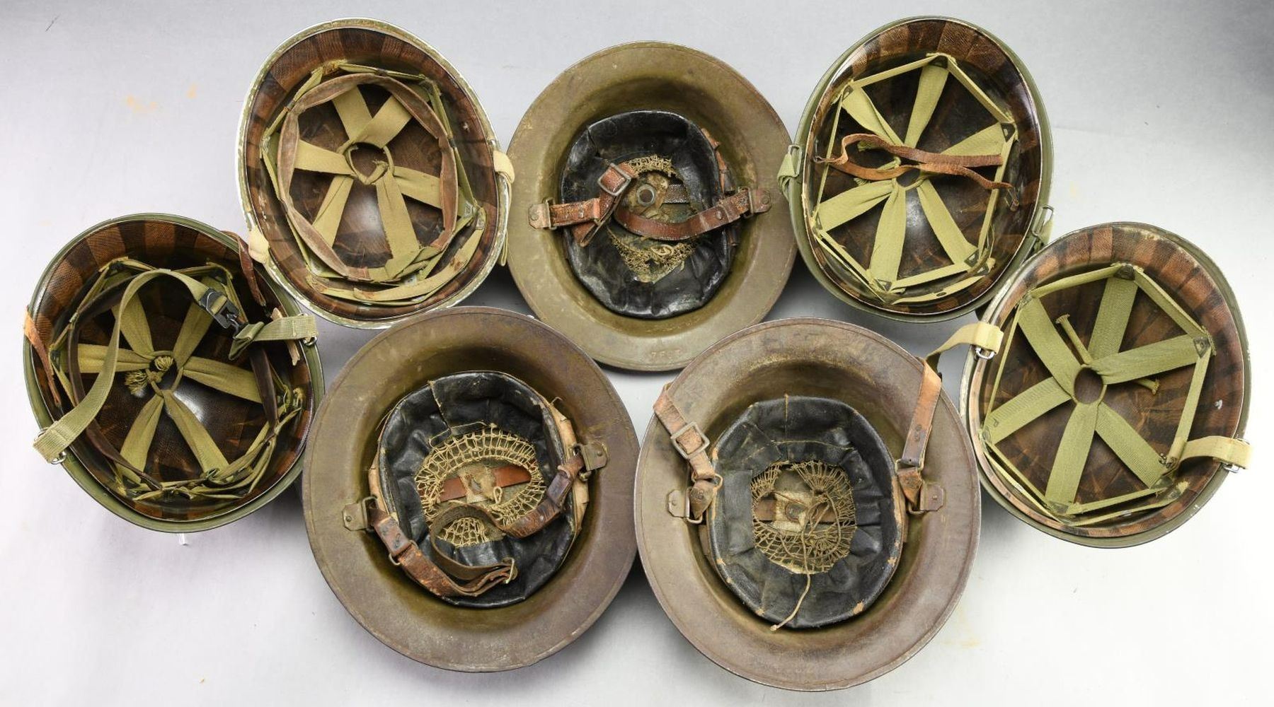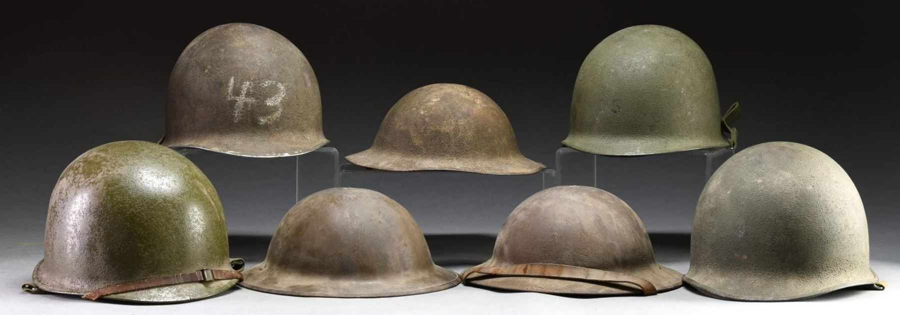 This lot consists of the following US helmets: 1. M1 Front Seam Swivel Bail Helmet. Pebbled green paint. Tan canvas chinstrap. Firestone liner. 2. M1 Rear Seam Swivel Bail Helmet. Pebbled green paint. Liner has no discernable markings but does have internal swivels & exterior white paint. Dark green canvas chinstrap. 3. M1 Front Seam Swivel Bail Helmet. Pebbled green paint. Westinghouse liner w/ internal swivels. Liner has white sticker hat reads "HERVEY FLINT". Canvas & leather chinstraps. 4. M1 Front Seam Fixed Bail Helmet. Helmet has green paint that is showing notable flaking, oxidation & a few a large dents. Front of helmet has white paint "43". Inland mfg. liner w/ white paint "C.J.S.". Tan canvas chinstrap. 5. US M1917 Brodie Helmet. Green paint Edward Budd Mfg. Co. helmet marked "ZC44" at rear. Liner & chinstrap present. 6. US M1917 Brodie Helmet. Green paint helmet marked "ZE57" at rear. Chinstrap & liner present w/ liner being separated from shell. 7. 80th Infantry Division M1917 Brodie Helmet. Green paint M1917 Brodie helmet w/ painted 80th Division insignia & shield w/ "I" insignia. Inside of helmet marked "ZA28" for Crosby Mfg. Co. Liner & chinstrap present. CONDITION: helmets display varying degrees of oxidation, flaking & wear. Leather parts display varying degrees of crazing, flaking & staining. (02-21065/MJC). $600-800.