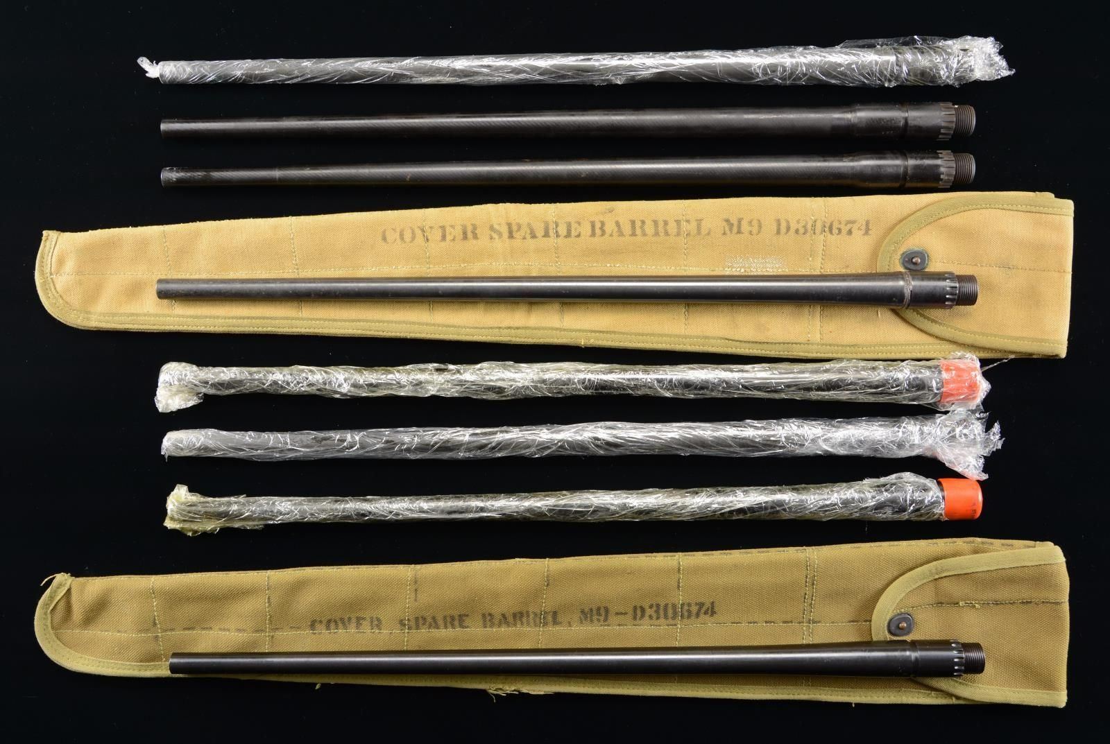 8 total barrels for the Browning Model 1917 water cooled machine gun in the following calibers; 1) 6 chambered in 8mm. 2) 2 chambered in 7.62 NATO. UNATTACHED ACCESSORIES: 2 canvas barrel bags, 1 tan & 1 green. CONDITION: All barrels described by consigner as new, some chrome lined. Since all are in various states of wrapping & cosmoline protection we spot checked a few that have bright bores w/ strong rifling. (02-19831-2/JZ). $800-1,600.