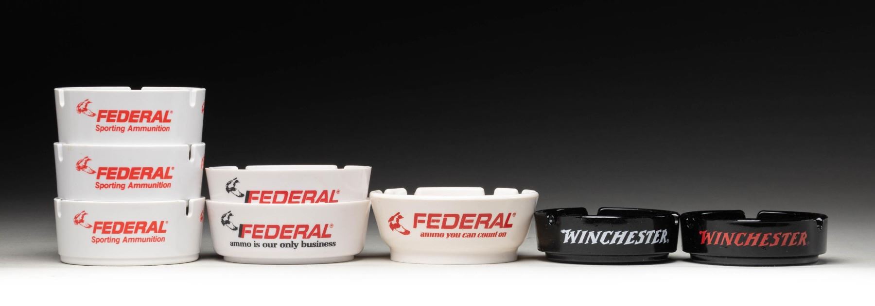 Lot of 8 Federal and Winchester ash trays, including: 1) x6 Federal Ammunition ash trays. Trays are comprised of white plastic and are of assorted size. 2) x2 Winchester / Western ash trays. Black ceramic construction. x1 with white lettering, x1 with red lettering. Red lettered tray is complete with what appears to be its factory cardboard box. CONDITION: trays are very good overall, showing some light superficial handling marks. PROVENANCE: Norman Olliff Estate. (02-25647/MLW). NON-GUN. $25-50.
