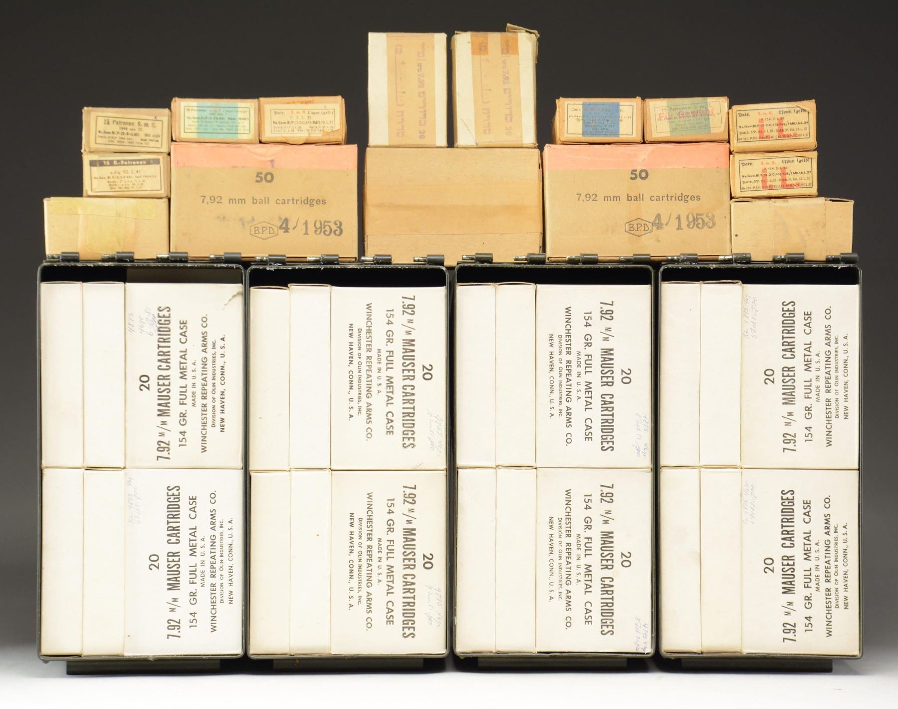 This lot consists of the following 8mm Mauser Ammo all housed in GI style 50 Cal. ammo cans: 1) About seventy six 20 rd. boxes of 154 gr. FMJ Winchester Olin 7.92mm Mauser ammo. 2) About six opened 15 rd. boxes of WW2 German ammo. 3) Two 50 rd. boxes of Italian BPD ammo dated 1953. 4) Two 20 rd. boxes of Israeli ammo with one opened box. 5) Three 44 rd. boxes of unmarked 8mm Mauser ammo. CONDITION: some rounds show scattered tarnish, others rate very good. PROVENANCE: The Estate Collection of Charles Wagner. (02-23107-2/MJC). $500-800.