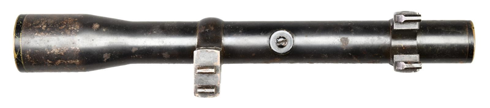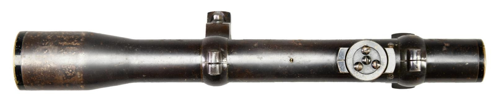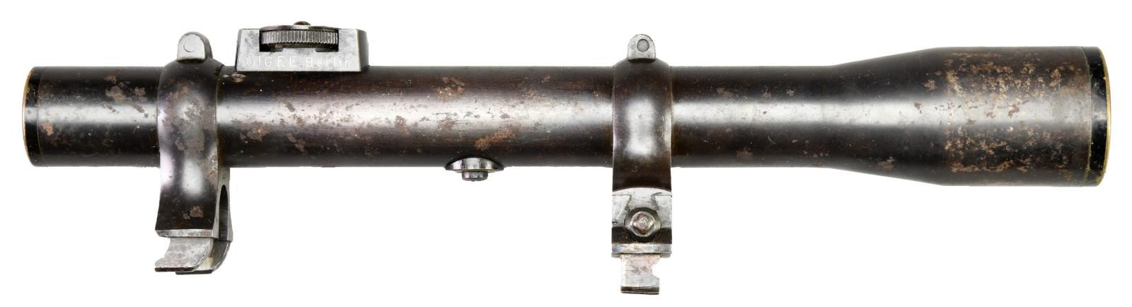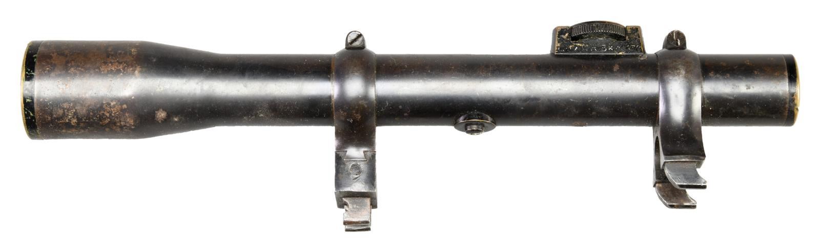 This lot consists of 9 assorted German & Austrian scopes. 1) Hensoldt-Wetlzar Dialytan 4x Power Scope. Scope is marked "Made in Germany" & numbered "13826". Post reticle. CONDITION: blued finish shows scattered oxidation, fading, & some scratches. Optics are mostly clear w/ a slight green tint. 2) Voigtlader Braunschweig Skopar B Scope. Rear of scope has deer logo, and scope is numbered "14218". Double claw style rings present. Post reticle. CONDITION: metal is turning gray w/ some oxidation & an area of tape remnant. Brass focus knob shows heavy wear to checkering & some notable dings. Optics are fair w/ green tint, and part of the reticle appears to be missing. 3) Hensoldt Duralyt 4x Power Scope. Scope is numbered "5128". Triangle post reticle. CONDITION: exterior of scope shows some flaking & light oxidation. Good optics. 4) Oigee Berlin 3x Power Luxor Scope. Post reticle & double claw mount rings. Scope appears to be numbered "40438", but number is not fully legible. Rear ring is numbered "EW 6247". CONDITION: finish is turning to a gray patina w/ traces of blue, some pitting, & overall oxidation. Dirty & cloudy optics that may clean up. 5) Carl Zeiss Zielvier Scope. Short side rail commercial mount. Scope is numbered "73838". Post reticle. CONDITION: metal shows some tape remnants & oxidation. Good optics. 6) Hensoldt Kontralyt 4x81 Scope. Scope is numbered "126058". Thin crosshair reticle. CONDITION: scope tube shows some edge wear, dried grease, & light oxidation. Optics have a green tint. 7) Unmarked Single Claw Mount scope. Single claw rings present. Duplex crosshair reticle. CONDITION: scope shows overall flaking to gray. Good optics. 8) Sirius G4x Scope. Quick detach rings. Scope is numbered "10105". Post reticle. CONDITION: scope body is turning gray w/ some pitting, scattered oxidation, & edge wear. Hazy optics. 9) Unmarked German Style Scope. Triangle post reticle. CONDITION: black enamel parts show overall flaking. Tube is turning to gray patina w/ scattered oxidation. Fair optics w/ a green tint. 10) Nikon Scope Covers. Front & rear folding scope covers. CONDITION: very good. 11) Military Style Oiler. Oiler bottle similar to GI issue. CONDITION: very good. (02-19943/MJC). $1000-1500.