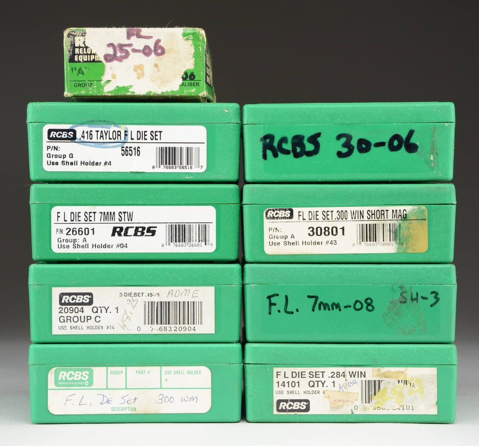 LOT OF 9 RCBS RELOADING DIE SETS.