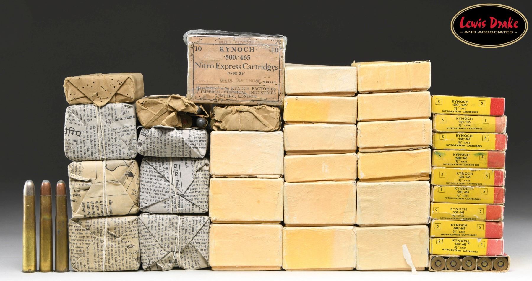 This lot consists of about 250 rds. of varied 500/465 Nitro Express ammo. Some ammo is of Kynoch mfr. & in 5 rd. Kynoch boxes. Other ammo is in varying wrappers & plain packaging. CONDITION: boxes & wrappers show varying degrees of wear. Ammo shows varying degrees of storage wear, oxidation & tarnishing. PROVENANCE: from the renowned collection of quality sporting arms from Lewis Drake together with inventory of Lewis Drake Associates. (02-23571-20/MJC). $700-1000 for lot.
