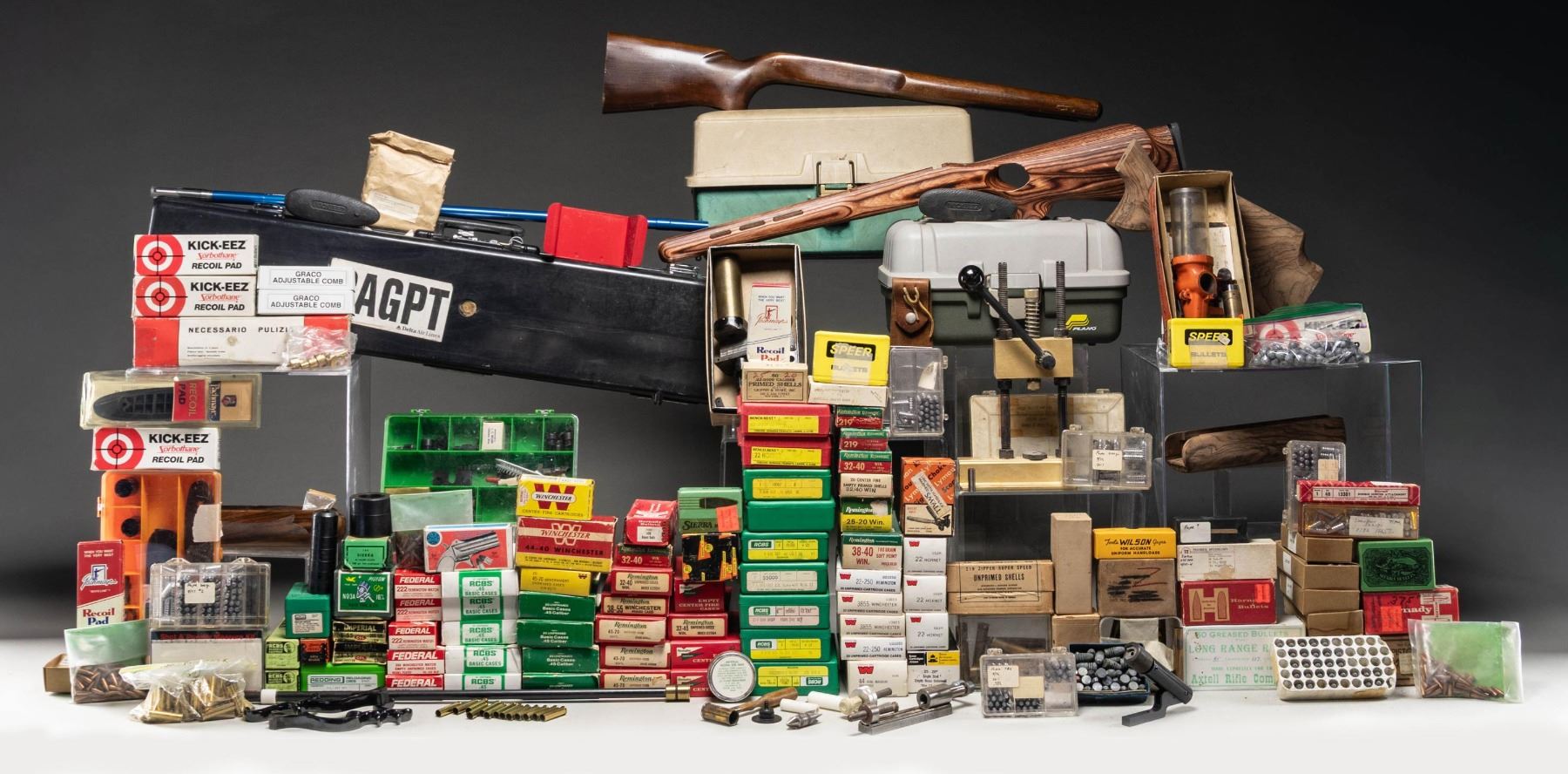 LOT OF AMMO, RELOADING CASES & GUN PARTS.