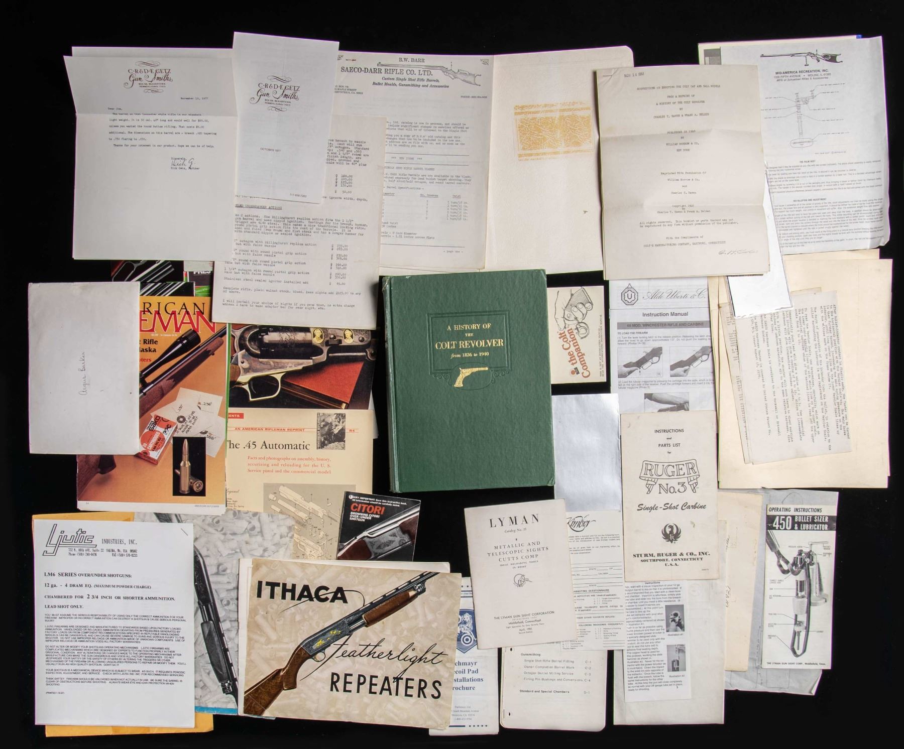 - Small collection of firearm manuals & misc. paperwork for makers such as Browning, Remington, Perazzi, Colt, & Ljutic. Also included is the Book: "History of the Colt Revolver from 1836 to 1940. CONDITION: this large assortment of items having wide range of conditions; but appear mostly in good serviceable condition. Ammo appears serviceable with some examples of minor patina on casings. (02-26034-7/MD). $300-1000.