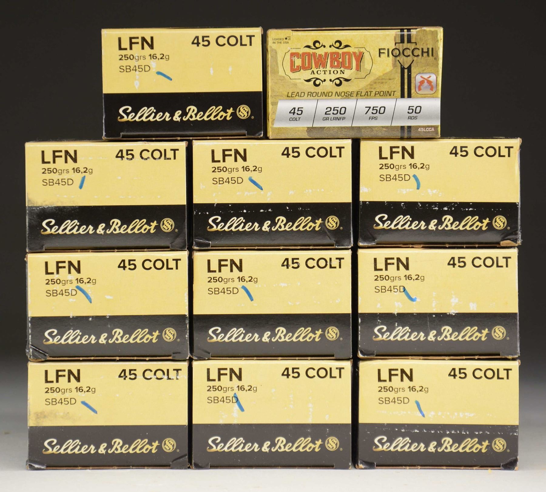 AMMUNITION. Lot of approx. 550-rds. of .45 Colt ammunition, produced by a variety of mfgs. Ammunition is housed within its original factory boxes. CONDITION: very good, with ammunition appearing serviceable. Boxes show varying degrees of wear, but otherwise remain sturdy and serviceable. (02-23338-2/MLW). $150-250.
