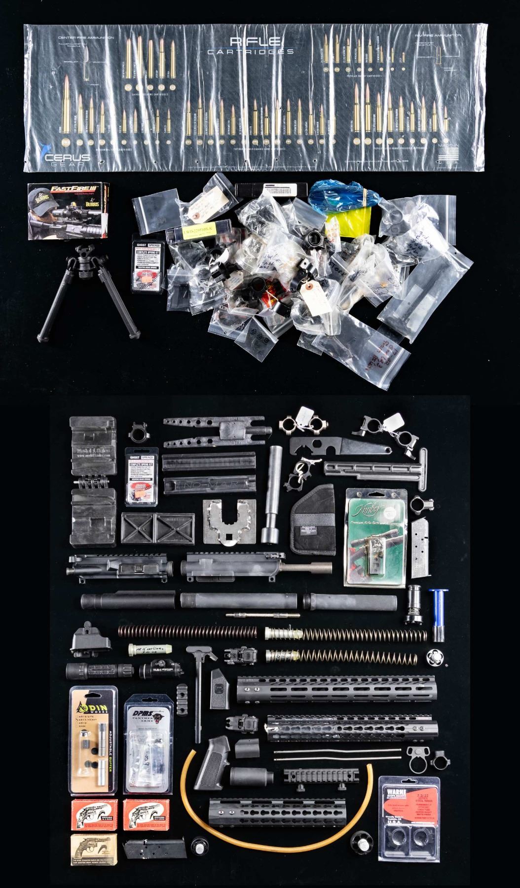 Lot of assorted firearms parts and accessories, including: 1) x2 complete flat top AR-15 upper assemblies. x1 assembly exhibits a square, the other with a keyhole forge mark on the right side. x1 assembly with standard charging handle and unmarked bolt group, the other is complete with a ambidextrous POF charging handle and Fail Zero bolt group. 2) x1 (apparent) GunTec 15 1/8" M-LOK AR-15 handguard. 3) x1 UTG Pro 12 7/8" Keymod AR-15 handguard. 4) x1 unmarked 10 1/4" Keymod AR-15 handguard. 5) x1 9" AR-15 buffer tube. 6) x1 7 3/16" AR-15 buffer tube. 7) x1 7 1/4" AR-15 buffer tube. 8) x1 Law Tactical AR-15 folding stock adapter. 9) x3 assorted AR-15 buffers with springs. 10) x1 Unmarked AR-15 charging handle. 11) x1 FCW AR-15 charging handle. 12) x2 AR-15 mil-spec triggers. 13) assorted AR-15 small parts and accessories. 14) x1 Aftermarket Lone Wolf (19N) 3 7/8" satin stainless steel Glock 19 bbl. 15) x1 Aftermarket Lone Wolf (40-9) 4 7/8" threaded Glock bbl. 16) x1 Glock trigger assembly (bag marked "17-22/ Gen 1, 2, 3,/ from RS USA". 17) x2 Ghost Springs Glock trigger grips. 18) x1 box containing several bags of Glock small parts. 19) x1 Model "1" Sales armorers action block. 20) x1 set of NO-M.A.R. receiver vice blocks. 21) x1 unmarked AR-15 bbl. nut wrench plate. 22) x1 unmarked AR-15 spanner wrench tool. 23) x1 MAGPUL folding bipod with picatinny rail mount. 24) x1 set of MAGPUL MBUS picatinny rail mount iron sights. 25) x1 Surefire flashlight. 26) x1 Surefire TLR-1 picatinny rail mount flashlight. 27) x1 Demooner moon clip unloading tool. 28) x1 LULA 5.56/.223 AR-15 loading / unloading tool. 29) x1 Glock 483 loader. 30) x1 Burris Fastfire III red dot reflex sight in factory box. 30) x2 HKS 36 revolver speed loaders. 31) x1 HKS 25 .45 Auto Rim speed loader. 32) x4 small bags of assorted moon and half-moon clips. 33) x1 Safariland spped loader. 34) x1 A.R.M.S. 40L rear sight. 35) x2 M1911A1 blued steel 7-rd. mags. mfg. by Check-Mate Industries (Mfg. Code: 1M291). 36) x1 Kimber of Oregon Model 82 blued steel 4-rd. mag. 37) x5 small bags of assorted small parts. 38) x1 sealed Cerus Gear rifle cartridges gun mat. 39) x2 sealed Smith & Wesson handgun cleaning rods. x1 with spare brush, x1 with screwdriver. 40) x3 empty Pachmayr Gun Works Improved Grip Adapter boxes. 41) x1 set of Kimber K22/84M matte blue scope bases in factory packaging. 42) x1 set of Warne Scope Mounts (Part # 721 M) 7.3/22 Series 1" medium height steel scope rings in factory packaging. 43) x1 box containing x13 sets of assorted scopes rings (x1 single scope ring present), x2 bags of assorted Nelson CZ 452 screws, x1 set of Remington 541 picatinny rail scope mounts, x1 bag containing x2 Marlin Model 39A hammer extensions, x3 unmarked blued steel sling swivels, x1 single unmarked sling swivel, as well as x1 set of Talon TOC sling swivels. CONDITION: parts remain good to very good, with most exhibiting some light superficial marks and wear from handling and storage. (02-25991/MLW). NON-GUN. $250-500.