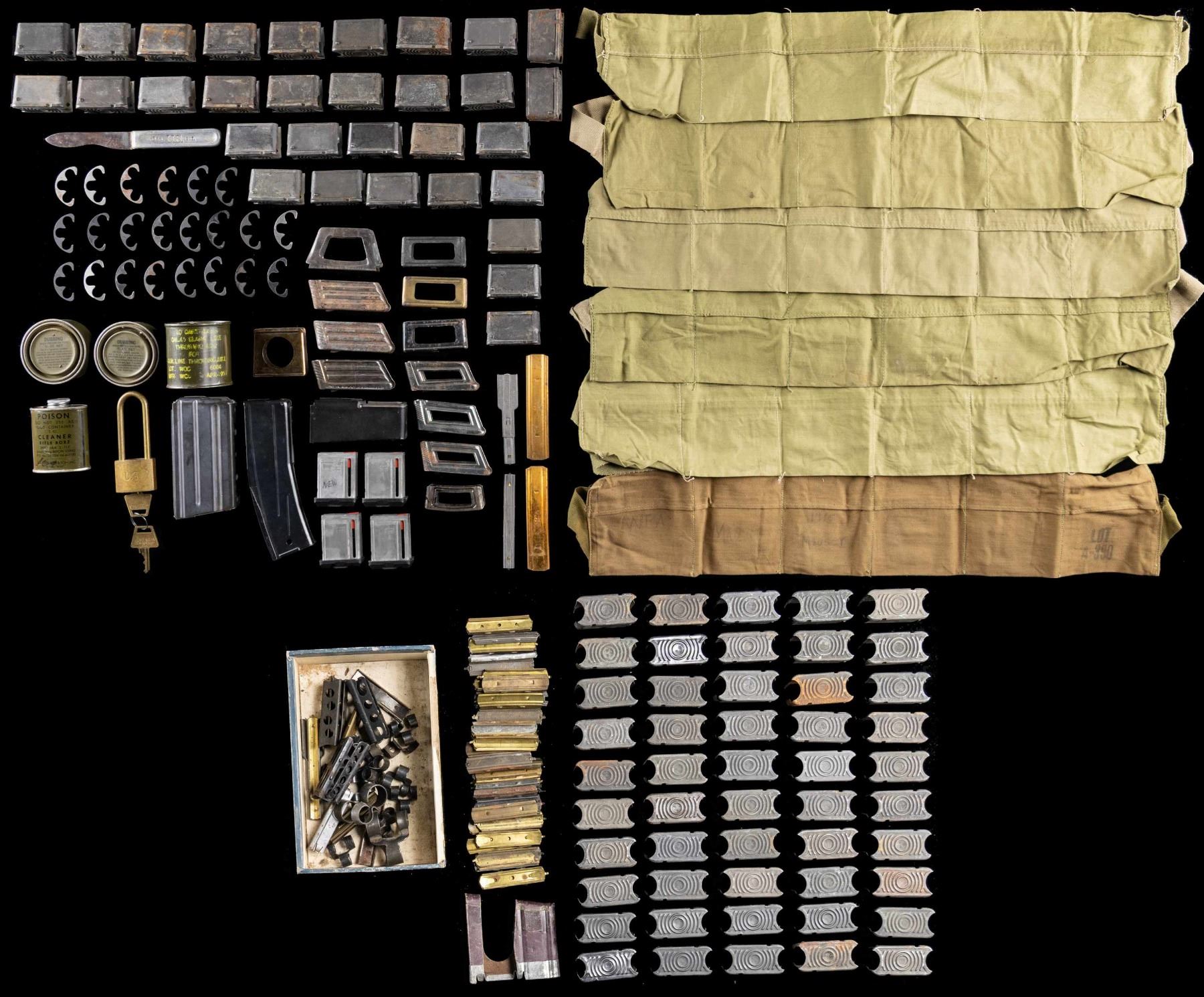 EQUIPMENT. Lot of assorted clips, mags., and U.S. field equipment, including: 1) x1 Swiss K11/K31 6-rd. 7.5x55mm Swiss stripper clip. 2) x3 Steyr M95 5-rd. 8x50mmR / 8x56mmR en blocs. 3) x3 Steyr Model 1888 5-rd. 8x50mmR / 8x52mmR en blocs. 4) x1 Dutch Model 1895 Mannlicher 5-rd. 6.5x53mmR en bloc. 5) x1 (apparent) French RSC Modele 1917 5-rd. 8x50mmR Lebel stripper clip. 6) x1 German Model 1888 5-rd. 7.92x57mm Mauser clip. 7) x3 Italian Carcano 6-rd. 6.5x52mm / 7.35x51mm clips. 8) x5 Enfield SMLE 5-rd. stripper clips. 9) x2 Boys Anti-Tank Rifle 5-rd. .55 Boys stripper clips. 10) x3 10-rd. M16/M4 5.56x45mm stripper clips. 11) x2 .35 Caliber (likely for a Remington Model 8) 5-rd. stripper clips. 12) x1 Finnish M91 Mosin Nagant stripper clip. 13) x2 assorted stripper clips. 14) x36 assorted .30-06 Springfield 5-rd. stripper clips. 15) x1 blued steel M1/M2 Carbine 30-rd. mag. Spine is marked "M2". 16) x1 Colt AR-15 20-rd. mag. 17) x1 Browning BBR .30-06 Springfield (apparent) 4-rd. mag. 18) x4 Remington Model 597 Magnum 8-rd. mags. 19) x22 revolver .45 ACP 3-rd. half-moon clips. 20) approx. x82 M1 Garand 8-rd. en blocs. 21) x1 small assortment of U.S. pattern machine gun belt links. 22) x6 U.S. cloth ammunition bandoliers. 23) x1 sealed 10-rd. can of U.S. M32 .45 blank line throwing Mk I cartridges. 24) x2 1oz cans of U.S. boot dubbing. 25) x1 2oz can of U.S. rifle bore cleaner. 26) x1 U.S. WWI Rock Island Arsenal 1917 production mess kit knife. 27) x1 brass "U.S." marked lock. CONDITION: items exhibit varying degrees of wear, with some en blocs exhibiting varying degrees of oxidation. Brass lock's shackle has broken off on the interior. PROVENANCE: Norman Olliff Estate. (02-25702/MLW). NON-GUN. $100-150.