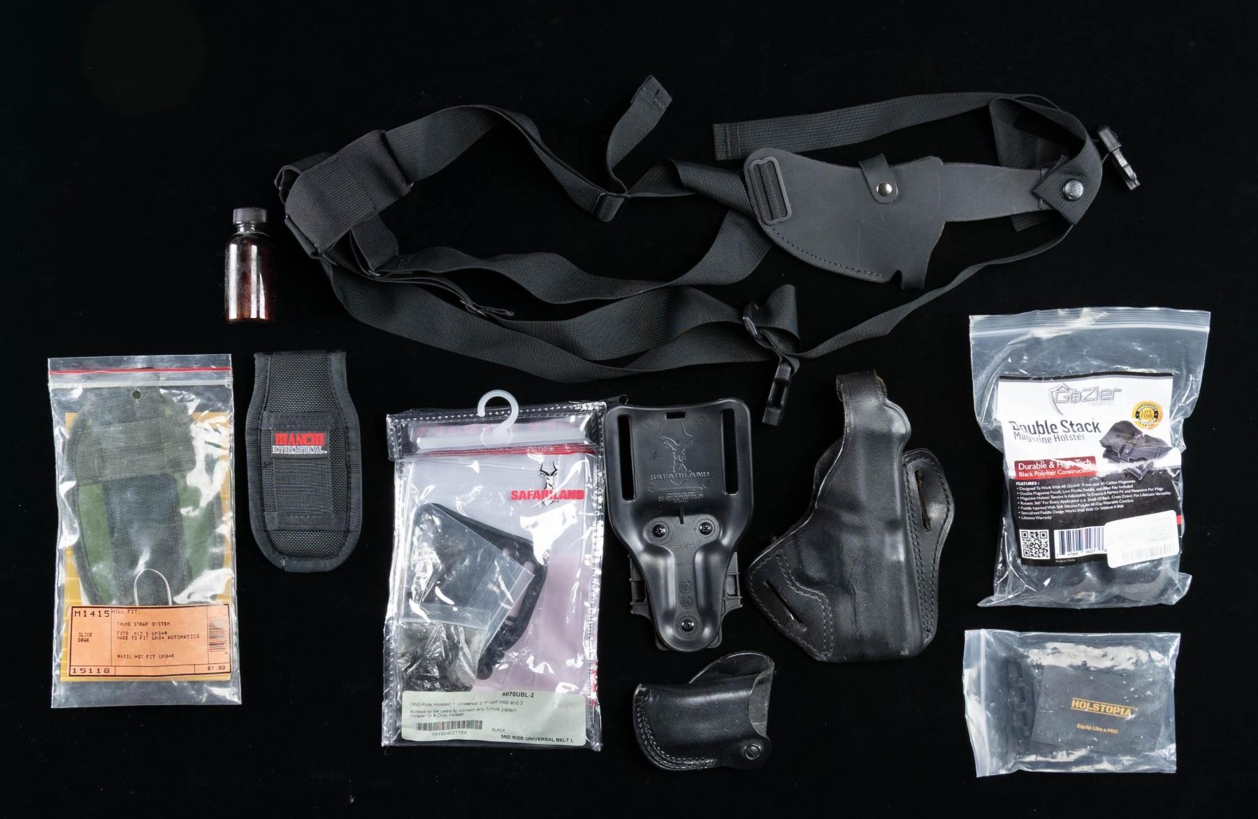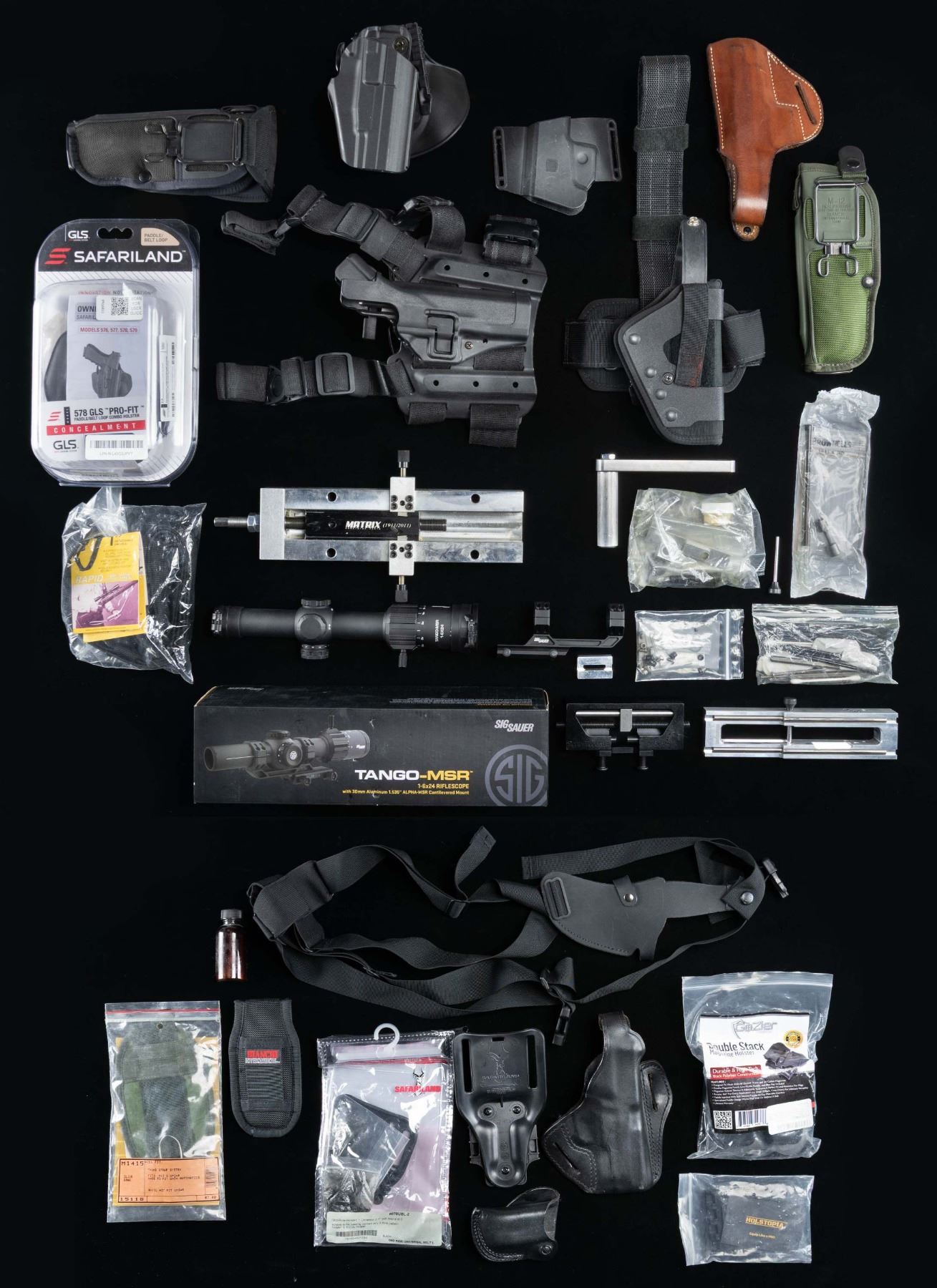 Lot of assorted firearms accessories and equipment, including: 1) Sig Sauer Tango-MSR 1-6x24mm with LPVO reticle. Aluminum construction with matte black finish. Threaded throw lever with factory lens covers. UNATTACHED ACCESSORIES: factory box containing an Alpha-MSR mount and factory paperwork. CONDITION: near new, with scope showing no visible signs of use. Box shows some handling marks, but otherwise remains sound. (02-25522/MLW). 2) Matrix 1911/2011 rail cutting jig and decking jig. Aluminum construction. Complete with assorted small parts. CONDITION: very good, with some superficial marks and scratches present overall. (02-25523 & 02-25524/MLW). 3) Sight-Tool Gen 4 sight pusher tool. Black anodized aluminum construction. Complete with box and assorted small parts. CONDITION: very good overall, with some superficial handling marks. (02-25525/MLW). 4) Assorted holsters, including: x3 black synthetic thigh holsters, x1 black rubber and nylon shoulder holster, x2 nylon Bianchi M92 holsters, x1 Safariland 578GLS Pro Fit holster, x2 (x1 black, x1 brown) leather holsters, and several assorted holster accessories. CONDITION: holsters are good, showing some scattered marks from handling and storage, but otherwise remain sound. (02-25534/MLW). NON-GUN. $250-500.