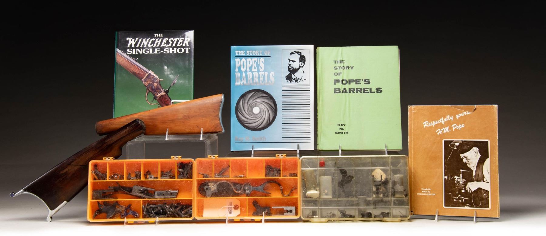 This lot consists of the following items: 1) 1892 Winchester butt stock. Nickel buttplate & screws present. CONDITION; stock has a sanded appearance with repaired crack behind upper tang channel, some staining & handling marks. 2) Straight Gripped stock. Appears to be for an 1885 Winchester or similar single shot rifle. Nickel finished Swiss style buttplate with "J.C.T." on tang. CONDITION: stock shows scattered finish loss, some flaking on buttplate small cracks, chips & handling wear. 3) Two copies of "The story of Pope's Barrels" by Ray Smith. One is missing its dust jacket & shows notable wear & crazing. 4) One copy of "Respectfully Yours H.M Pope" by Gerald Kelver. Dust jacket shows notable tears & wear. 5) One copy of the "The Winchester Single Shot a history & analysis" by John Campbell. 6) Three plastic containers of varied parts including several screws, hammers, triggers, trigger parts, one buttplate & sling swivels. CONDITION: items show varying degrees of wear & oxidation. (02-26034-6/MJC). $200-500 for lot.