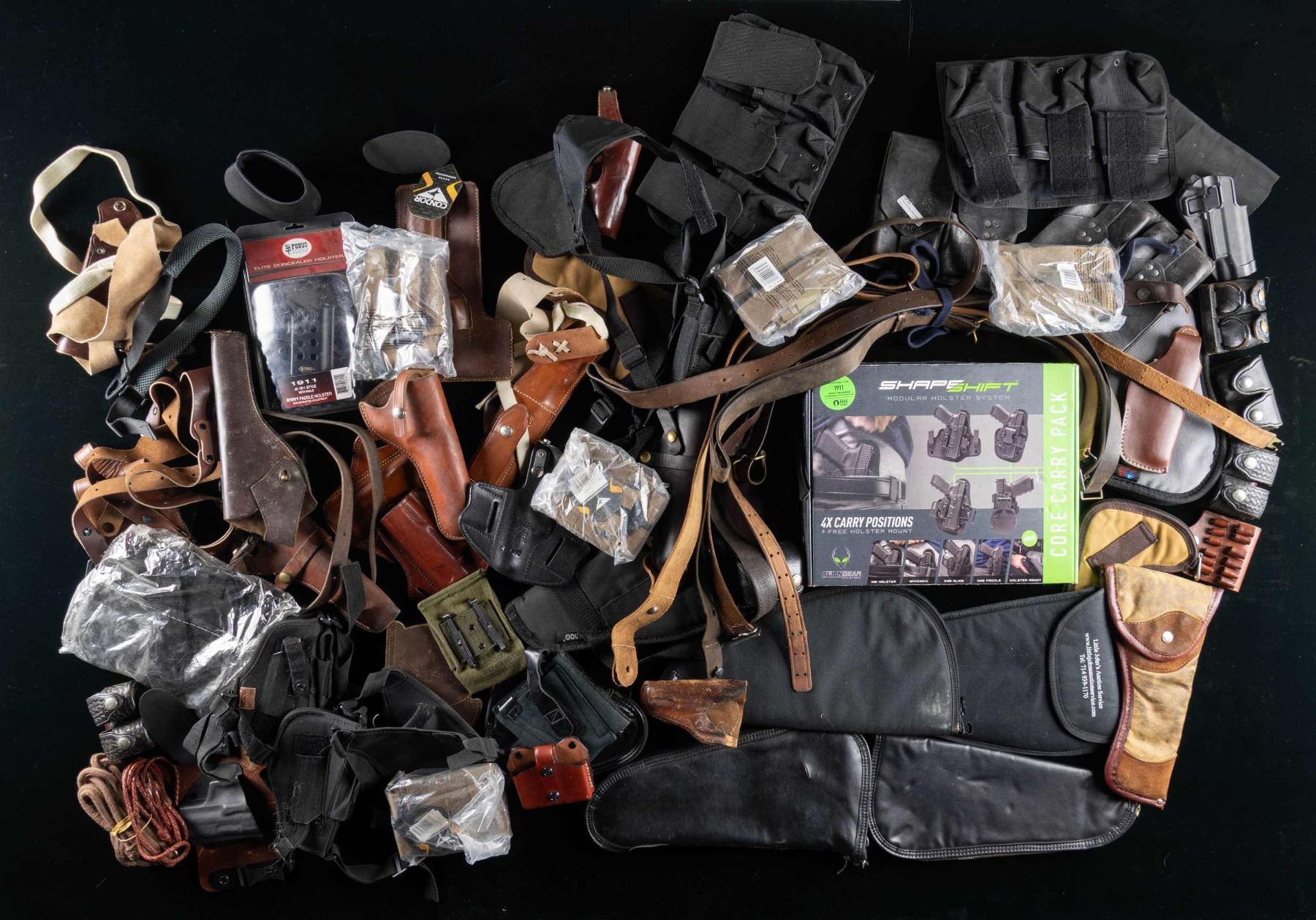 Lot of assorted holsters, slings, and accessories, including: 1) x15 assorted leather holsters. 2) x3 black synthetic holsters. 3) x3 black nylon holsters. 4) x8 assorted vintage leather slings. 5) x5 leather 2-cell revolver speed loader pouches. 6) x1 brown leather 2-cell mag. pouch. 7) x5 Condor MA23 2-cell nylon pistol mag. pouches. 8) x2 3-cell black nylon rifle mag. pouches. 9) x1 black nylon harness with x3 assorted black nylon holsters. 10) x1 custom made black leather ammo pouch. 11) x2 Austrian black leather Stolla STG-58 (FAL) mag. pouches. 12) x1 OD canvas U.S. 2-cell M1911 mag. pouch (markings on rear illegible). 13) x3 pistol lanyards (x2 fabric cord, x1 leather). (14 x1 Shooterpads slip-on recoil pad. 15) x1 Tourbon slip on elastic 10-rd. buttstock cartridge carrier. 16) x1 Bucheimer brown leather 6-rd. cartridge carrier. 17) x11 assorted handgun soft cases. CONDITION: good, with items exhibiting varying degrees of wear overall. (02-25801/MLW). NON-GUN. $200-400.