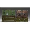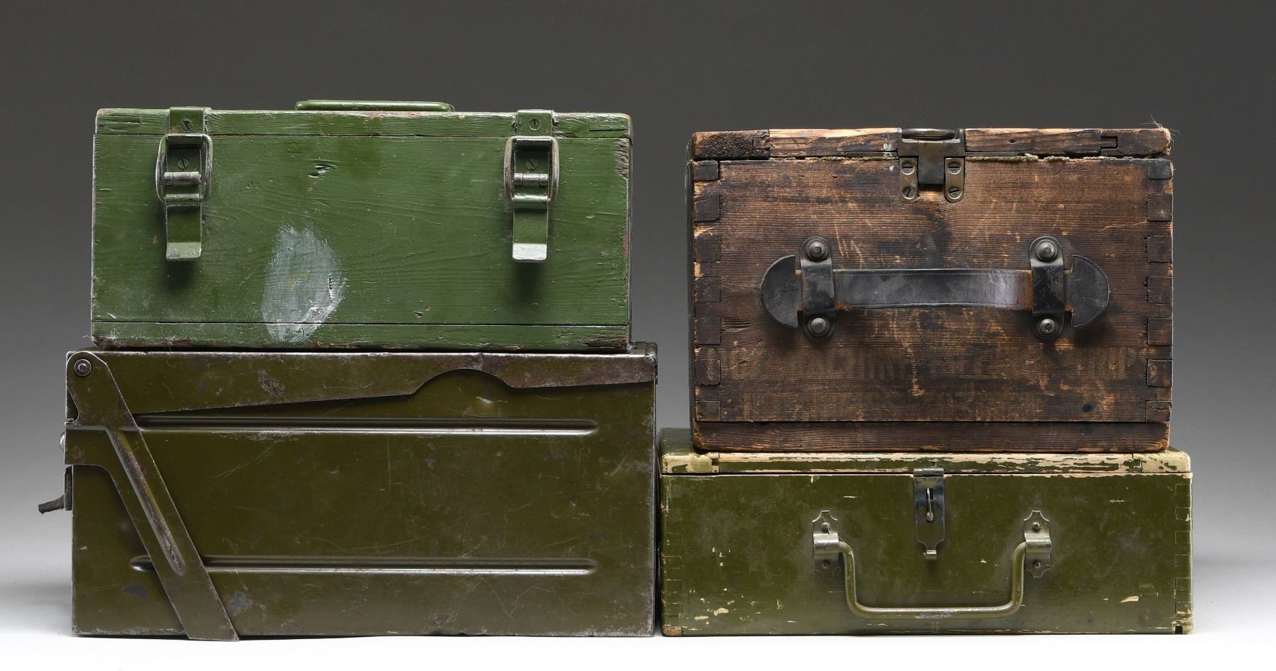Lot of assorted machine gun loaders and accessories, including: 1) 1 Belgian FN30 (M1932) machine gun linking machine with wood transit chest. Linking machine consists of the base, as well as a removable lever. Chest features a green painted exterior and is numbered "154" on the lid. CONDITION: linking machine shows some wear, but otherwise remains perfectly serviceable. Chest shows flaking to its painted exterior, as well as scattered marks from handling and storage, but otherwise remains sturdy and serviceable. 2) Czech vz.37 machine gun belt loader. Standard markings, with green painted finish. CONDITION: loader is very good overall. Exterior of integral transit chest shows some flaking to its painted exterior, scattered superficial marks from handling and storage, as well as some areas of oxidation. 3) Finnish M/26 machine gun mag. loader. Loader is housed within a green painted wood transit chest, marked with a boxed Finnish "SA" proof on the lid. CONDITION: loader shows some wear, but otherwise remains serviceable. Box shows some wear, as well as some scattered marks from handling and storage, but otherwise remains sturdy and serviceable. 4) Transit chest for a .303 British Hotchkiss ammunition strip loader. Front of chest is faintly marked "BOX MACHINE FILLING STRIPS/ HOTCHKISS 303 INCH" (remaining characters are illegible). Left panel is marked with a Crown/R proof above a broad arrow proof. Lid hinge is missing 3 screws on the interior. CONDITION: chest exhibits wear, age related discoloration, as well as some cracking and chipping overall. Lid exhibits a large crack at the center. PROVENANCE: From the Lifelong Collection of Brian Linde. (02-23926-15/MLW). $500-1,000.