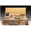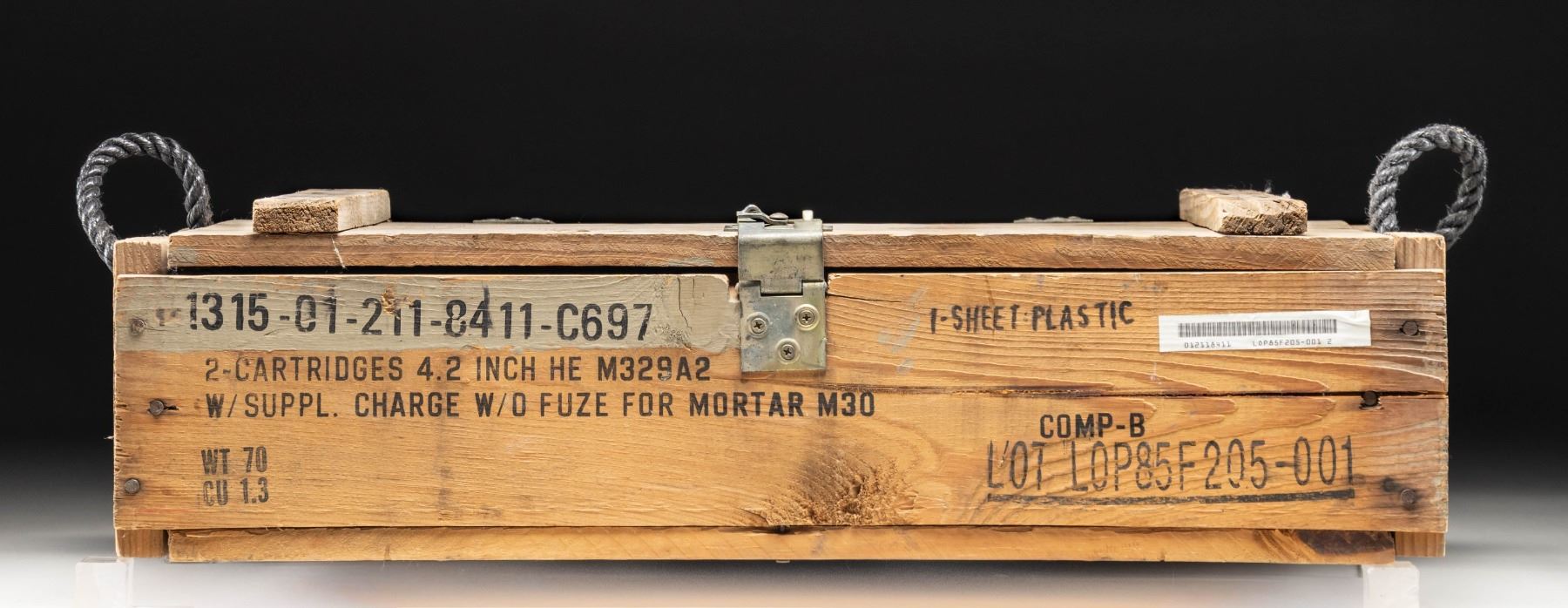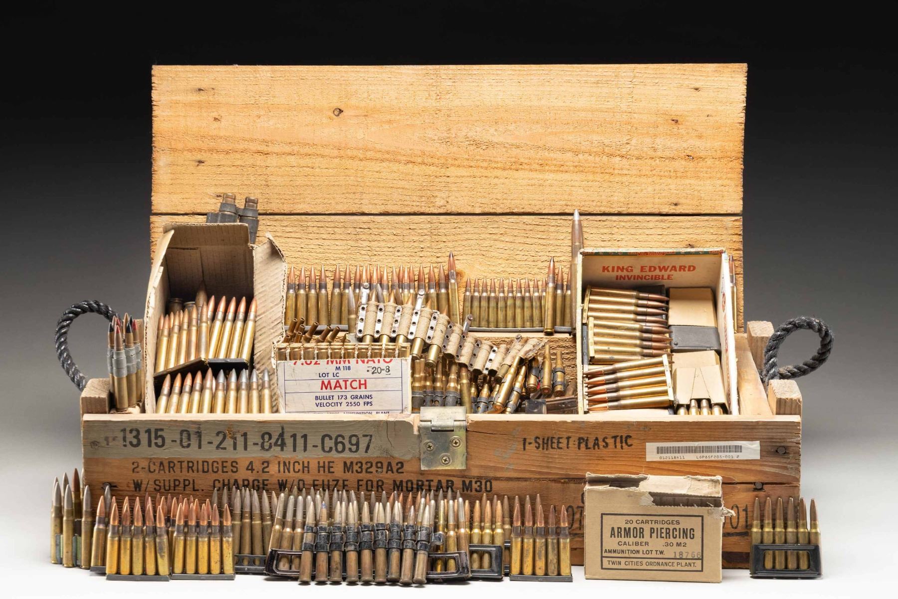 U.S. M329A2 4.2" MORTAR ROUND CRATE. Lot of assorted military caliber ammunition, including: 1) x5 6-rd. stripper clips (30-rds. total) of 7.35x51mm Carcano ammunition. 2) x2 20-rd. Breda Model 30 clips (40-rds. total) of 7.35x51mm Carcano ammunition. 3) x3 5-rd. stripper clips (15-rds. total) of 6.5x53mmR Mannlicher ammunition. 4) x3 cut sections of assorted cloth and alloy MG belts (22-rds. total) of assorted 8mm Mauser ammunition. 5) x6 5-rd. stripper clips (30-rds. total) of assorted .303 British ammunition. 6) x21 U.S. M1903 5-rd. stripper clips (x1 clip with 4-rds., 104-rds. total) of assorted U.S. .30-06 Springfield ammunition. 7) x16 8-rd. M1 Garand en bloc clips (128-rds. total) of .30-06 Springfield ammunition. 8) x8-rds. of assorted belted .30-06 Springfield ammunition. 9) x43-rds. of loose .30-06 Springfield blank ammunition. 10) x1 5-rd. stripper clip of .30-06 Springfield dummy ammunition. 11) x1 full 20-rd. box of Frankford Arsenal .30 M1 unprimed cartridge cases. 12) x1 partial box of Twin Cities Ordnance Plant .30 M2 ammunition. 13) x15 5-rd. stripper clips (75-rds. total) of assorted U.S. 7.62x51mm NATO ammunition. 14) x1 20-rd. box of Lake City Ammunition Plant 7.62x51mm NATO M118 Match ammunition. 15) x2 belts of 7.62x51mm NATO blank ammunition (x1 belt 100-rds., x1 belt 88-rds., 188-rds. total). 16) x6-rds. of belted U.S. .50 BMG tracer (red tip) ammunition. 17) x4-rds. of loose U.S. .50 BMG Armor-Piercing Incendiary (silver tip) ammunition. 18) x1-rd. of loose U.S. .50 BMG ball ammunition. 19) x2-rds. of belted U.S. .50 BMG blank ammunition. 20) x4-rds. of U.S. .50 BMG cases with ball projectiles (no powder). x1 case with spent primer. 21) x6-rds. of primed U.S. .50 BMG cases with Armor-Piercing Incendiary projectiles (no powder). 22) x11 U.S. .50 BMG cartridge cases. 23) x1 U.S. .50 BMG dummy rd. 24) x12-rds. of assorted belted .303 British ammunition. 25) x1 5-rd. stripper clip of Chinese 8mm Mauser ammunition. 26) x1 10-rd. stripper clip of U.S. 5.56x45mm NATO ammunition. 27) U.S. M329A2 4.2" 2-rd. mortar chest (contains all aforementioned ammunition). CONDITION: ammunition shows varying degrees of patina, verdigris, and oxidation, with most rds. appearing serviceable. Ammunition boxes show some tearing and losses. Chest is very good overall. PROVENANCE: Norman Olliff Estate. (02-25701/MLW). AMMO. $200-300.