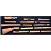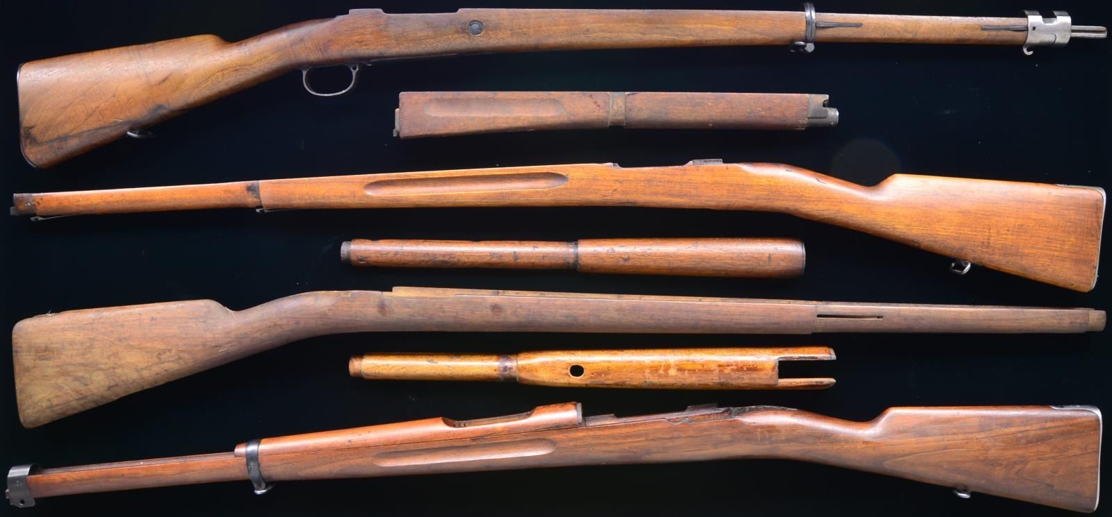 This lot consists of 19 assorted military stocks & 22 various military forends. 1. the first stock is from a Chinese SKS. This stock retains its buttplate & rear sling swivel. The stock was sanded at some point, it shows a crack in the bayonet channel, some handling marks & dings. The buttplate shows oxidation. 2. the second stock is from an FN49 sniper rifle (Likely Luxembourg contract) & numbered 2730 w/ English numerals. The top of the comb is cut for a cheekpiece. The stock was sanded, the wrist has long cracks on both sides, otherwise the stock shows scattered dings & handling marks. 3-4. the other FN-49 stocks appear unmarked. One stock has no recoil lug or provision for a recoil lug. This stock has a rear sling swivel but no other metal hardware. The other stock has a recoil lug & buttplate but no other metal parts. CONDITION: one stock has the remnants of a sticker, both stocks show some dings & handling marks from the years. 5-6. the fifth & sixth stocks are for a Persian M98/29 Mauser. One is walnut w/ both bands, a rear sling swivel, stock disc & recoil lug. The other is a beech stock that has both bandkeepers, bayonet lug, stock disc & buttplate. The beech stock has a crack behind the upper tang, both stocks show scattered dings & handling marks. The metal parts of the walnut stock show scattered oxidation. 7-8. the seventh & eighth stocks are for the Swedish M96 Mauser. One includes both bands, bandkeepers, buttplate, stock disc, sling swivels & handguard. The other stock has the buttplate, rear sling swivel & both bandkeepers. One stock shows a few small cracks behind the upper tang, otherwise the stocks show dings & handling marks. 9. the ninth stock is a for a Chilean 1935 short rifle. This stock retains its buttplate, stock disc, rear sling hardware, bandkeeper & recoil lug. The stock shows scattered dings & handling marks. 10. the tenth stock is a stripped Brazilian 08/34 stock. This stock appears sanded w/ a couple cracks near buttplate, scattered dings & handling marks. 11. the eleventh stock is a Brazilian 1908 stock w/ rear sling plate, stock disc, bandkeepers, buttplate, & bayonet lug. This stock shows a thin crack ahead of buttplate, scattered dings & handling marks. 12. the twelfth stock appears to be for a VZ-24 variant. No metal hardware is present & the stock looks to have been sanded. This stock shows a few chips, some dings & handling marks. 13. the thirteenth stock is for an Argentine 1891 appears to have been shortened & includes a buttplate. It has a faint cartouche & looks lightly sanded. This stock shows staining & handling wear. 14. the fourteenth stock is a stripped full length Argentine 1891 rifle stock. This stock was sanded & shows a faint Argentine cartouche. This stock shows scattered staining, dings & handling wear. 15. the fifteenth stock is for an unknown Mauser short rifle. It has no metal parts & is in pistol grip configuration. The stock appears sanded, it shows scattered dings & handling marks. 16. the sixteenth stock is an unmarked 93/95 Mauser style stock w/ a later H style front band, bayonet lug, rear band, bandkeepers, buttplate, both sling swivels, recoil lug, floorplate & triggerguard. The stock shows some dings & handling marks. The metal parts show oxidation w/ the front band being cleaned to bright. 17. the seventh stock is a postwar MAS-36 beech buttstock. This stock includes the sling bar & buttplate but it is missing the top buttplate screw. The stock shows dings & handling marks. 18-19. the last two stocks are stripped beech 93 style Mauser stocks w/ cutouts for recoil lugs. This stocks show scattered dings & handling marks. The forends & handguards include an Israeli FAL, 1895 Winchester, No. 4 Enfield, MAS-36, Swedish Mauser, Hakim & M1 Garand. These items vary in condition from fair to very good. (02-16809-6/MJC). $300-500.