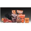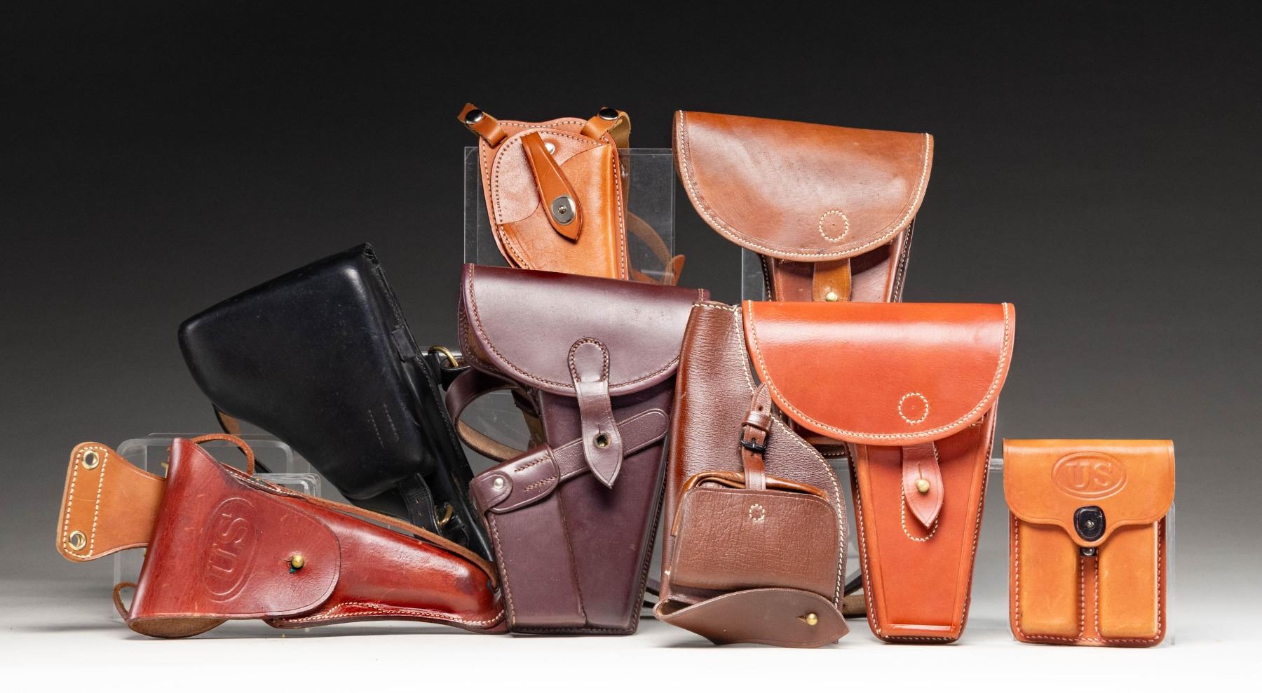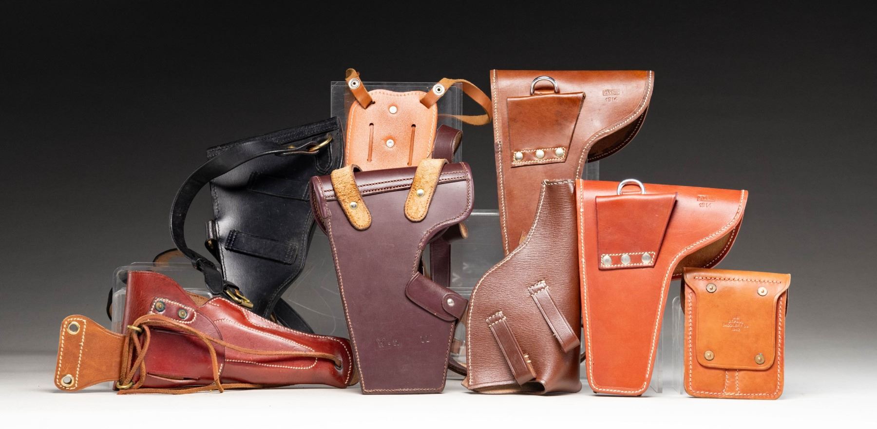HOLSTERS. Lot of assorted reproduction WWI / WWII era military holsters, consisting of: 1) Reproduction Danish Bergmann Model 1910/21 holster. Black leather construction with brass fittings and toe. Complete with black leather shoulder strap. CONDITION: very good overall, with leather remaining malleable. Some brass fittings have begun to acquire scattered spots of verdigris. 2) Reproduction Austrian Roth-Steyr Model 1907 holster. Brown leather construction with steel fittings and brass closure flap stud. Rear is marked with an Austrian military style "W-n 11" acceptance proof. Complete with riveted brown leather shoulder strap. CONDITION: very good, with leather remaining malleable. 3) x2 reproduction Austrian Steyr-Hahn Model 1912 holsters. Brown leather construction with steel fittings and brass closure flap studs. Rear of holsters are stamped with a boxed "STEYR" over "1914". CONDITION: very good, with leather on both holsters remaining malleable. 1 holster shows some slight wear, but otherwise remains very good. 4) Reproduction Imperial German Model 1883 Reichsrevolver holster. Brown leather construction with brass closure strap stud. CONDITION: very good, with leather remaining malleable. 5) Reproduction / contemporary production Walther Model PPK shoulder holster. Brown leather construction with steel fittings. Complete with brown leather shoulder strap. CONDITION: very good, showing some light wear and with leather remaining malleable. 6) Reproduction U.S. Model of 1916 M1911 holster. Brown leather construction with brass fittings. Closure flap is embossed with "US" within an oval. Complete with leather thong, as well as brass & leather hanger assembly. CONDITION: good, with leather remaining malleable. Holster shows some scattered handling marks, with some age related cracking present on the closure flap. Some brass fittings exhibit build ups of verdigris. 7) Reproduction U.S. M1911 2-cell mag. pouch. Brown leather construction with steel and brass fittings. Closure flap is embossed "US" within an oval, with "U.S./ ST.PAUL/ SADLERY CO./ 1942" marked on the rear of the belt loop. CONDITION: very good, with leather remaining malleable. (02-25800/MLW). NON-GUN. $300-700.