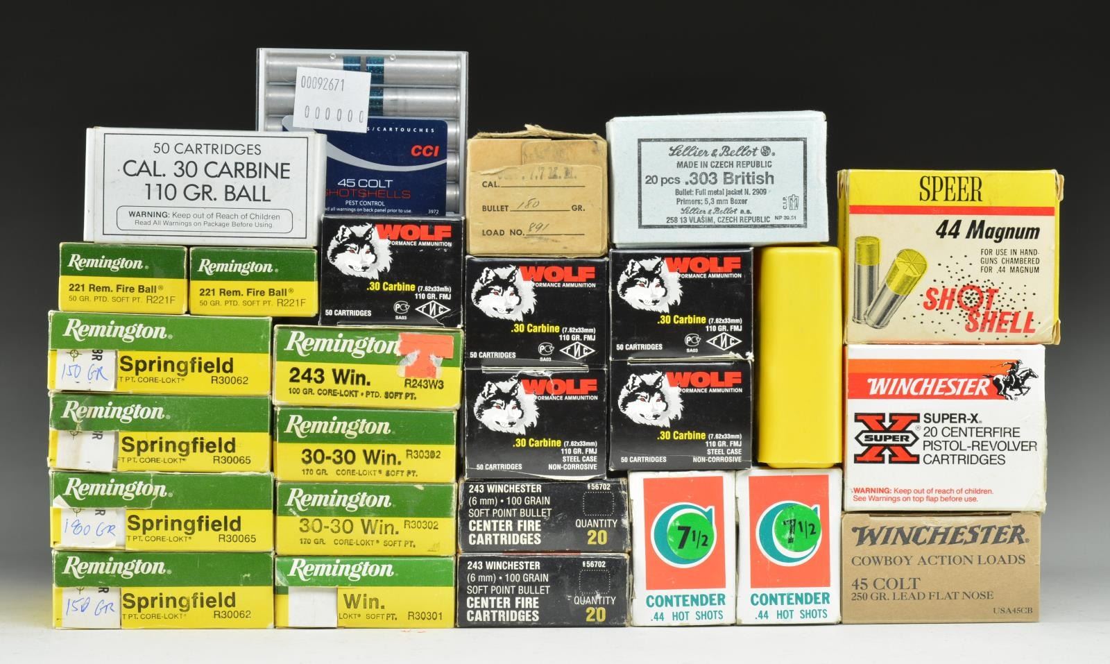 RIFLE AMMO: 4 boxes Rem. 30-06; 2 of 180 gr. PSP & 2 of 150 PSP (both in relabeled boxes). / 3 boxes Rem. 30-30; 2 (1 rd. missing) of 170 gr. SP & 1 (relabeled box) of 150 gr. SP. / 3 1/2 boxes 243 Win.; 2 1/2 of Sears 100 gr. SP & 1 1/5 of Rem. 100 gr. PSP. / 1 box Sellier & Bellot 303 British FMJ. / 16 rds. 7.7 Jap commercial reloads 180 gr. SP. / 6 boxes 30 Carbine 110 gr. FMJ; 5 of Wolf steel cased & 1 of Winchester brass cased.