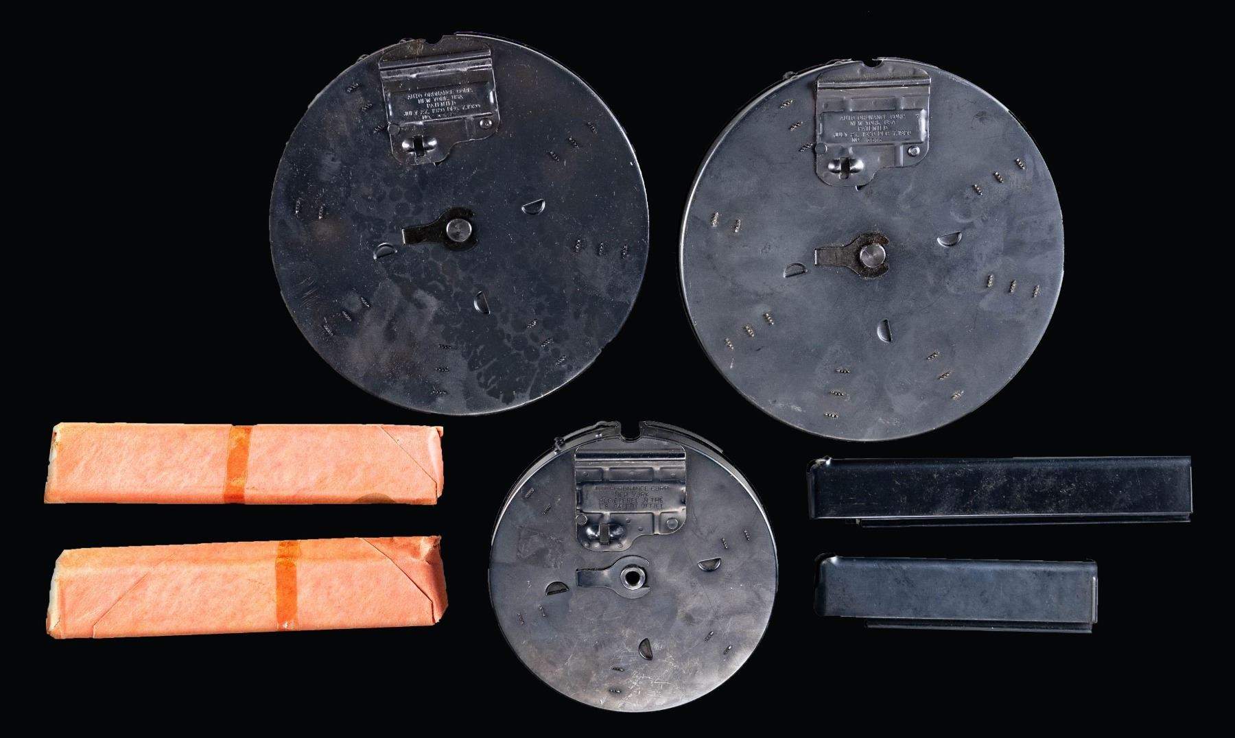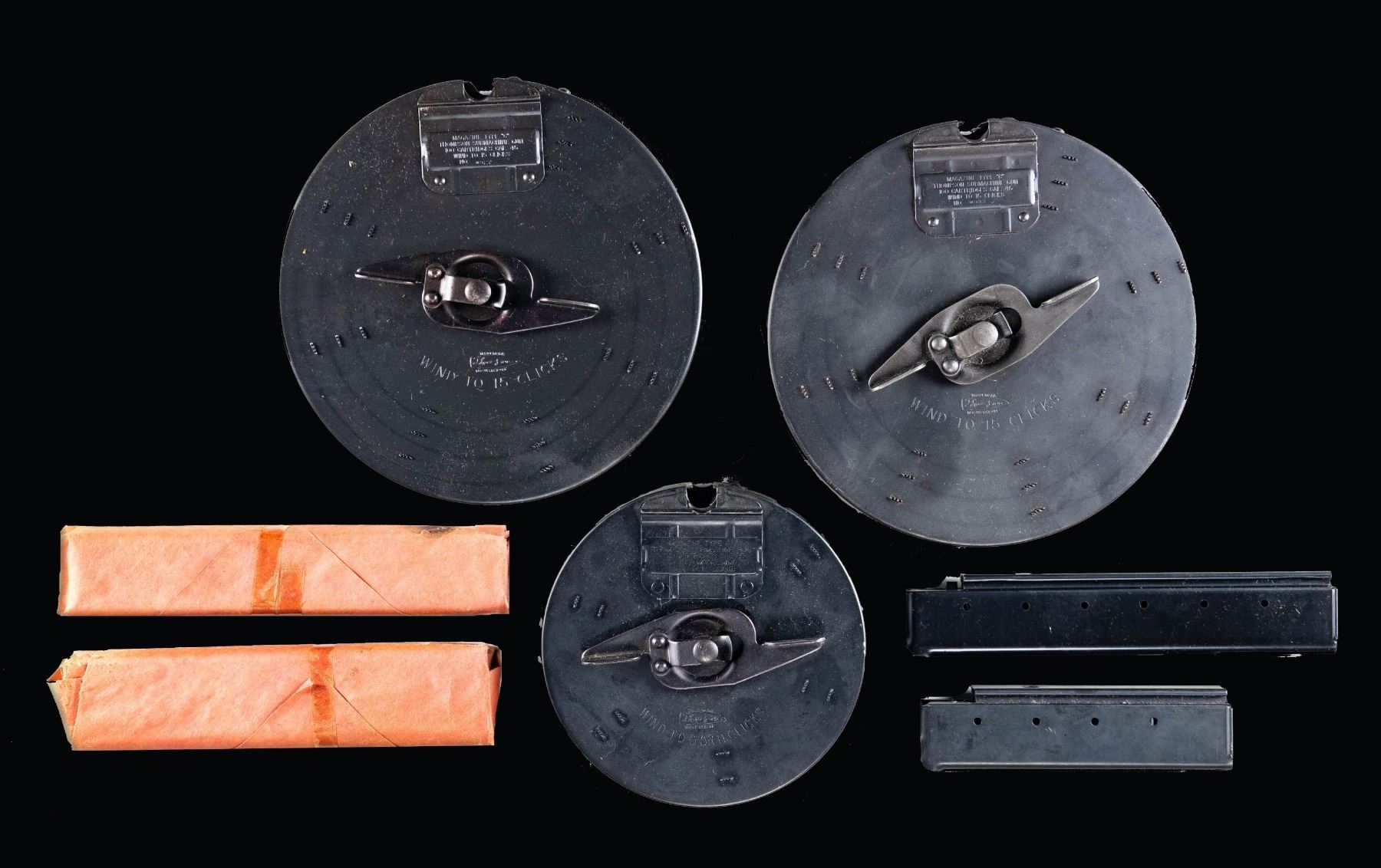& DRUM MAGAZINES. Lot of assorted Thompson submachine gun stick and drum mags., including: 1) x3 arsenal wrapped Thompson 30-rd. mags. 1 mag. has been opened, indicating mfg. by Seymour Products Co. and blue finish. x2 mags. remain sealed in their protective paper packaging. 2) x1 unmarked Thompson 20-rd. mag. body (follower and spring are absent). Dull blue finish. 3) x1 contemporary Auto-Ordnance Thompson 50-rd. "L" drum. Blue finish with standard later production Auto-Ordnance markings. 4) x2 Auto-Ordnance West Hurley 100-rd. "C" drums. 1 serialized "0933" and the other "0927". Mags. and sideplates are matching. Drum S# 0927 is complete with its factory box. CONDITION: arsenal wrapped 30-rd. stick mags. are as new, retaining virtually all of their original factory blue finish. "L" drum and "C" drum (S#: 0933) retain the majority of their original factory blue finish, showing some superficial handling marks overall. "C" drum (S#: 0927) is near new, with a few light superficial handling marks. Box closure flaps are torn on one side, but box otherwise remains sound. (02-25384/MLW). NON-GUN. $300-500.