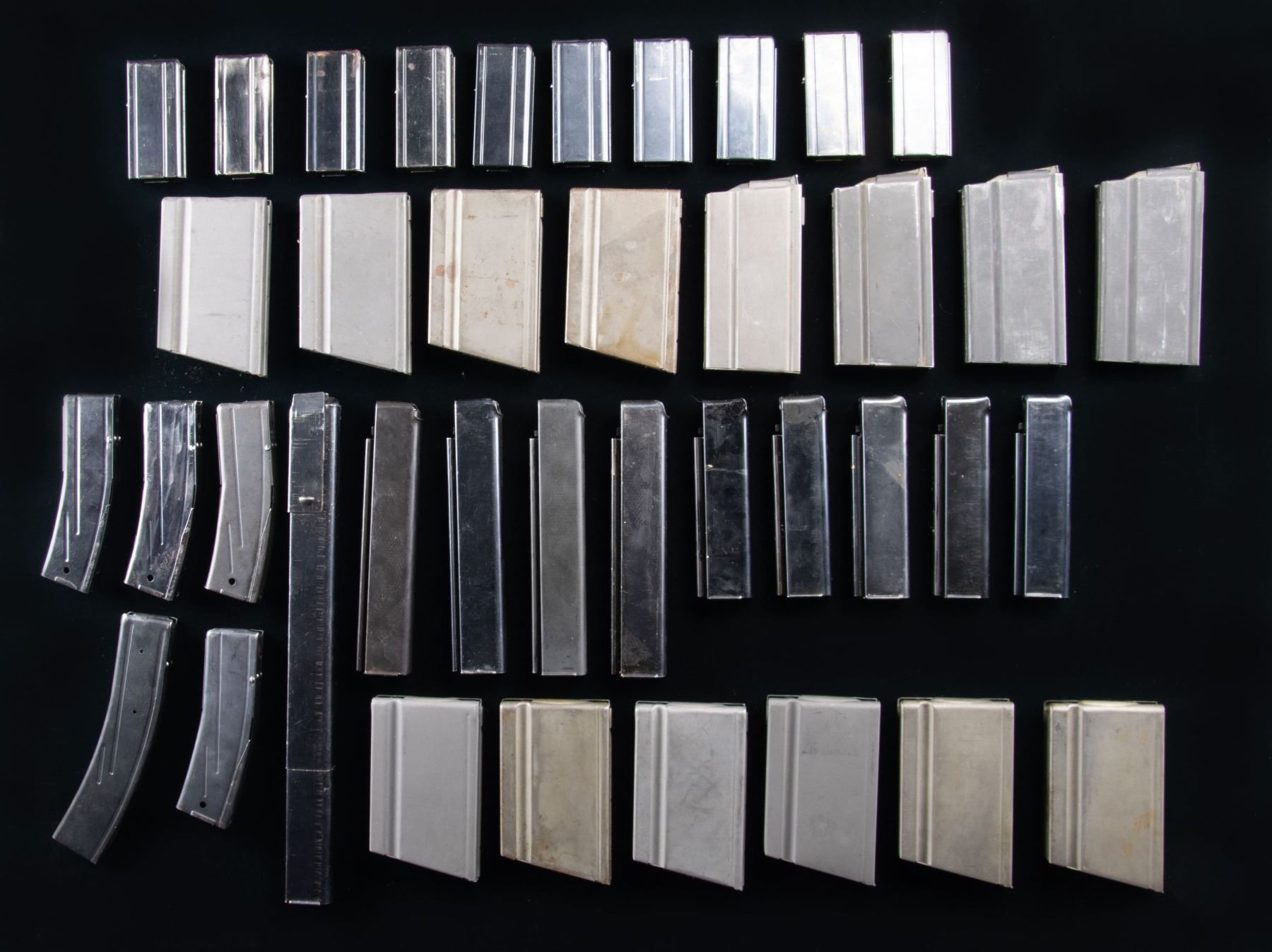Lot of assorted U.S. machine gun mags., including: 1) x4 Thompson 20-rd. mags. x1 Seymour, x3 Auto Ordnance, x1 Crosby. Steel construction with blue finish. 2) x4 Thompson 30-rd. mags. x2 Seymour, x1 Crosby, x1 unmarked. Steel construction with blue finish, save for 1 Seymour mag. which exhibits a parkerized finish. 3) x10 1918 BAR 20-rd. mags. x7 marked with "A" mfg. code on floorplates, x3 with "SLY" mfg. code on floorplates. Steel construction with parkerized finish. 4) x4 M14 20-rd. mags. x2 "C.M.T." marked, x1 "BRW/ S-I" marked, x1 unmarked. Steel construction with parkerized finish. 5) x10 M1 Carbine 15-rd. mags. x2 marked "U", x2 marked "BW", x1 marked "G-Q", x1 marked "UQ", x1 marked "IU", x1 marked "K.I." (upside down), x1 marked "S.I.", x1 marked "MN". 6) x4 M1 Carbine 30-rd. mags. x1 marked "AYP", x1 marked "M2", x1 marked "MADE IN/ U.S.A.", x1 unmarked. Steel construction with blue finish. 7) x1 unmarked M1 Carbine 40-rd. mag. Steel construction with blue finish. 8) x1 extended M3/M3A1 "Grease Gun" mag., notched on rear for M10 compatibility. Steel construction with blue finish. CONDITION: mags. show varying degrees of wear, with several showing scattered spots of oxidation and pitting. Otherwise mags. all appear serviceable. $500-800.