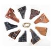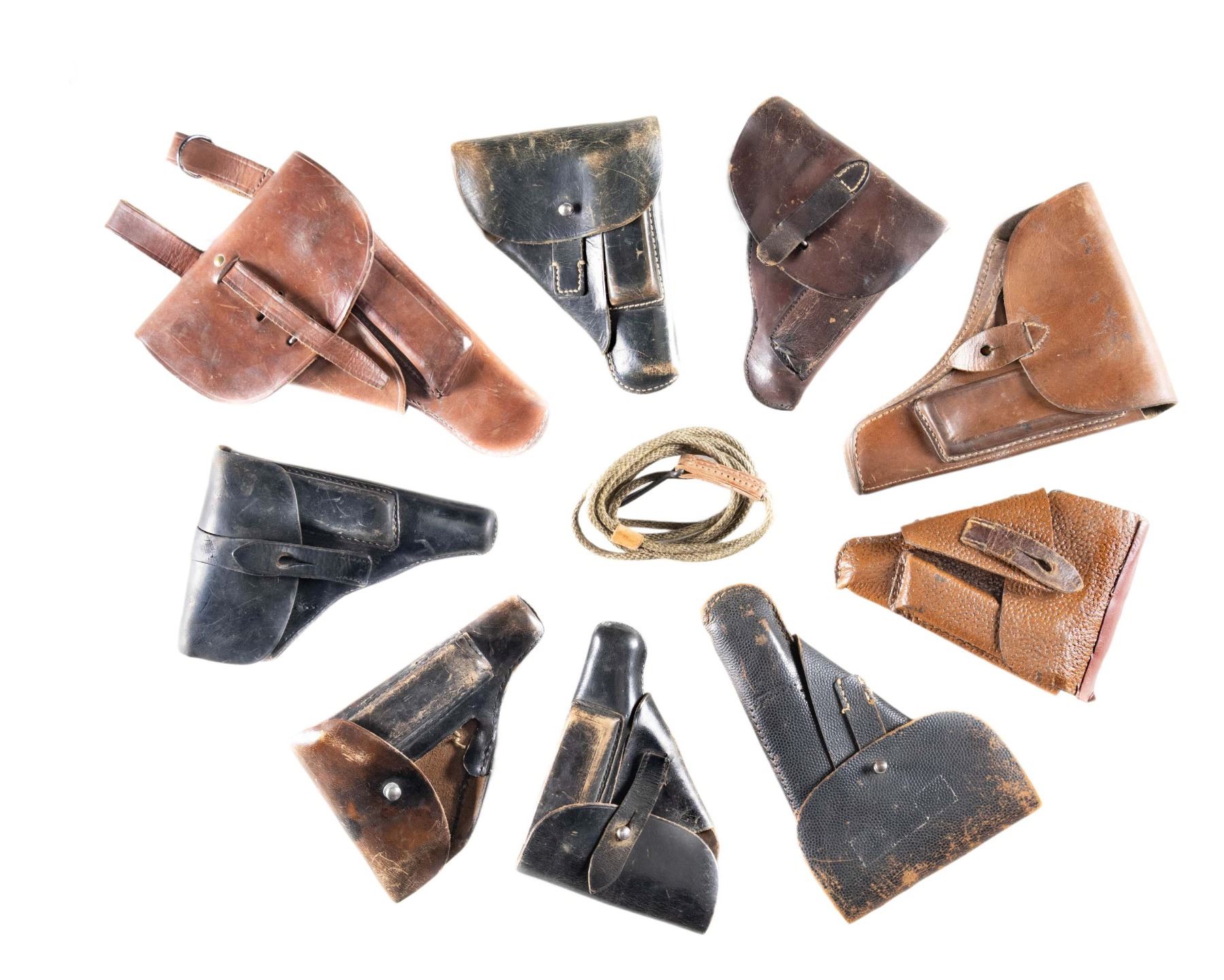 Lot of assorted World War II era European holsters, including: 1) Rare German WWII Walther Model PP / PPK Ersatz holster. Holster is unmarked and is comprised of textured brown laminated paper on the body, closure flap, break away flap, mag. pouch, and belt loop. Closure flap strap is comprised of brown leather. CONDITION: holster shows light overall wear, with some delamination. Closure flap has torn/broken at the upper edge, having been reinforced with a glued brown leather strip on the interior and exterior, both of which have started to come free. Leather closure flap strap shows age related cracking and crazing, but otherwise remains malleable. 2) P.38 brown pebble grain leather holster mfg. by Carl Busse in 1944. Rear of holster is marked with the mfg. and single digit year of mfg. "jfk/ 4". Interior of closure flap is marked with an mostly illegible name above an apparent gun S# "84643". Mag. pouch has been removed. CONDITION: holster remains malleable, exhibiting areas of age related cracking and crazing overall. Stitching on left side of closure flap strap has broken free. 3) German police marked FN Model 1922 black leather holster. Rear of holster is marked with a boxed German police "Pol.Hbg.", followed by "1018", indicating issue to the Hamburg police. Holster contains x1 FN 1922 9-rd. blued steel mag. CONDITION: leather remains malleable, exhibiting scattered marks from handling and storage, with some areas of light age related cracking and crazing. 4) Rare Walther Model PP black leather holster. Interior is ink stamped "Walther/ P.P." beside a boxed "RBD ERFURT/ Bahnschutz", indicating issue to the Reichsbahn Deutschland (Railway Service). CONDITION: leather remains malleable, exhibiting scattered handling marks, with some areas of age related cracking and crazing. Markings on interior remain clear and legible. 5) Brown leather Walther Model PP holster mfg. by Gustav Genschow in 1944. Holster is marked with the mfg. code and 2-digit year of mfg. "jhg/ 44" on the break away flap, beneath the closure flap strap. Interior of holster exhibits a handwritten "G. SeiBOLD/ 37486252/ ATCo-324 Inf./ APo/ 44". CONDITION: leather remains malleable, exhibiting scattered marks from handling and storage, with varying degrees of age related cracking and crazing present overall. 6) Brown leather Walther Model PP holster. Break away flap has been removed. No markings present. CONDITION: leather remains malleable, exhibiting scattered handling marks, with varying degrees of age related cracking and crazing overall. 7) Brown leather post-war French MAC Mle 1950 holster. Interior is marked with a boxed "WAREIN/ LILLE (NORD)" in black ink. CONDITION: leather remains malleable, exhibiting scattered marks from handling and storage. 8) Apparent brown leather Italian Model 1934/1935 holster. Holster is unmarked. CONDITION: leather remains malleable, showing scattered handling marks and areas of age related cracking and crazing. 9) Brown leather Yugoslavian M57 (TT-33) holster. Rear of holster is stamped "5-00.000". CONDITION: leather remains malleable, exhibiting some scattered marks from handling and storage, with some spots of light crazing. 10) U.S. M1911 lanyard strap mfg. by Hickok in 1943. CONDITION: good, with age related discoloration. (02-25798/MLW). NON-GUN. $500-800.